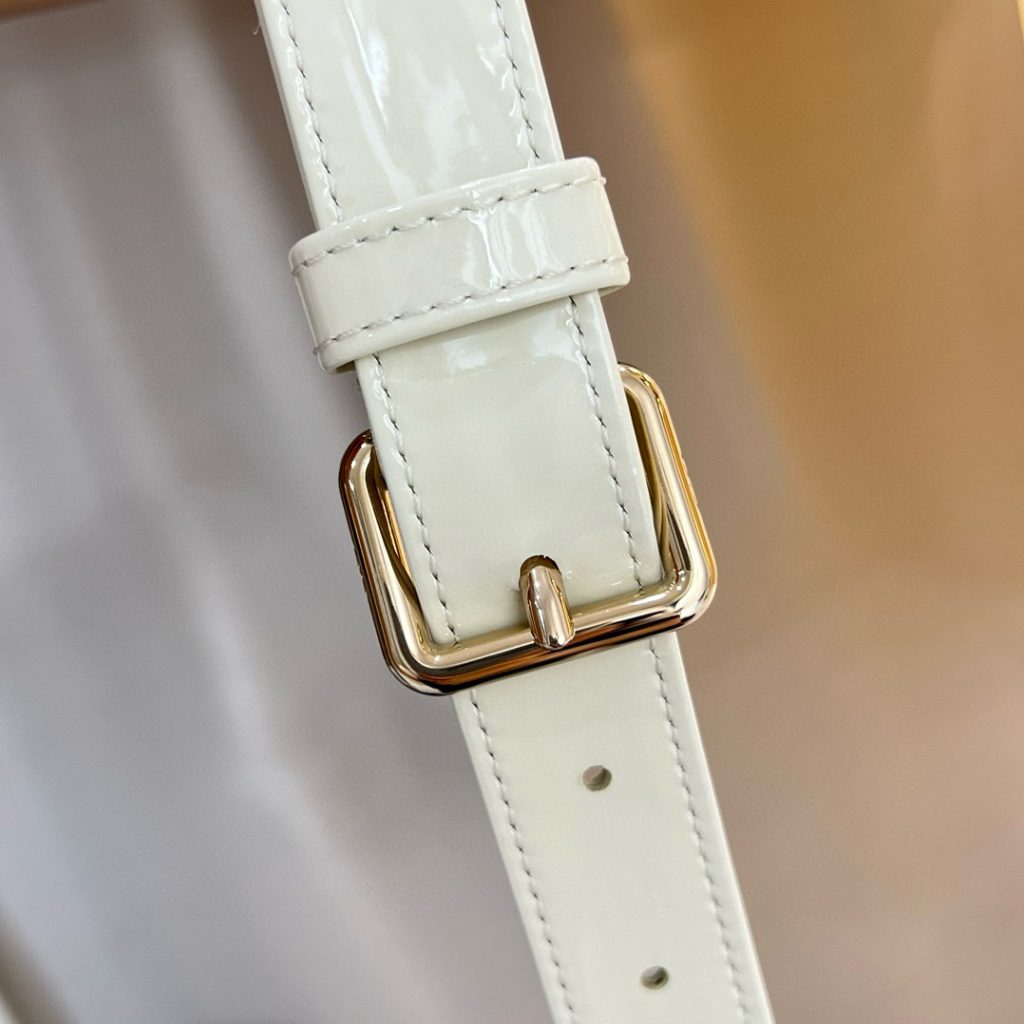 This is the upgraded version with all-around enhancements. Patent leather, known for its durability, gives the bag a firm and structured shape. It shines brilliantly under sunlight, adding a touch of glamour to any outfit. Its easy maintenance and resistance to dirt make it a practical yet stylish choice. The white color exudes elegance and sophistication, making it a perfect accessory for any occasion.