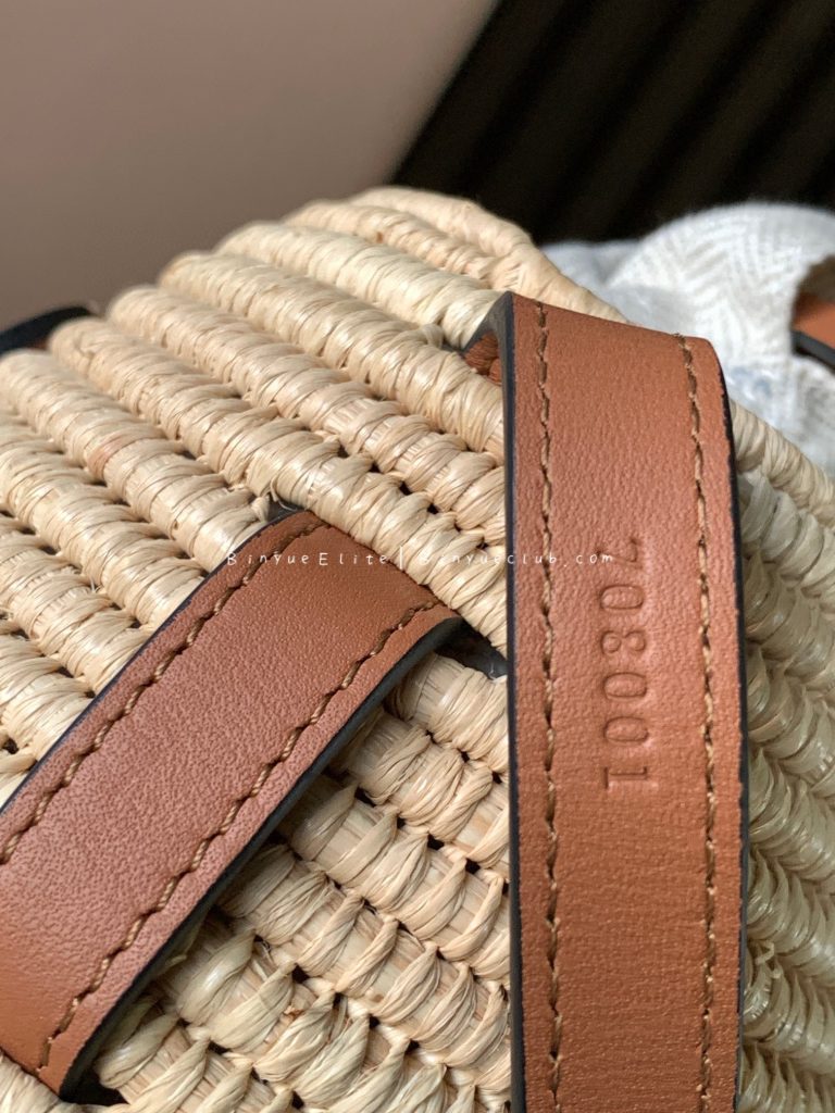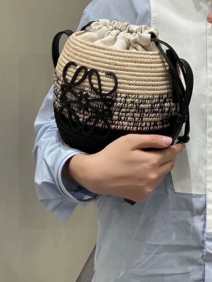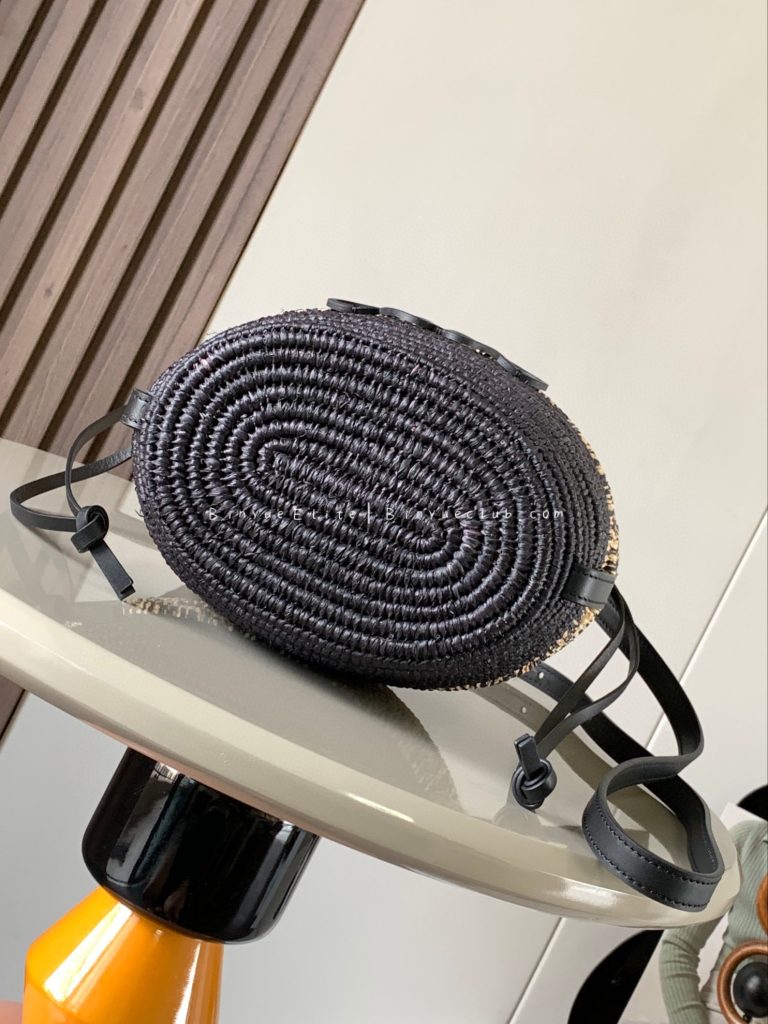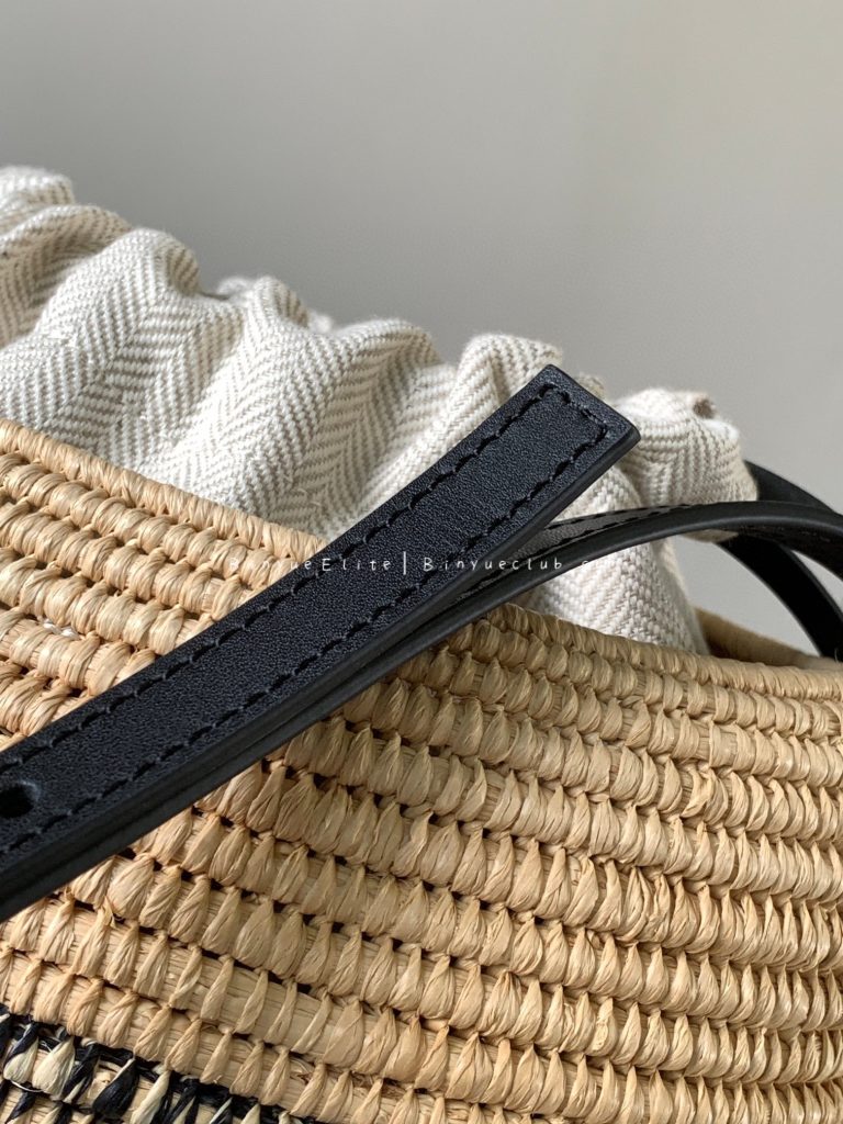 This version is crafted from wine coconut leaf fibers and cowhide leather, featuring a built-in drawstring pouch. The front is adorned with cowhide leather Anagram embroidery. Unlike the previous single-shoulder woven bag, this one can be worn crossbody or single-shoulder style, with a spacious and accommodating capacity. It can easily hold items such as a phone, lipstick, compact powder, tissues, keys, wallet, and even a power bank and hand cream. It comes with a non-detachable inner pouch for more convenient organization.
