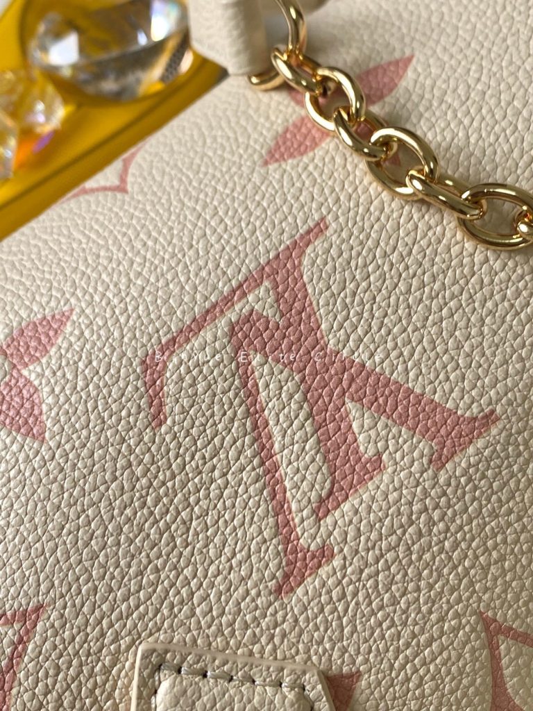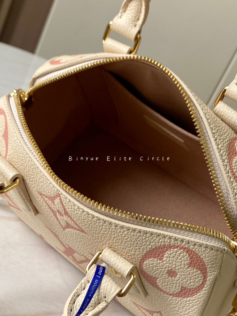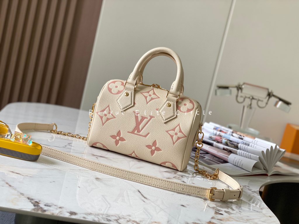 Crafted from dual-tone Monogram Empreinte leather adorned with LV logos and Monogram floral patterns, this Speedy Bandoulière 20 handbag is a modern classic. Inspired by the Speedy travel luggage series from the 1930s, it recreates the original design and hinged handles. It comes with a leather and metal chain shoulder strap for convenient shoulder and crossbody carrying.