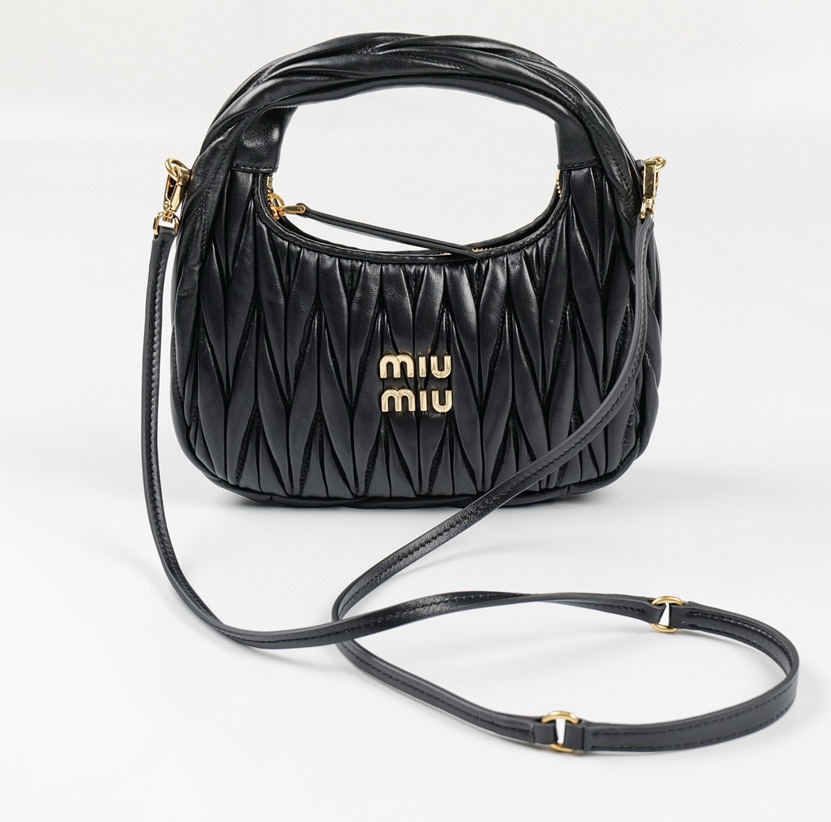 π€ Fashion legend, charm blossoms. Miu Miu Wander lambskin Hobo Mini handbag in black, showcasing ultimate luxury and personal charm.