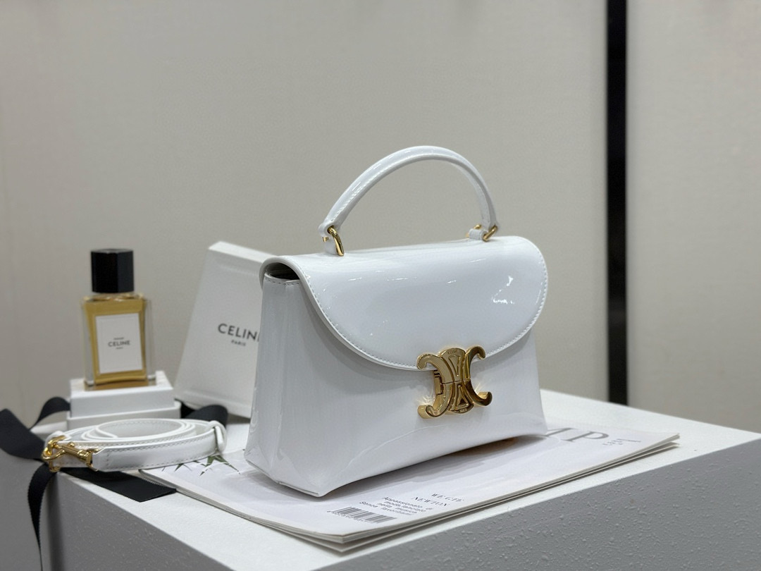 Made from imported original white patent calf leather with a lambskin lining, TRIOMPHE metal lock, the patent leather has an exceptionally beautiful texture, elegant and grand. It can be carried by hand, on the shoulder, or across the body.