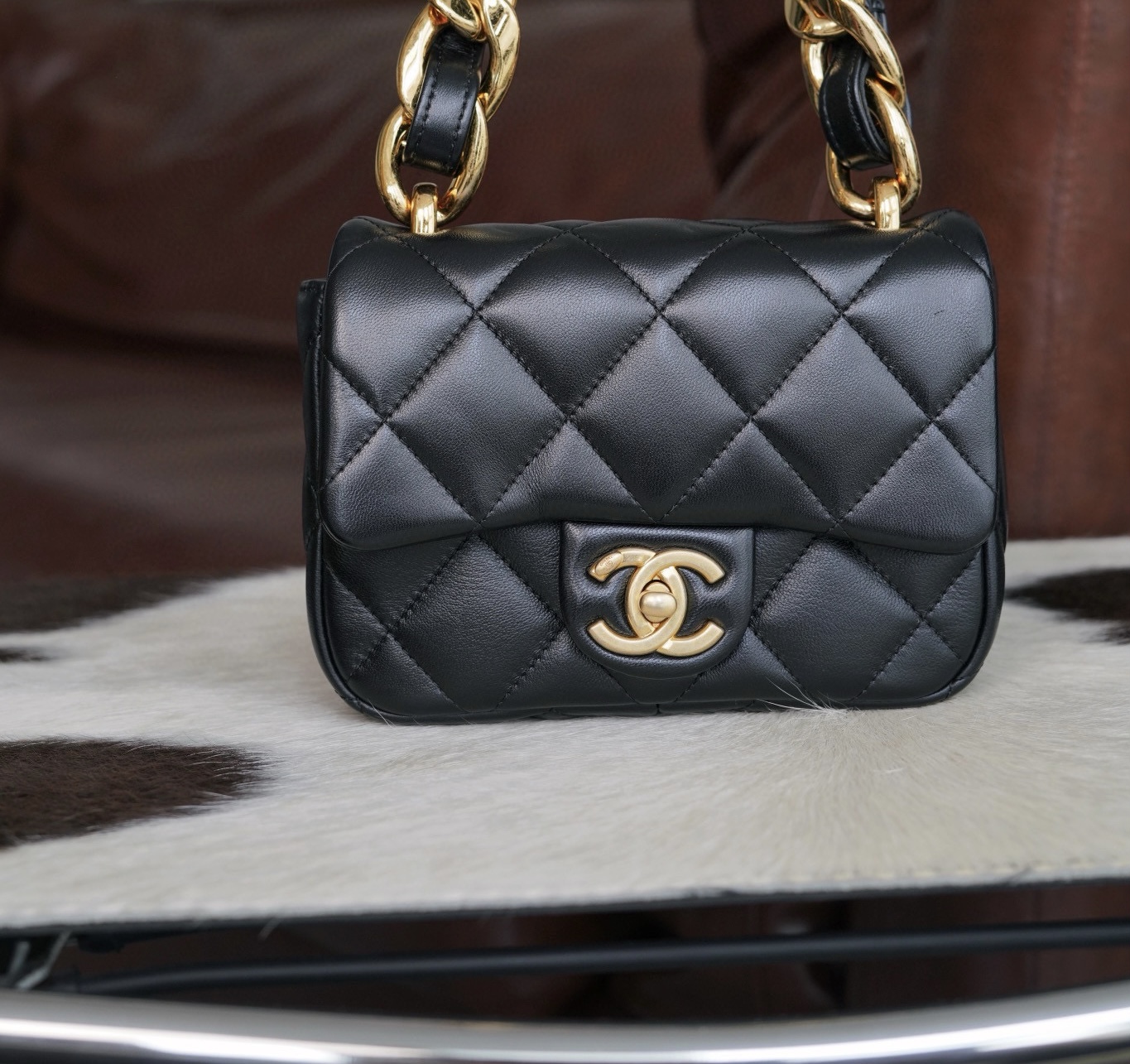 Channel 22s Spring/Summer Runway Chunky Chain Shoulder Bag, made from Italian genuine lambskin, soft and smooth with delicate pores. The black and gold color scheme is timelessly divine, ultra-classic, and versatile with a vintage yet contemporary appeal. It can be carried by hand or worn on the shoulder, truly chic.