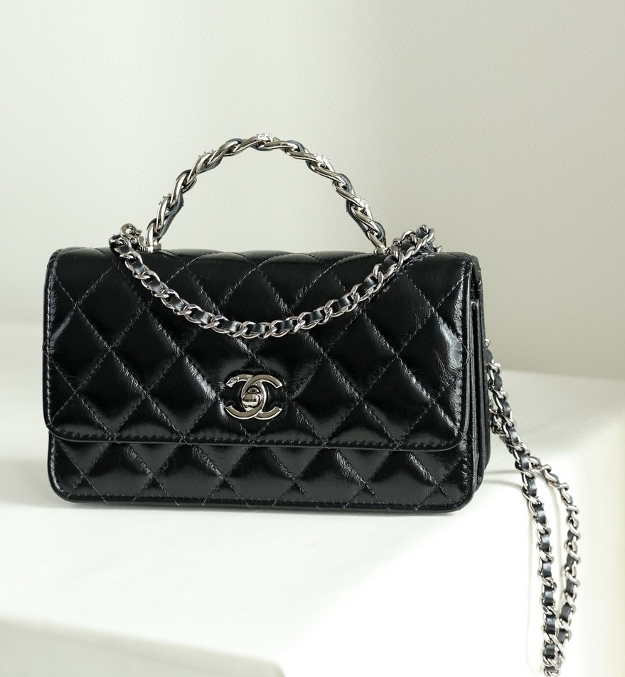 This bag is really hard to find at the counter and is on many people’s wishlists. Made of original waxed calfskin, it’s durable and shiny, complemented by the black and silver clasp, giving it a high-end yet understated feel. The sporadic rhinestones on the leather chain handle are a charming touch!
