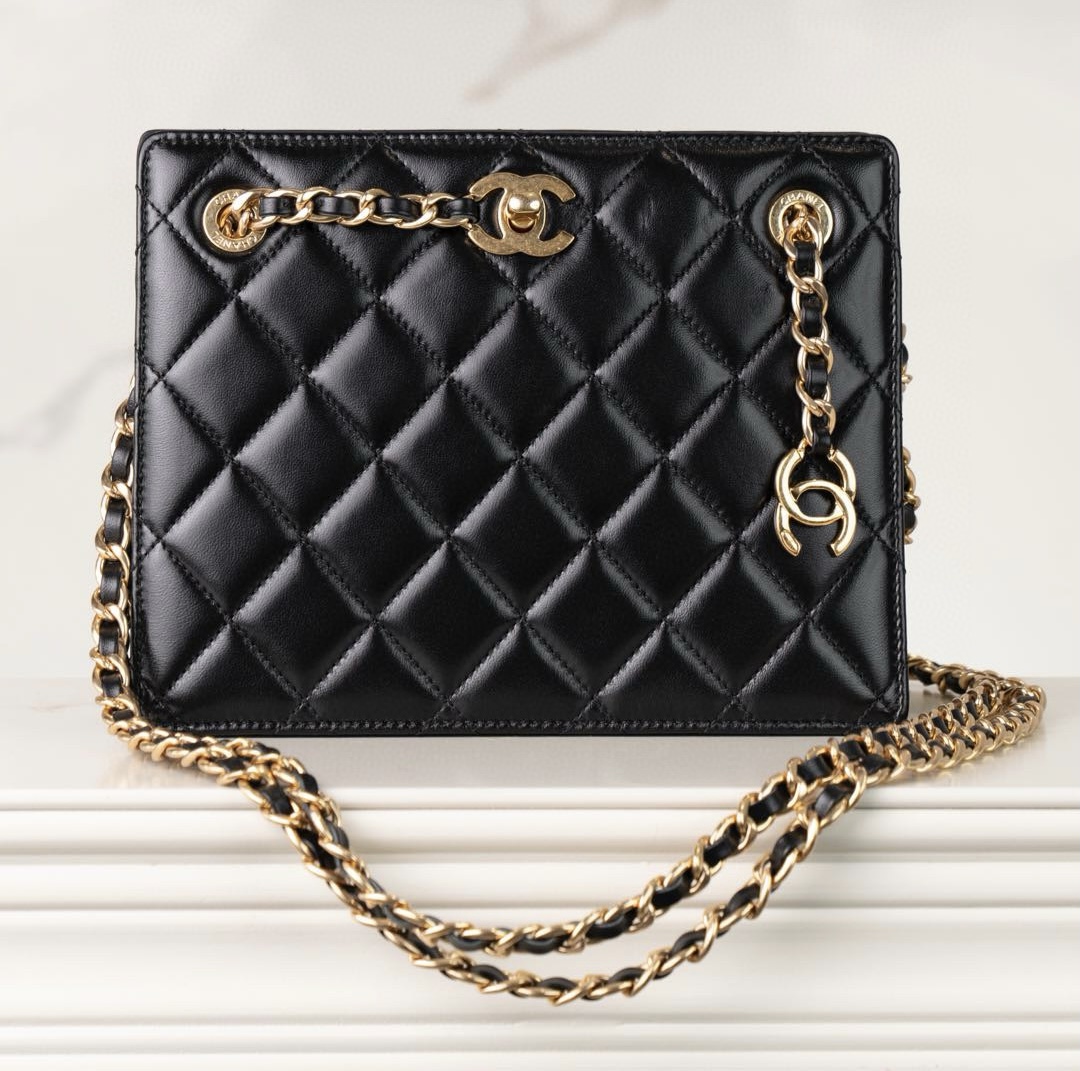 A hidden gem from the runway makes a stunning appearance: a square vintage-inspired bag with a unique clasp. The double Cs hanging on one side add a touch of vintage charm, a detail I really love. It can be worn in two ways: over the shoulder for an elegant look or as a clutch for an incredibly powerful presence. It feels like you’re ready to conquer any room!