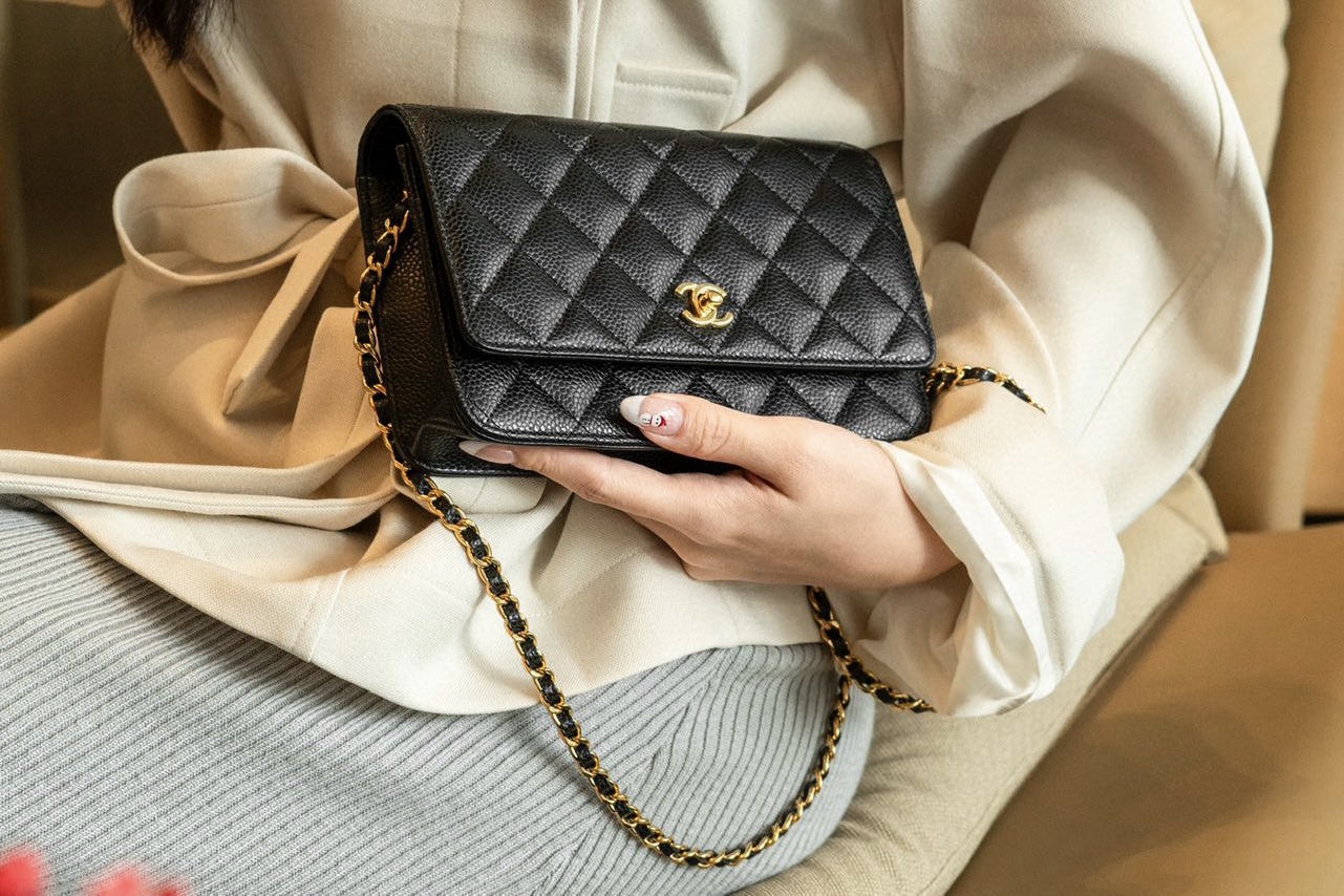The appearance is the same as the classic WOC but with a fantastic upgrade! The difference lies in the opening and closing method of the double C logo. The original magnetic snap has been upgraded to a rotating button! The rotating closure provides a greater sense of security. Moreover, the double C logo is larger than that of the classic version, making it look more sophisticated and upscale. The black gold caviar haas leather is durable, and the interior is the same as the classic WOC. This bag is a great choice for beginners.