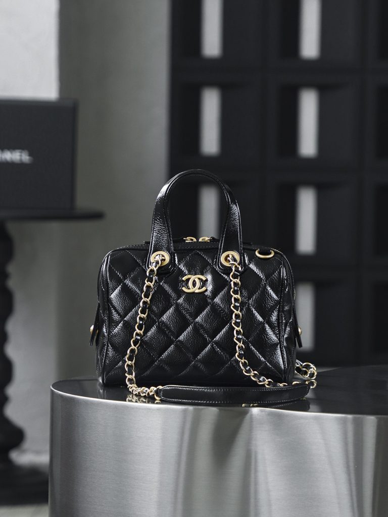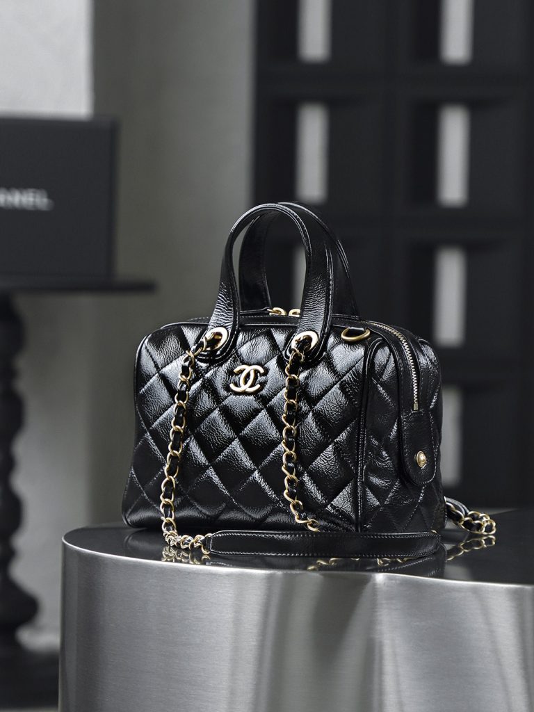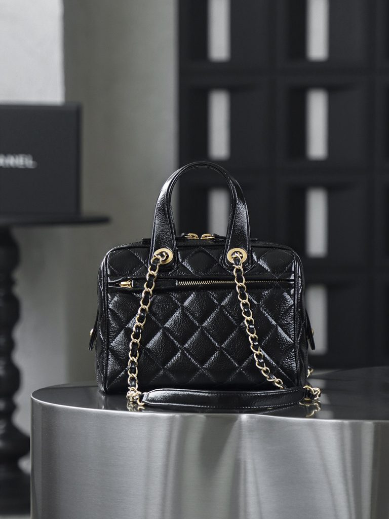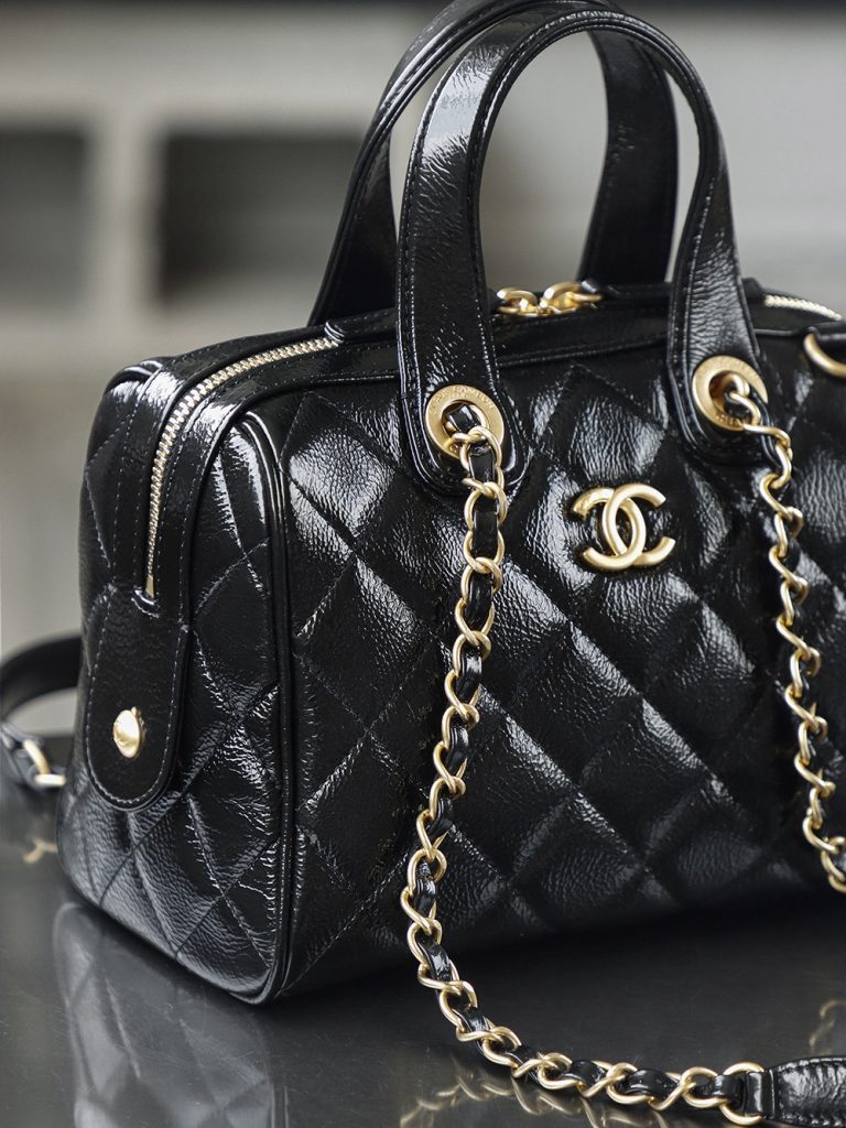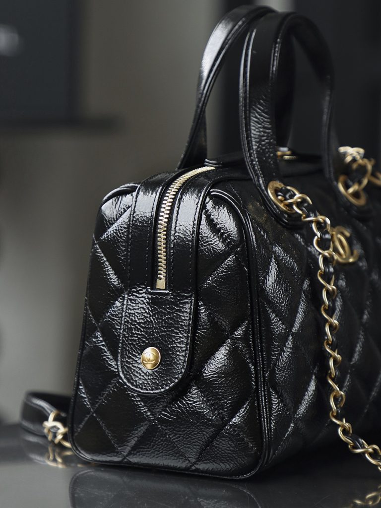 The glossy finish and softly crinkled calfskin create a distinctive texture, while the classic bowling silhouette adds a relaxed yet elegant look. Timeless, chic, and easy to style, this Chanel 25A small bowling bag stands out as a statement piece with understated sophistication.