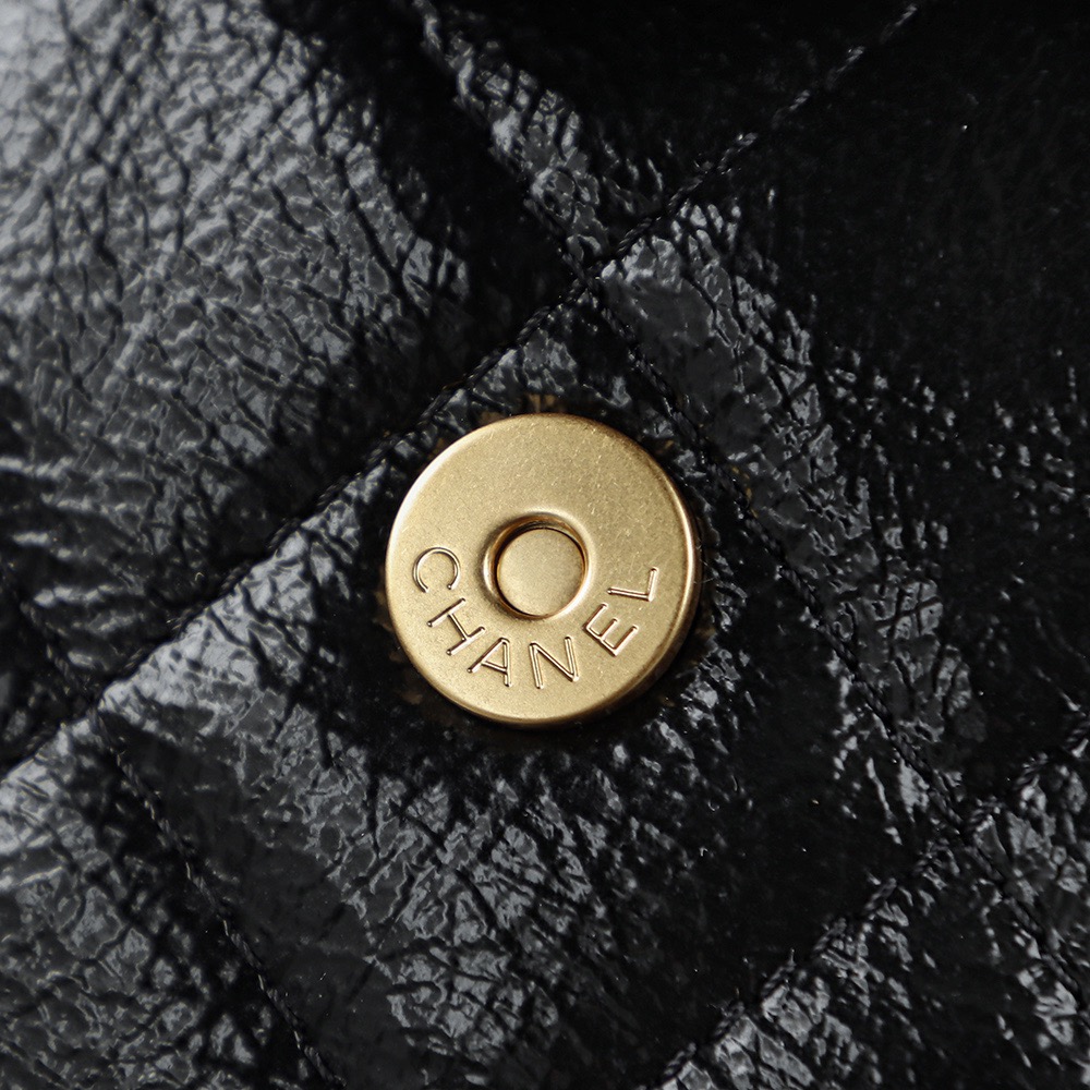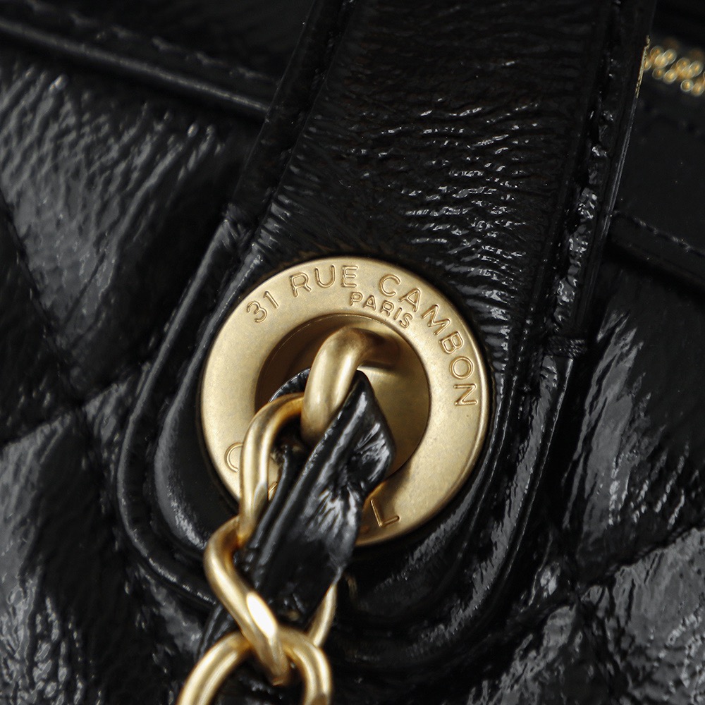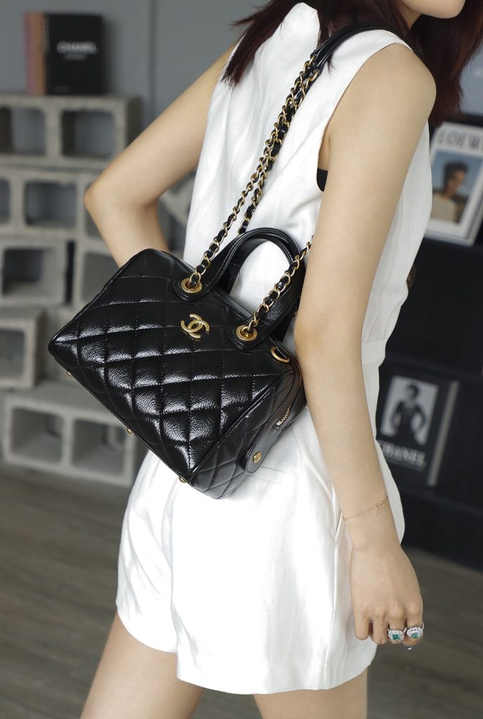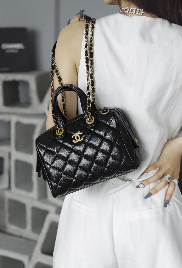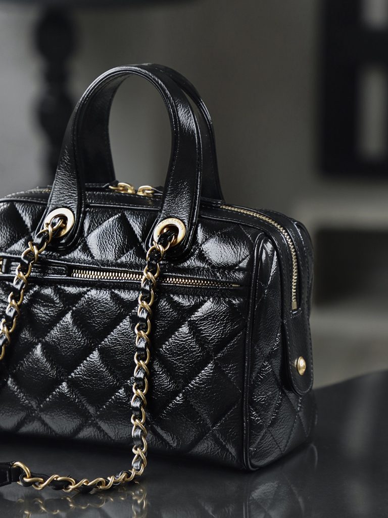 The glossy finish and softly crinkled calfskin create a distinctive texture, while the classic bowling silhouette adds a relaxed yet elegant look. Timeless, chic, and easy to style, this Chanel 25A small bowling bag stands out as a statement piece with understated sophistication.