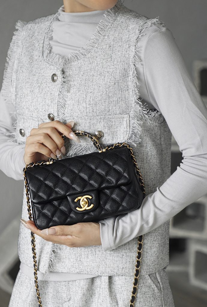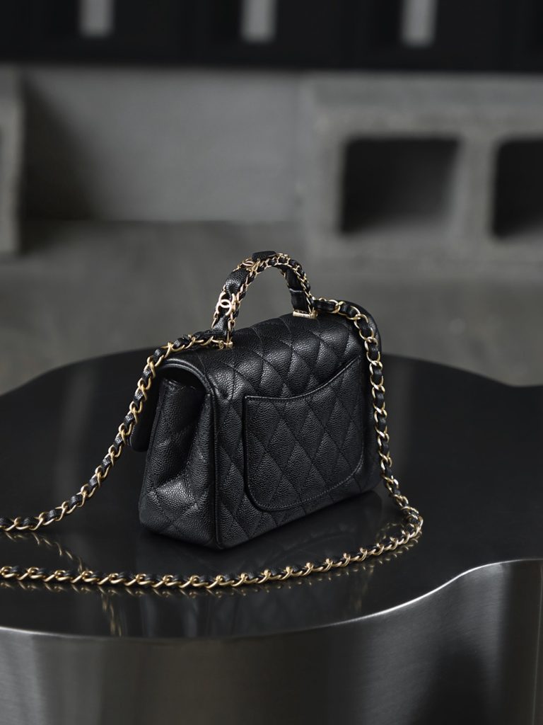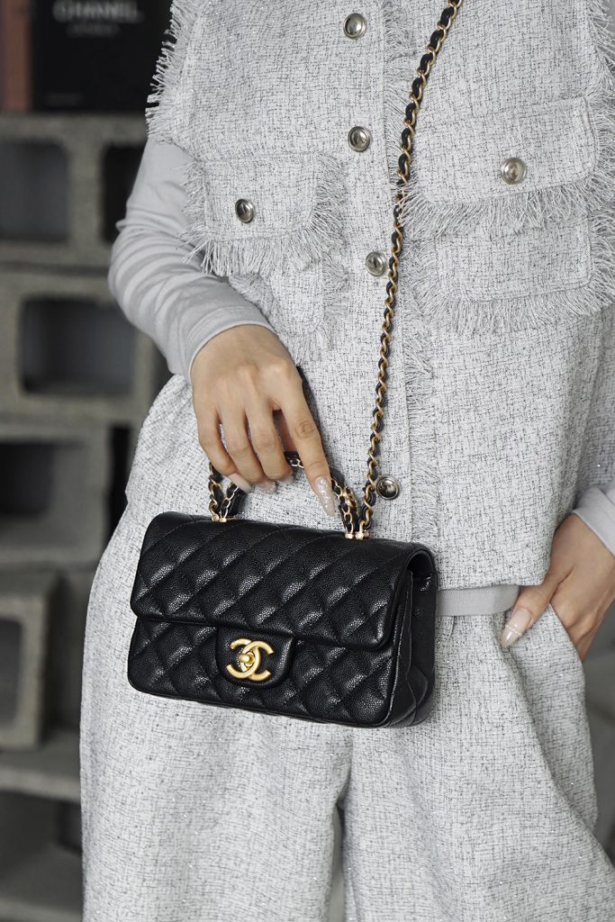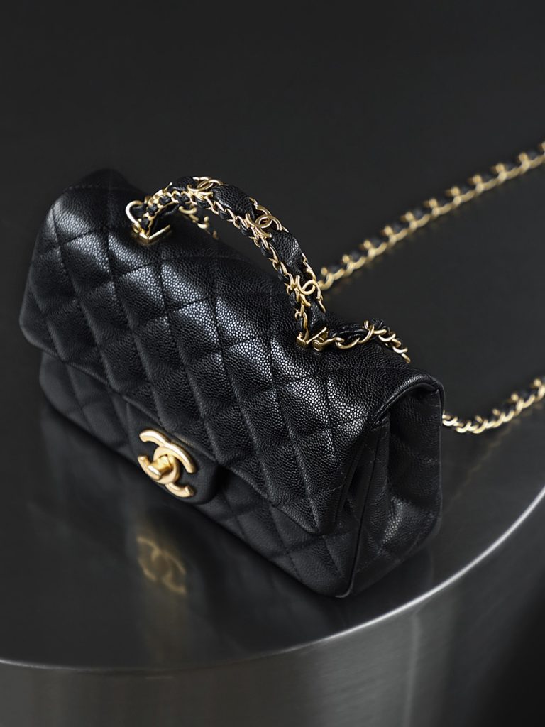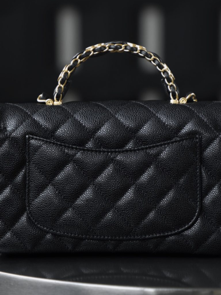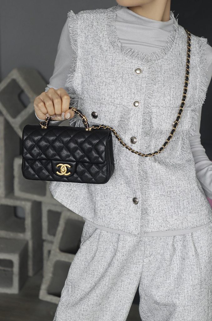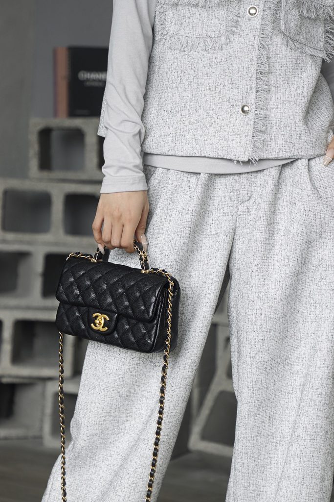 This Classic Flap Mini features a structured top handle that enhances its elegant profile, blending vintage charm with modern versatility.