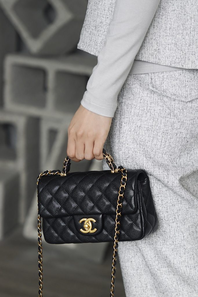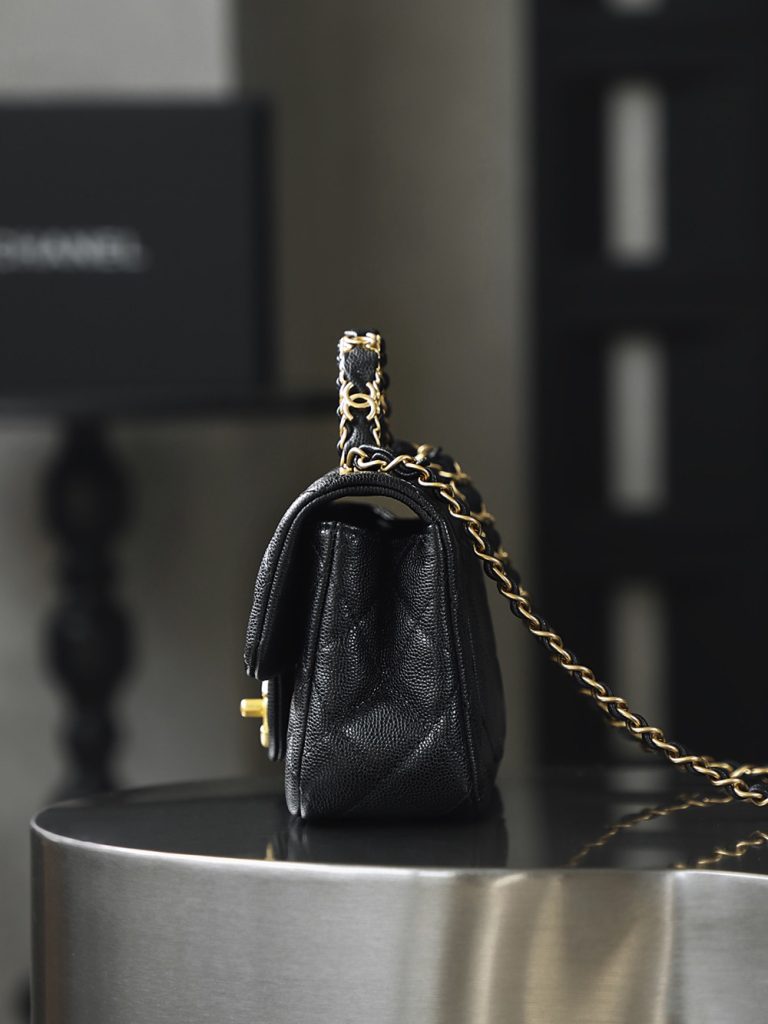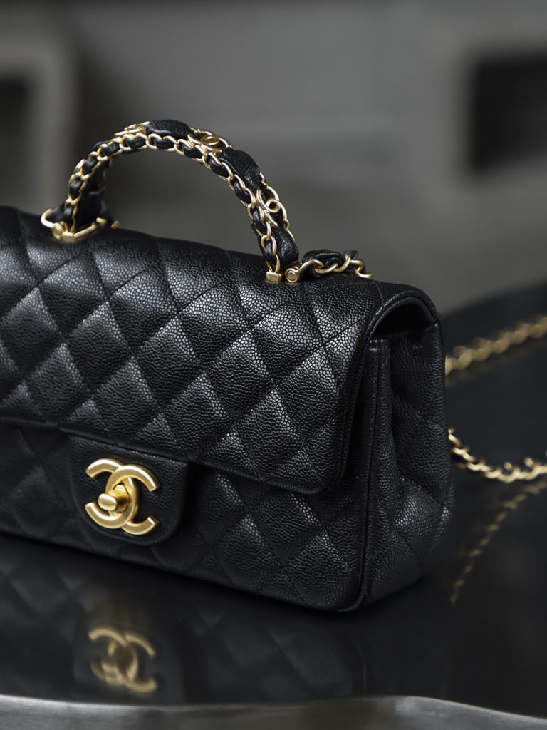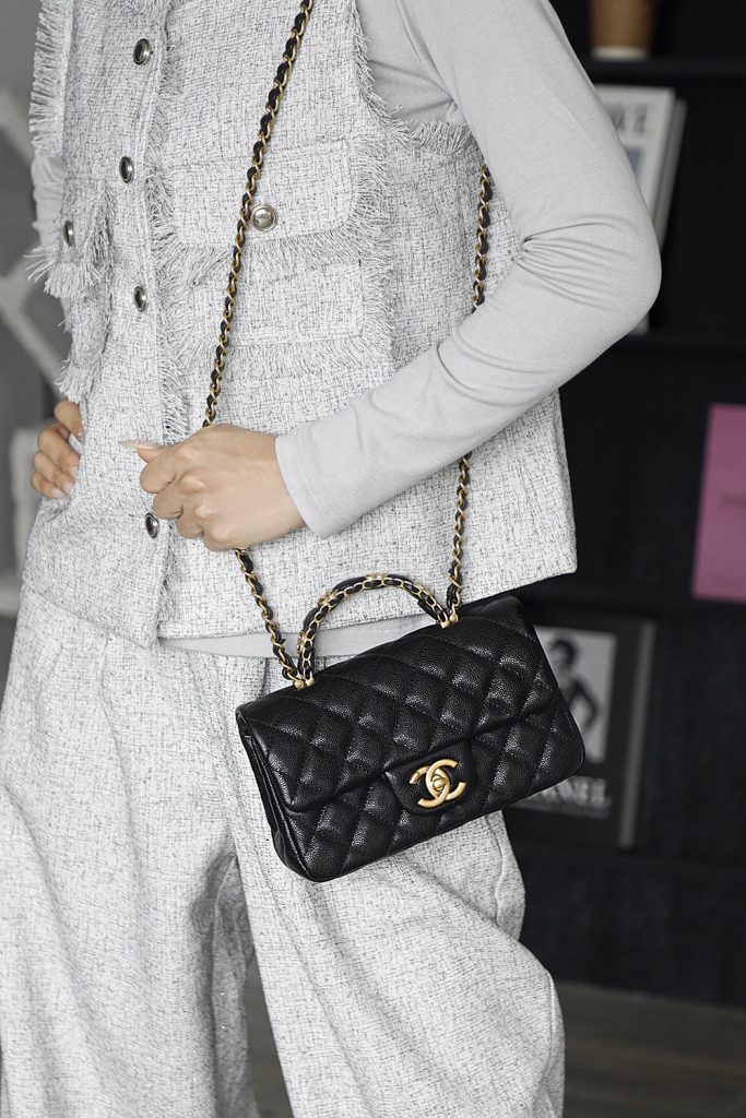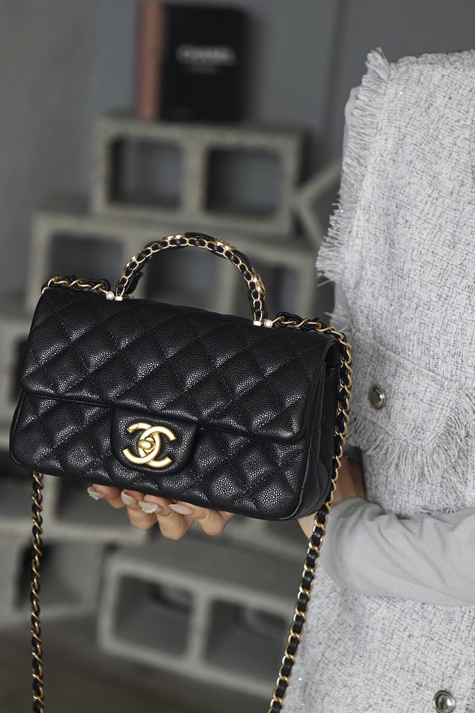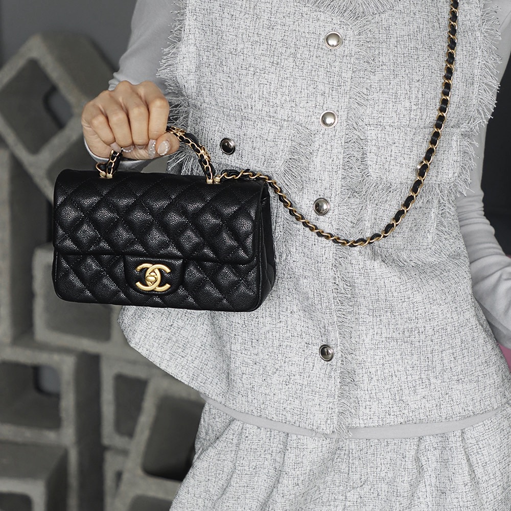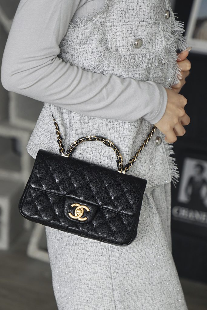 This Classic Flap Mini features a structured top handle that enhances its elegant profile, blending vintage charm with modern versatility.