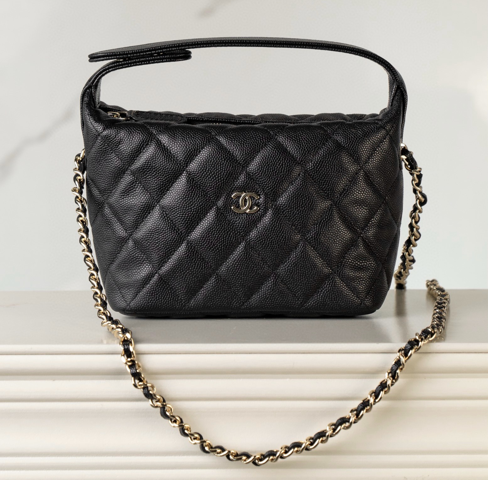 The new 25c model is a hit, featuring a versatile black and gold color scheme that is always in style. The bag has a plump and cute appearance.It is perfect for daily commutes, as it can be carried by hand or worn crossbody. Exclusive original factory HAAS caviar cowhide, although it is cowhide, the texture is very soft, like cotton candy, with strong resilience. The hardware is made of 24k pure copper thickly plated in a light champagne gold color. The chain is detachable, allowing the bag to be used as a clutch. The interior features original factory calfskin lining and dark red high-density vertical patterned lining. Red and black is also a timeless classic.