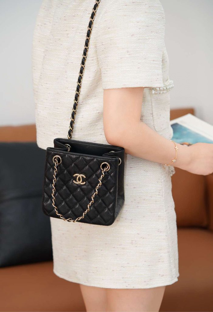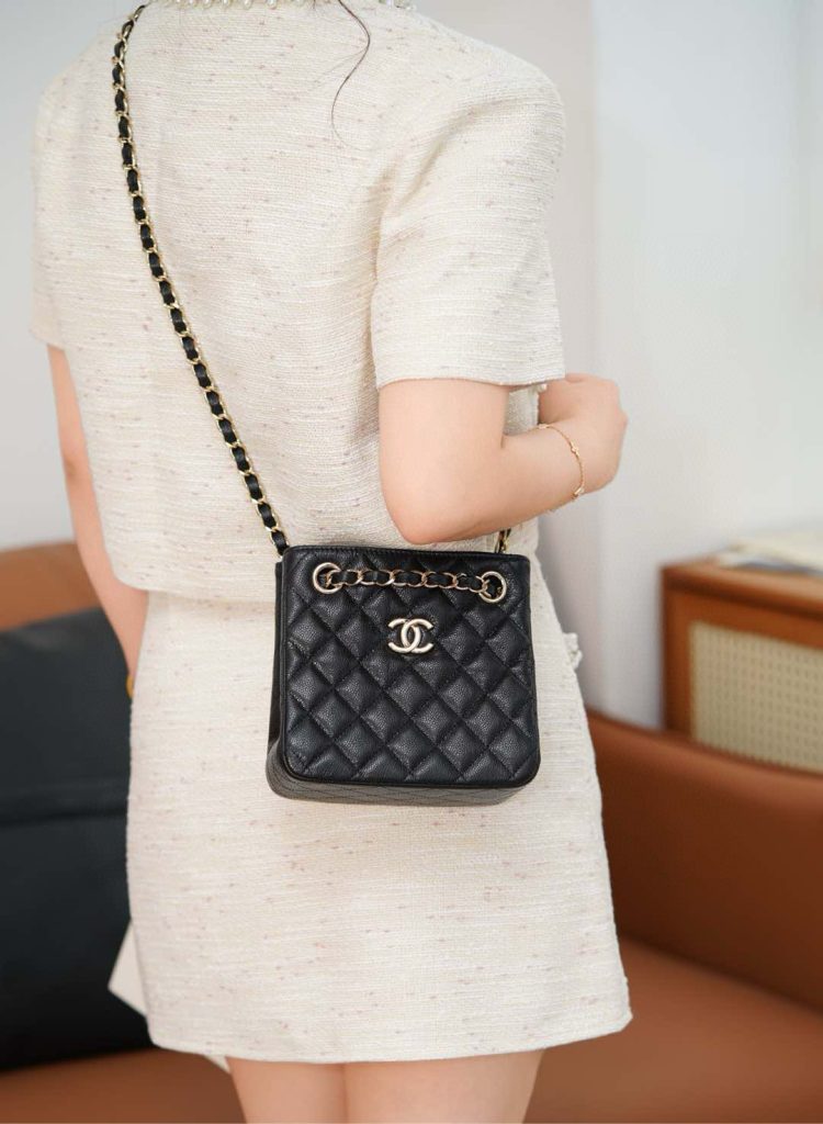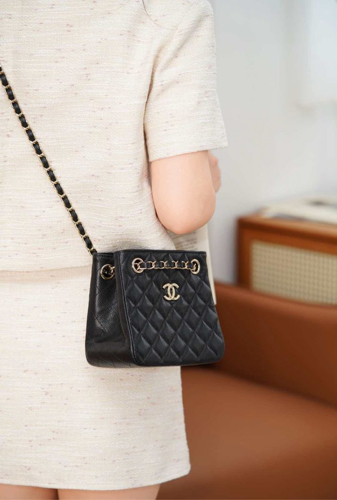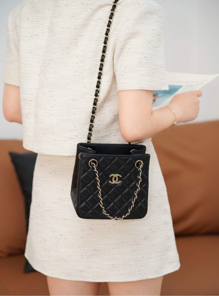 It is a mini bucket bag with great size and appearance. It looks very elegant and stylish when worn. It is extremely hard to get at the boutique. Highly recommended!