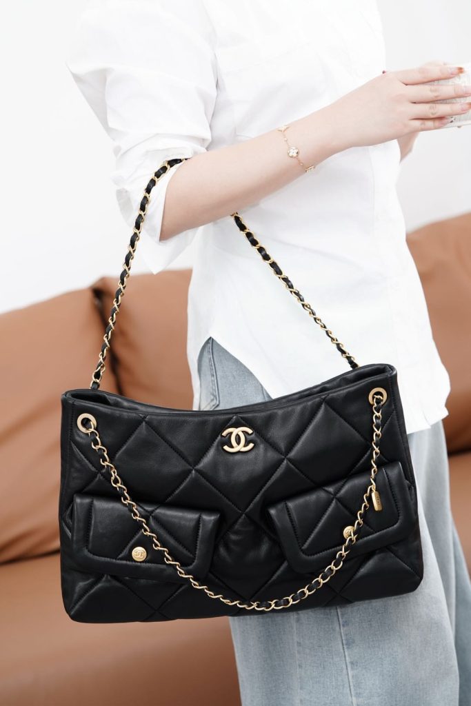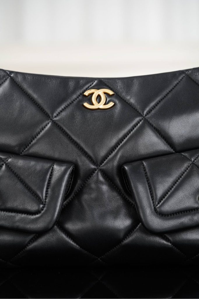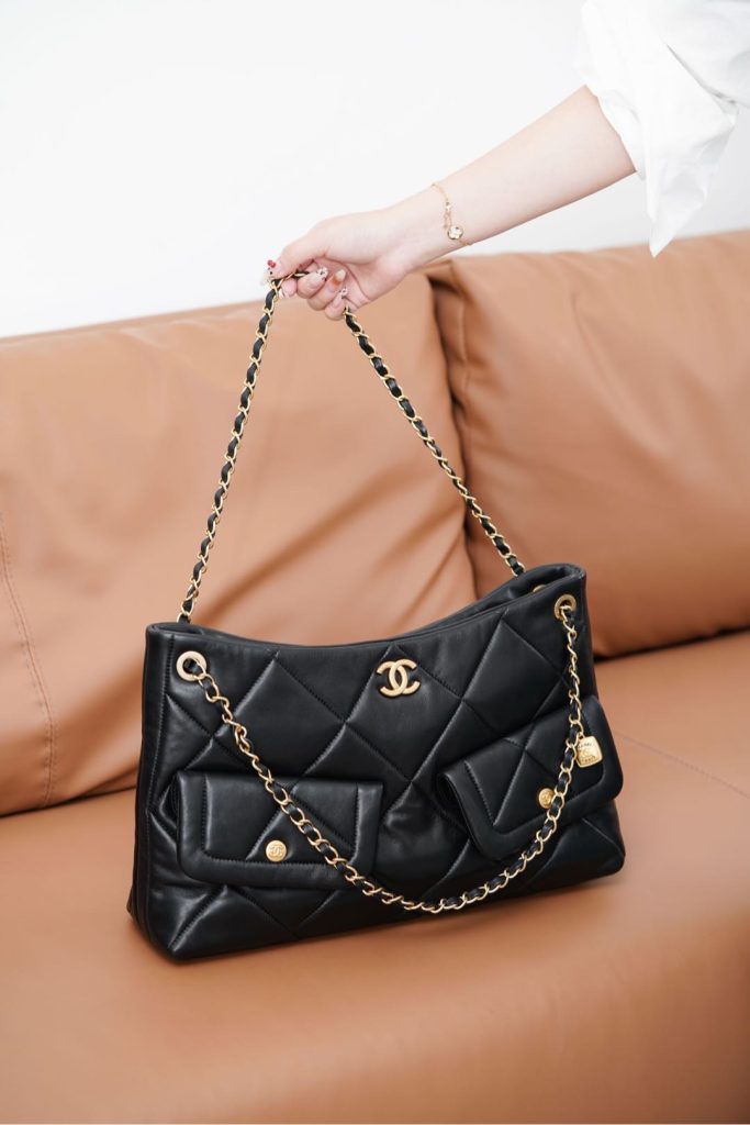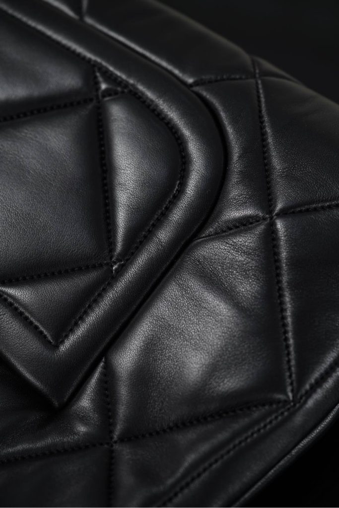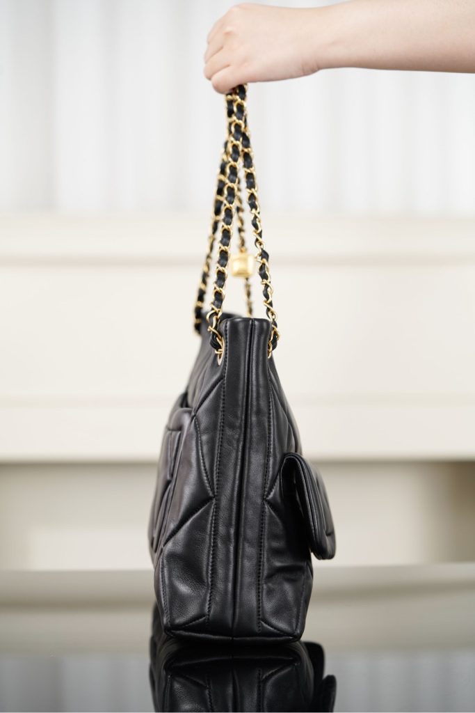 A must-have oversized bag for fall and winter, crafted in chocolate-smooth black lambskin with a soft, delicate touch. The classic diamond quilting, double-C hardware, and the little gold medallion on the chain instantly catch the eye. It carries a full vintage charm, while the relaxed, effortless Hobo shape adds a sense of casual elegance — making this bag a true “beauty currency” that never fails.