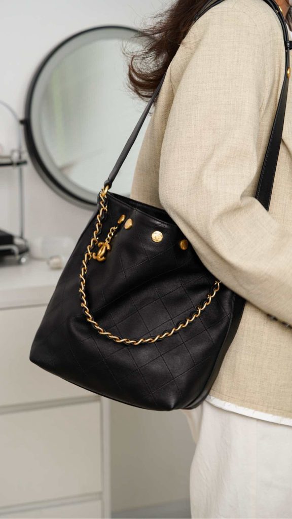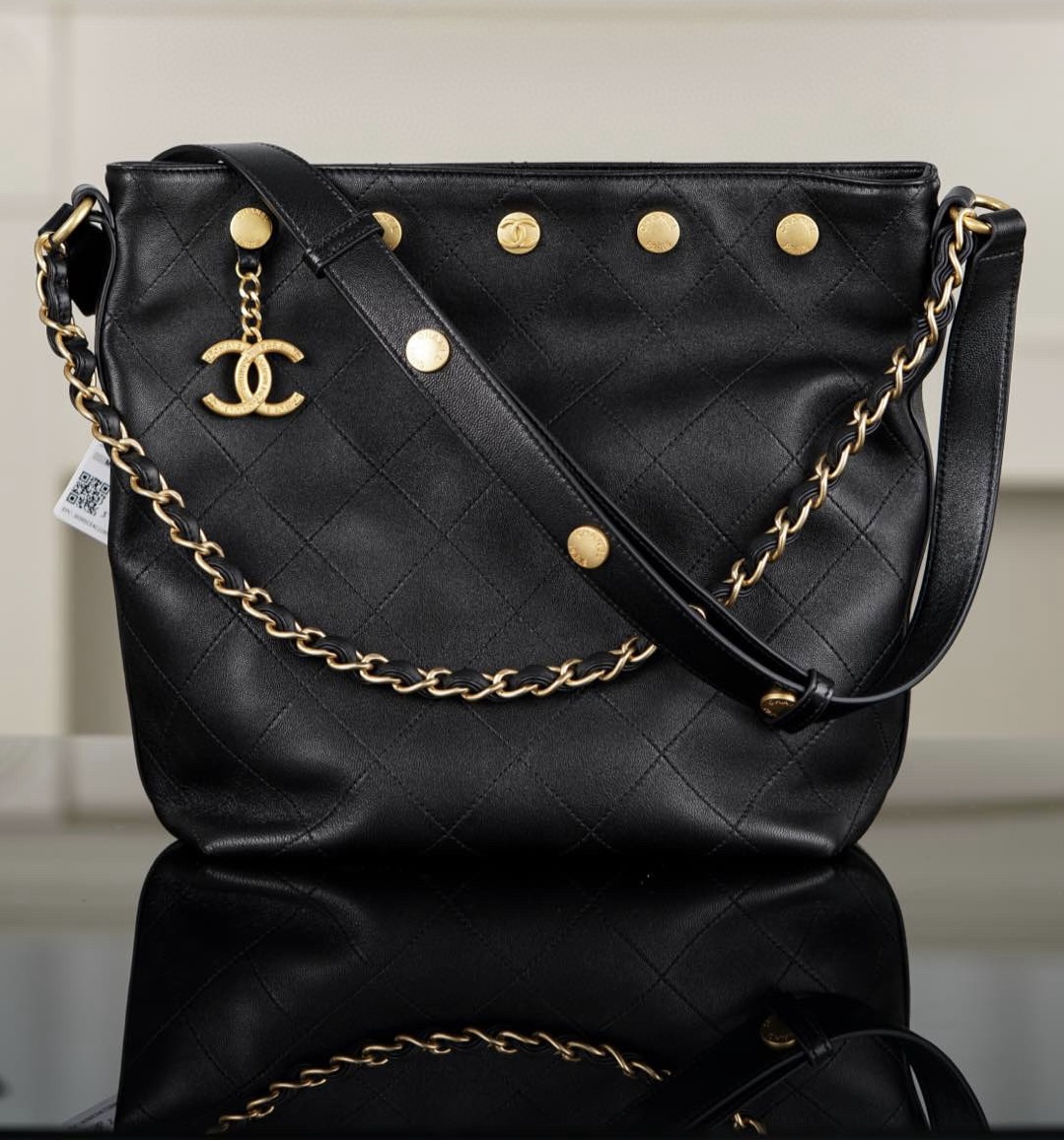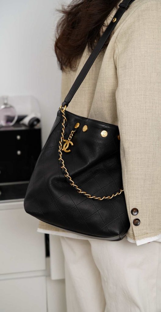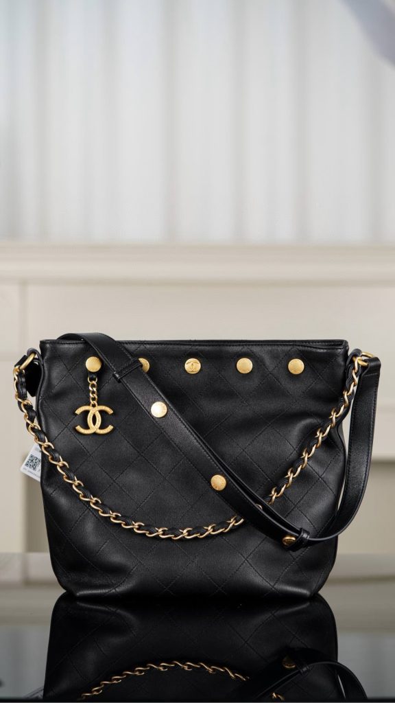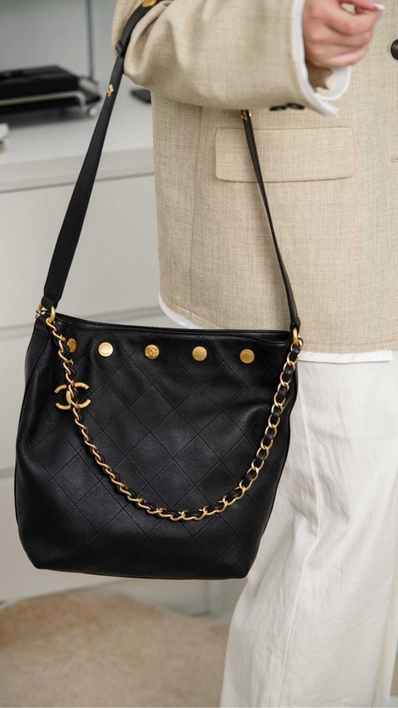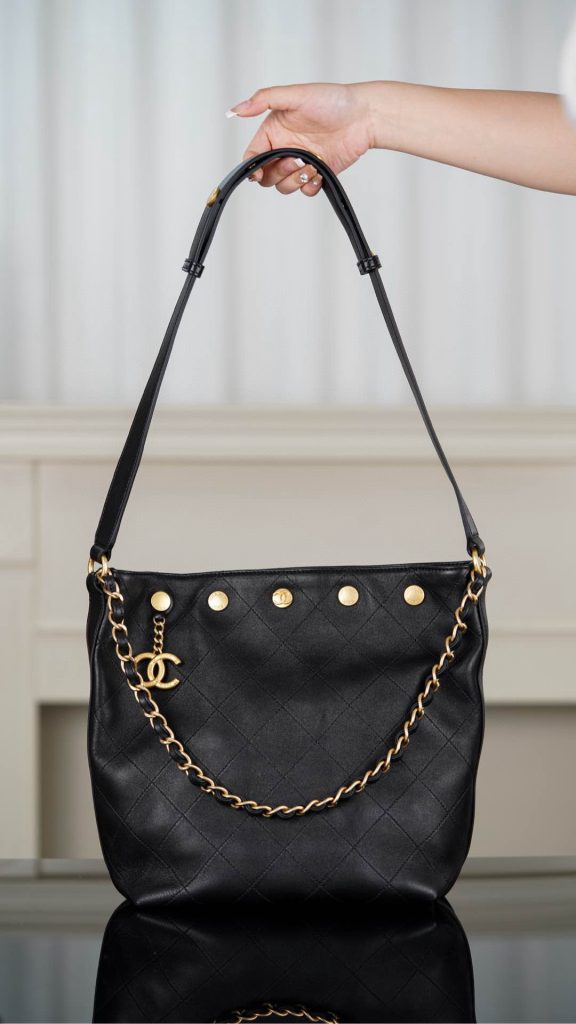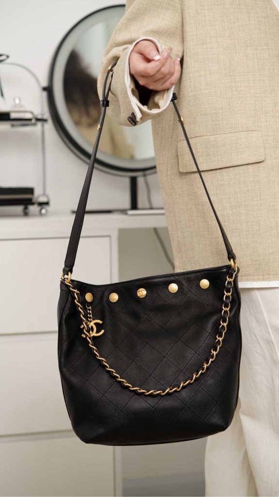 The bucket hobo bag is super spacious and has a very appealing shape. It is made of soft and delicate original factory goatskin. The hardware has a vintage antique style. The metal row buttons plus the double C pendant design with a sense of weight give it a full vintage feel. It looks amazing when worn and is very casual and versatile. It easily creates a relaxed and cool girl vibe.