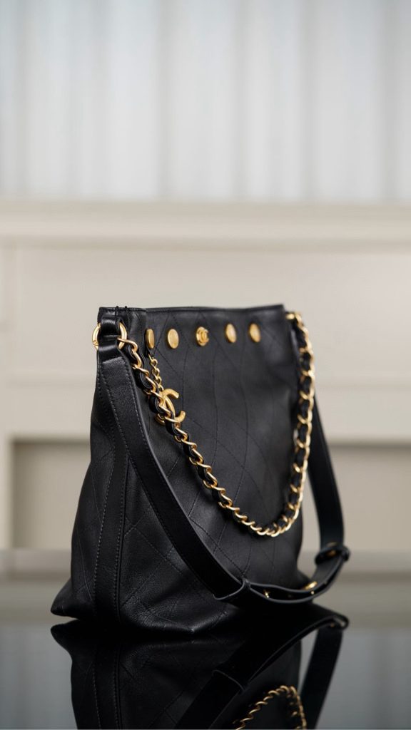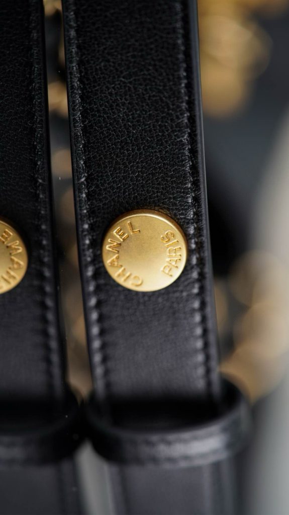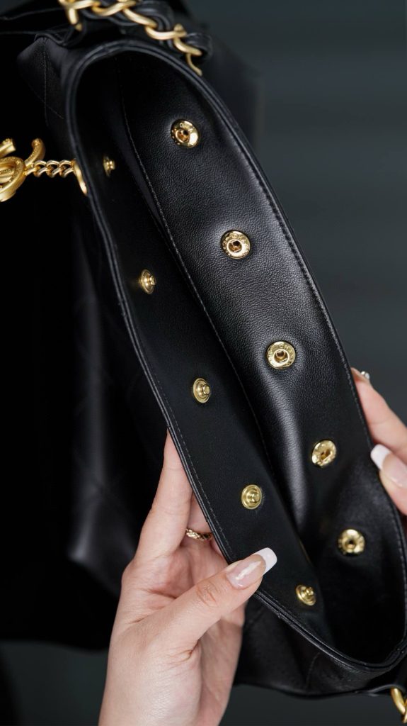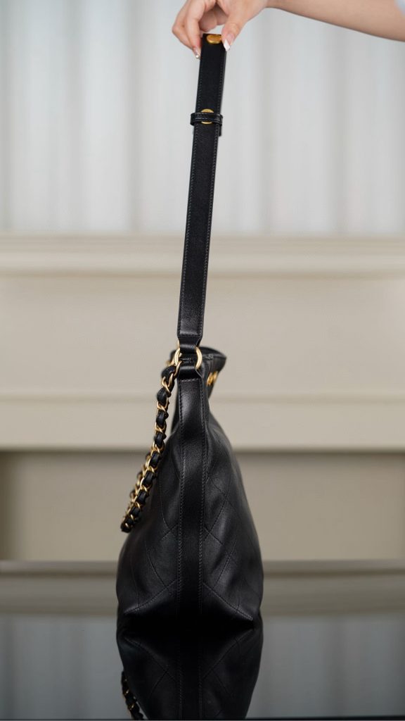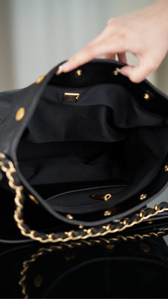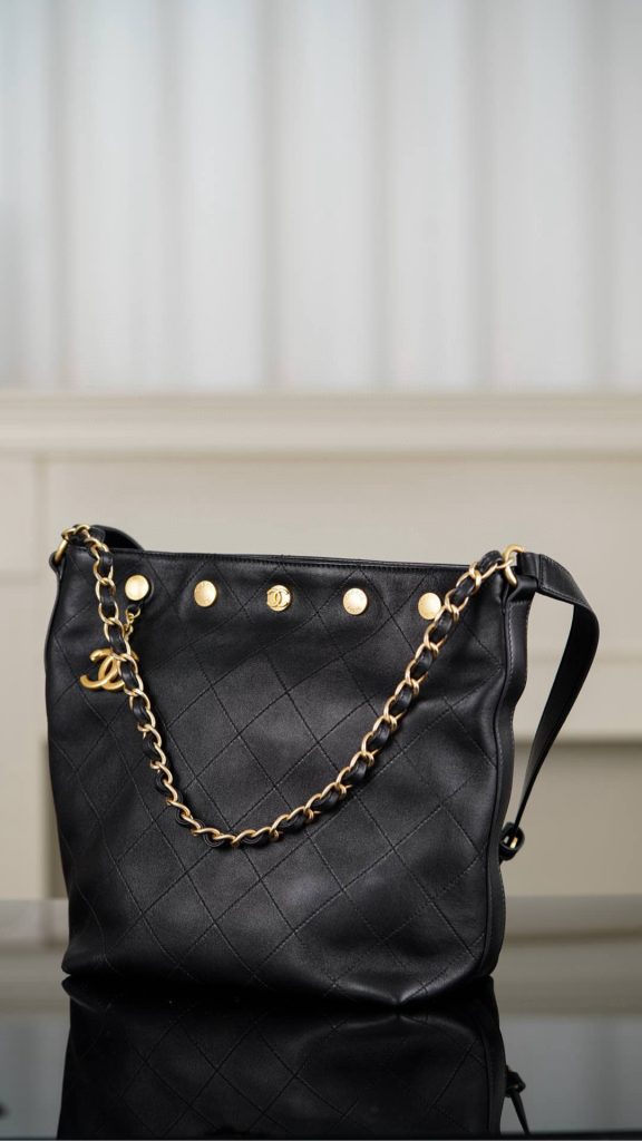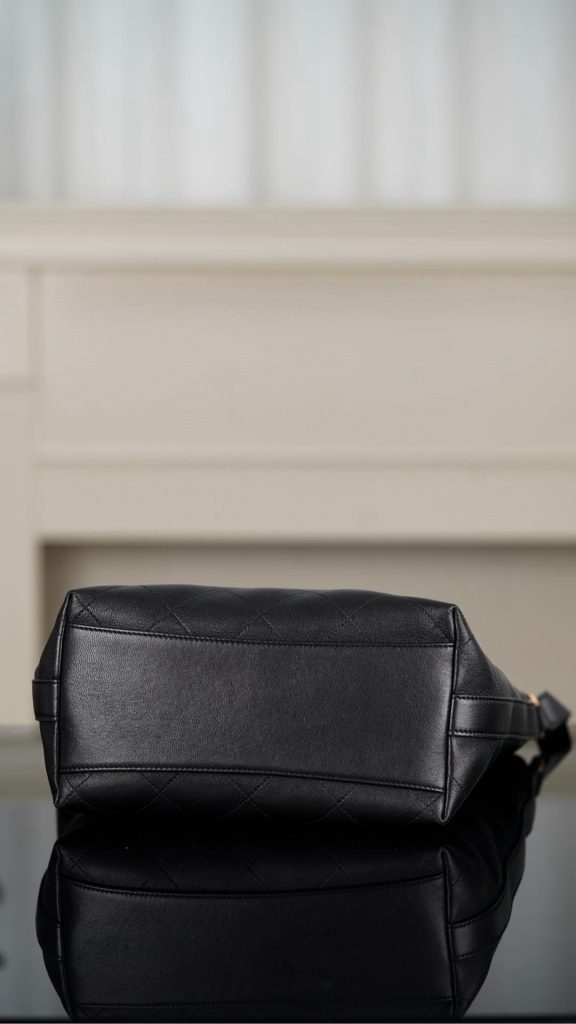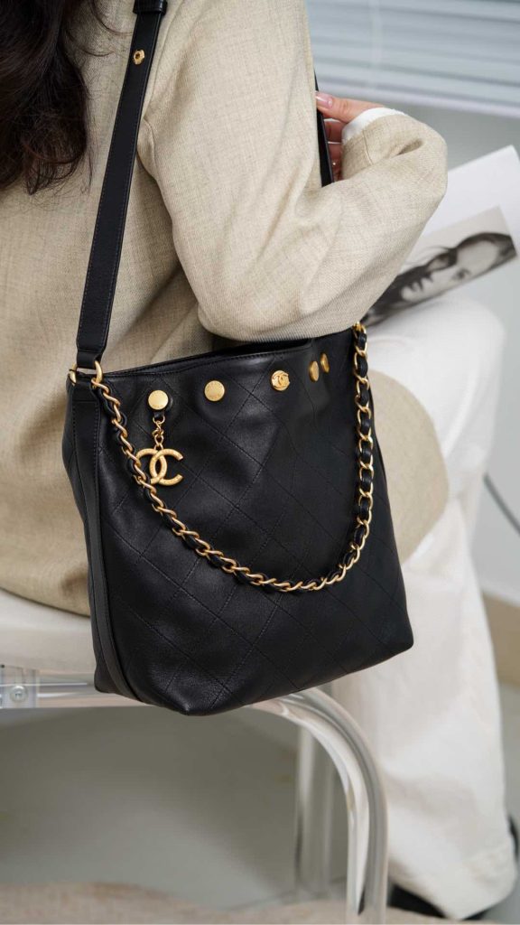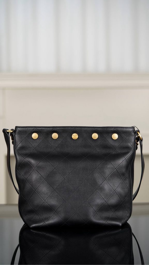 The bucket hobo bag is super spacious and has a very appealing shape. It is made of soft and delicate original factory goatskin. The hardware has a vintage antique style. The metal row buttons plus the double C pendant design with a sense of weight give it a full vintage feel. It looks amazing when worn and is very casual and versatile. It easily creates a relaxed and cool girl vibe.
