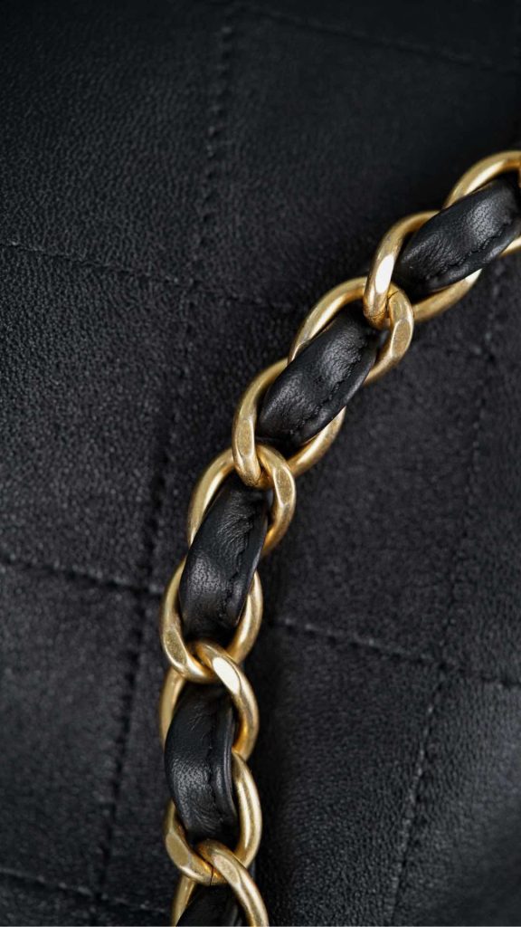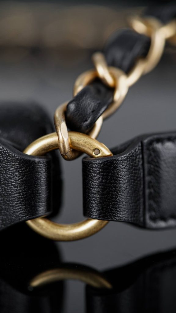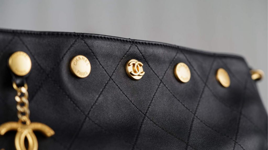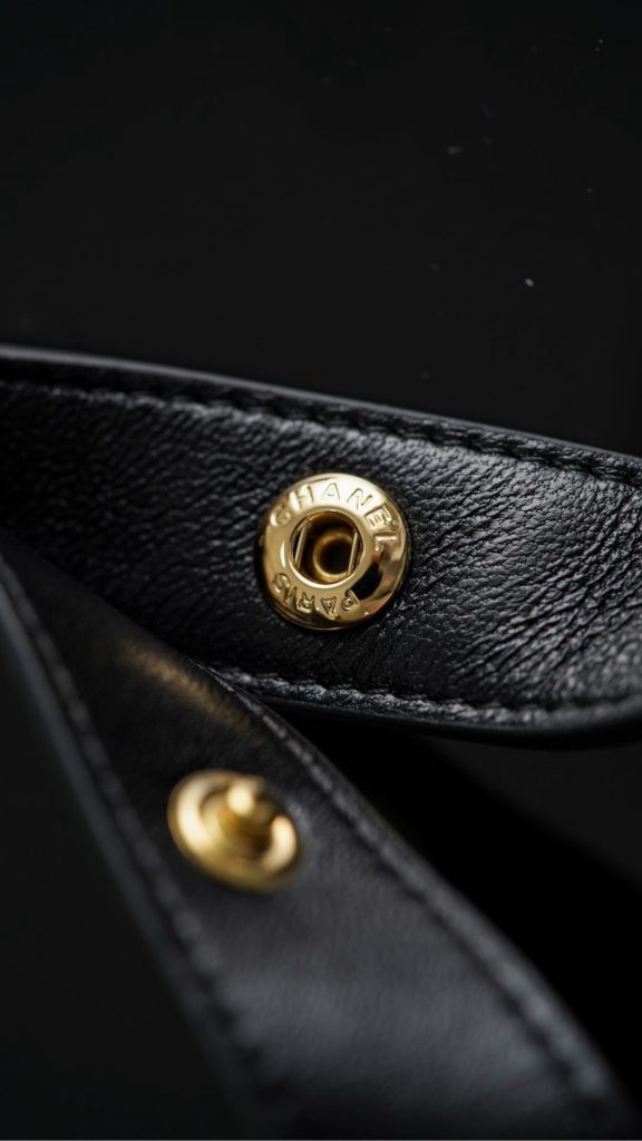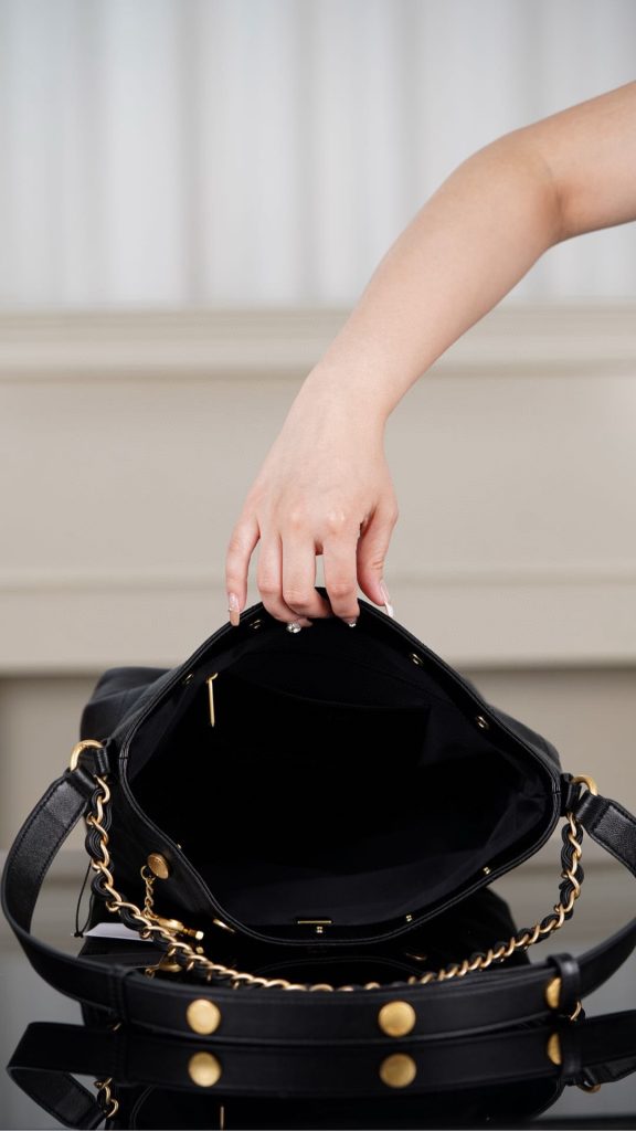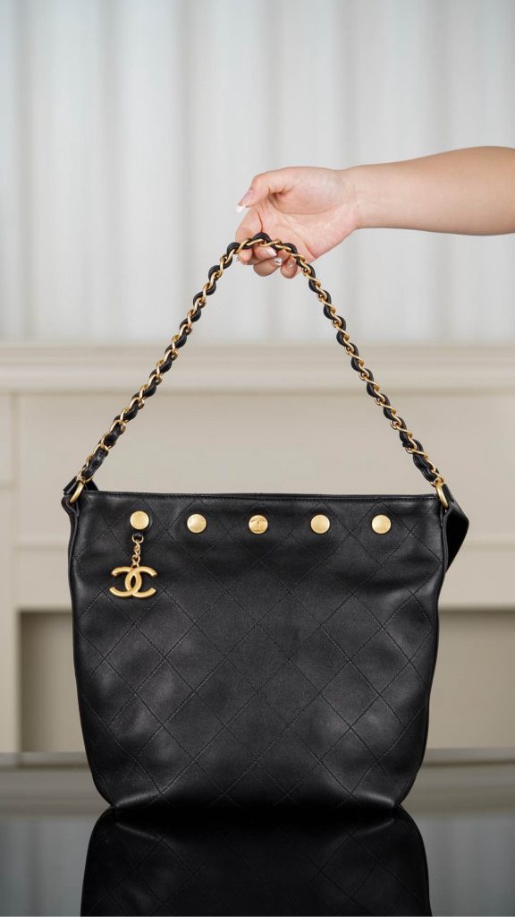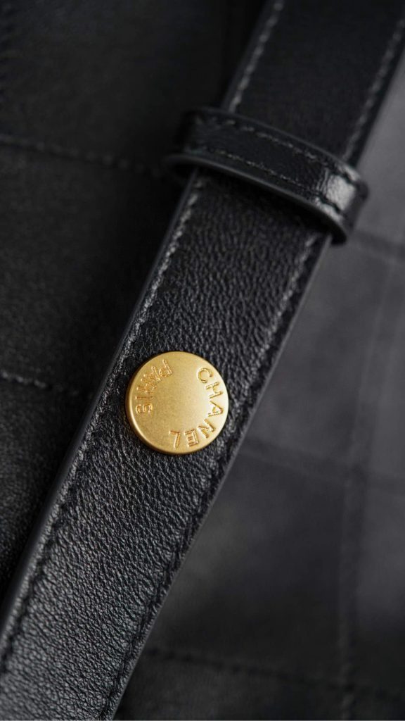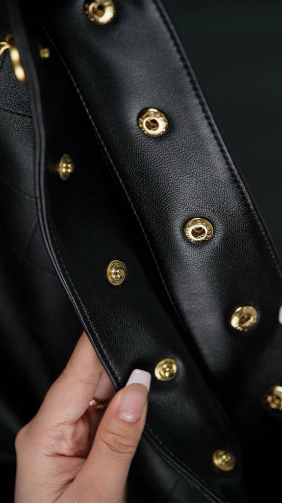 The bucket hobo bag is super spacious and has a very appealing shape. It is made of soft and delicate original factory goatskin. The hardware has a vintage antique style. The metal row buttons plus the double C pendant design with a sense of weight give it a full vintage feel. It looks amazing when worn and is very casual and versatile. It easily creates a relaxed and cool girl vibe.