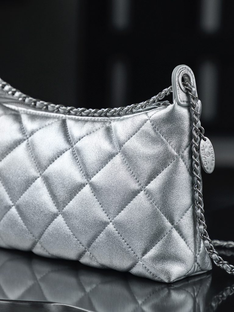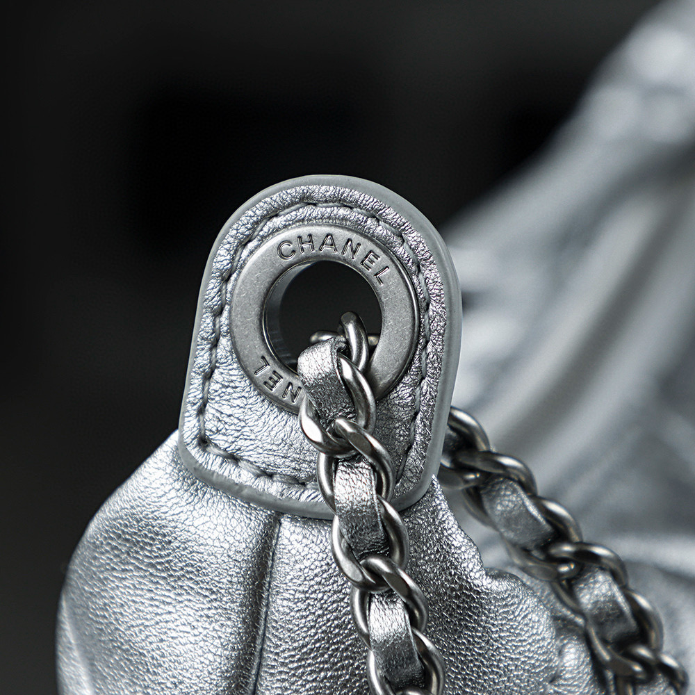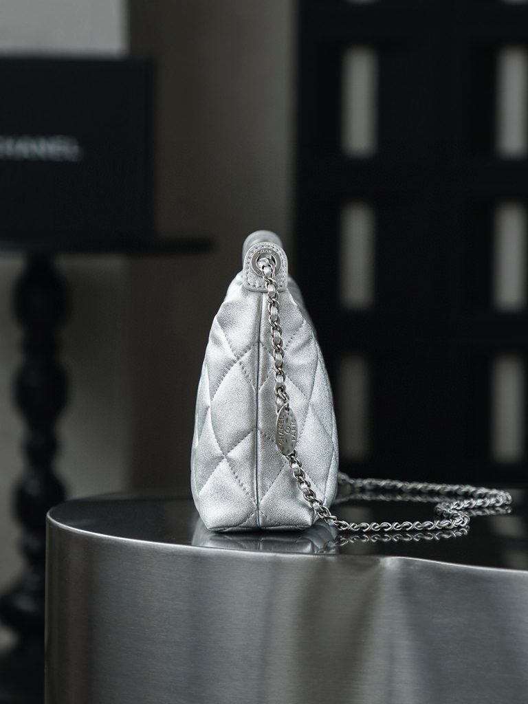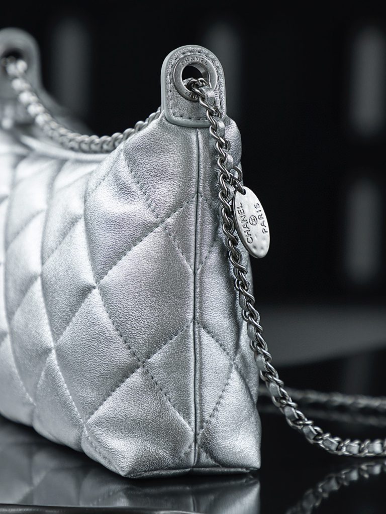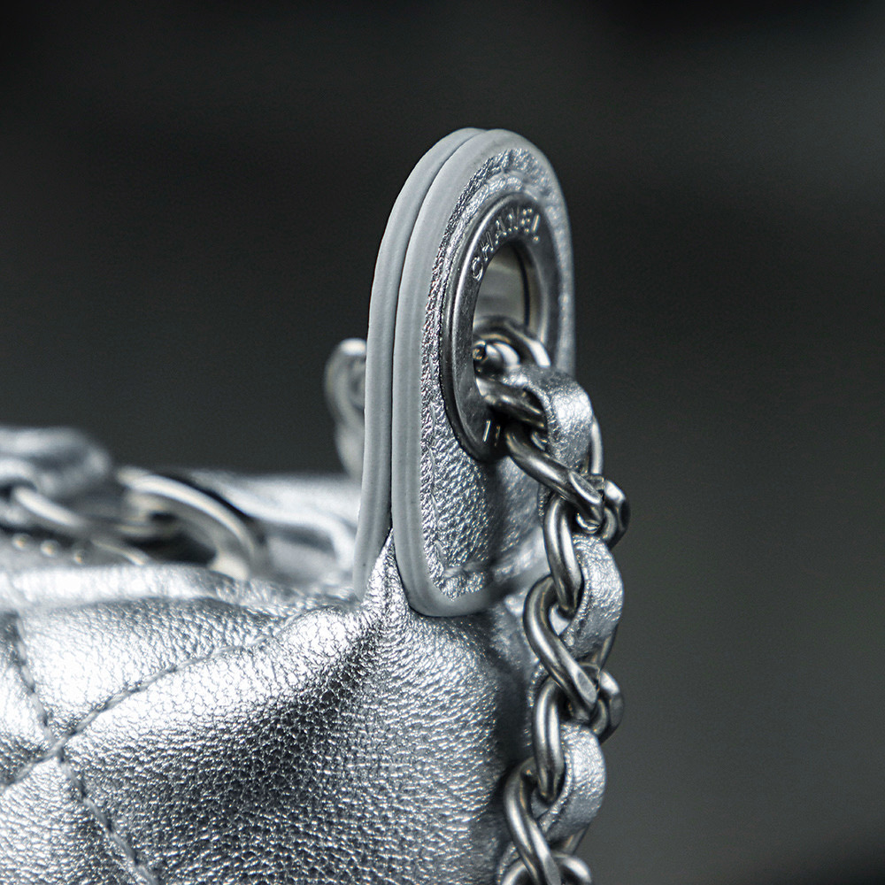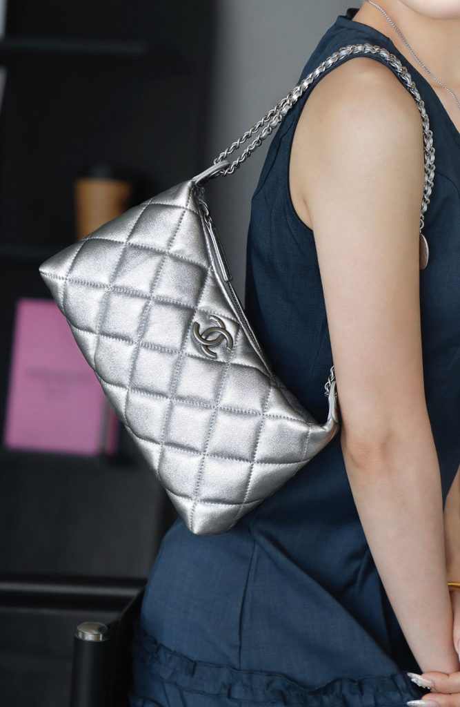 The 25S dumpling-shaped hobo is the most stunning bag of the season! Its dual-chain underarm design allows versatile styling, while the delicate gold coin accents add a touch of retro chic. It perfectly blends cuteness with a sophisticated, fashionable edge.