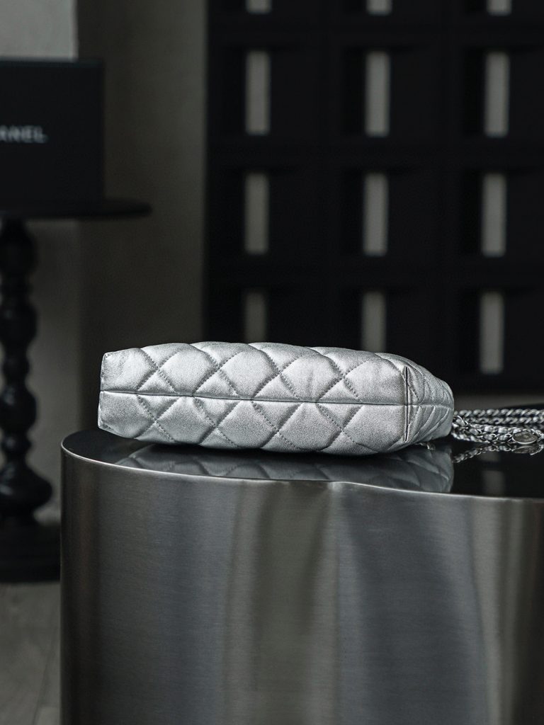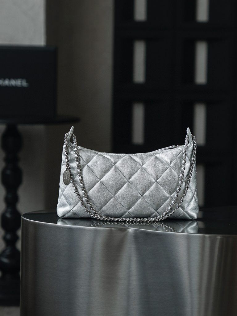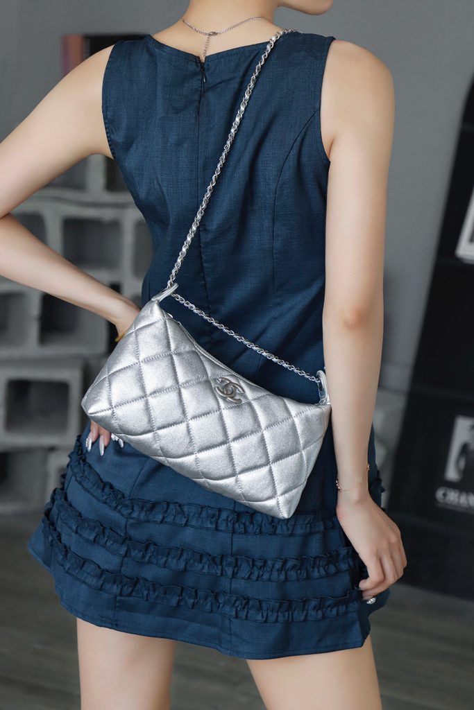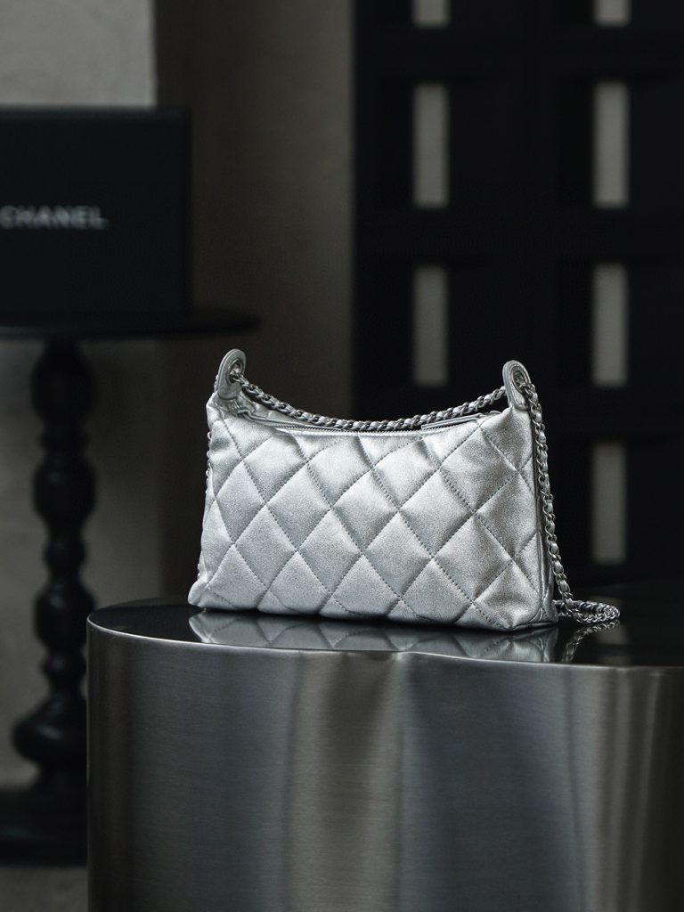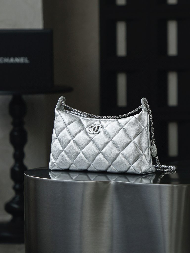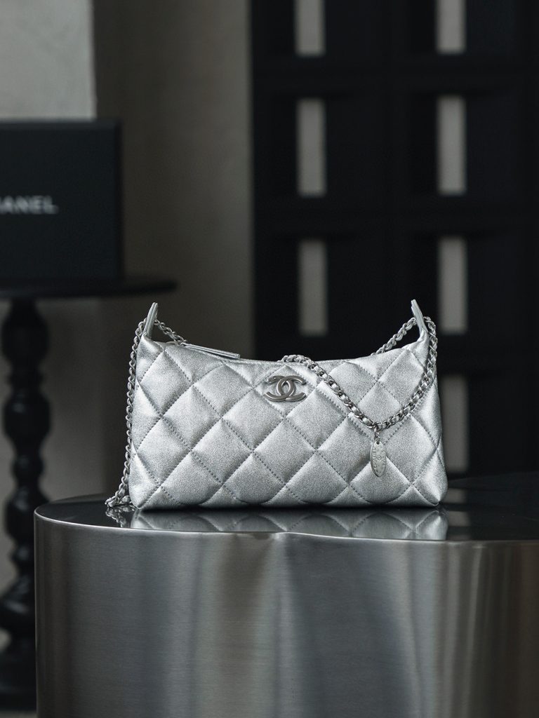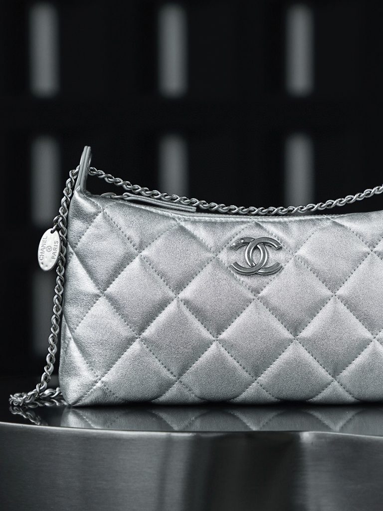 The 25S dumpling-shaped hobo is the most stunning bag of the season! Its dual-chain underarm design allows versatile styling, while the delicate gold coin accents add a touch of retro chic. It perfectly blends cuteness with a sophisticated, fashionable edge.