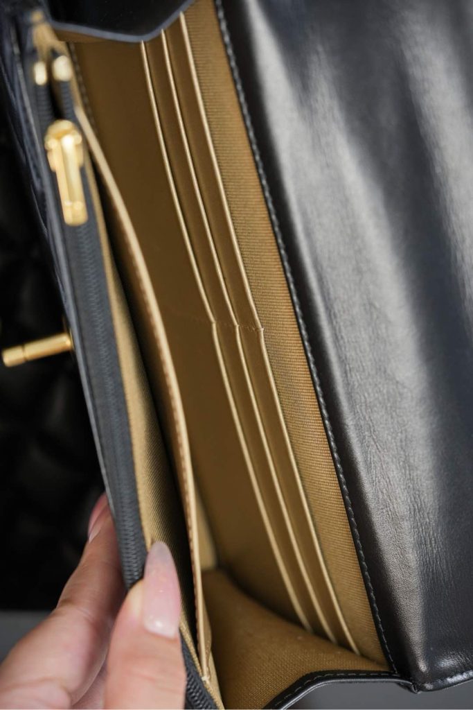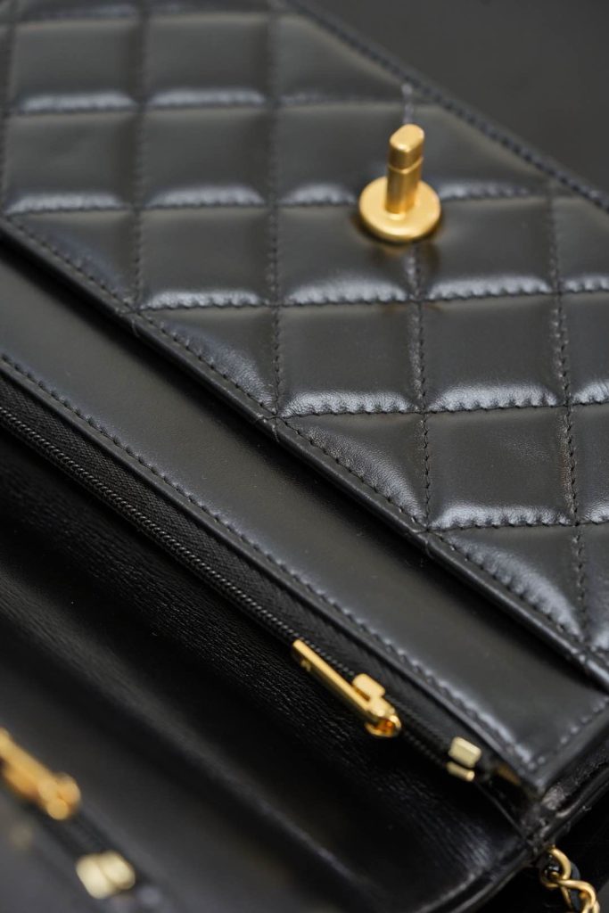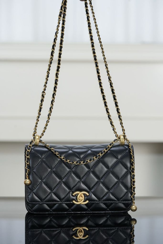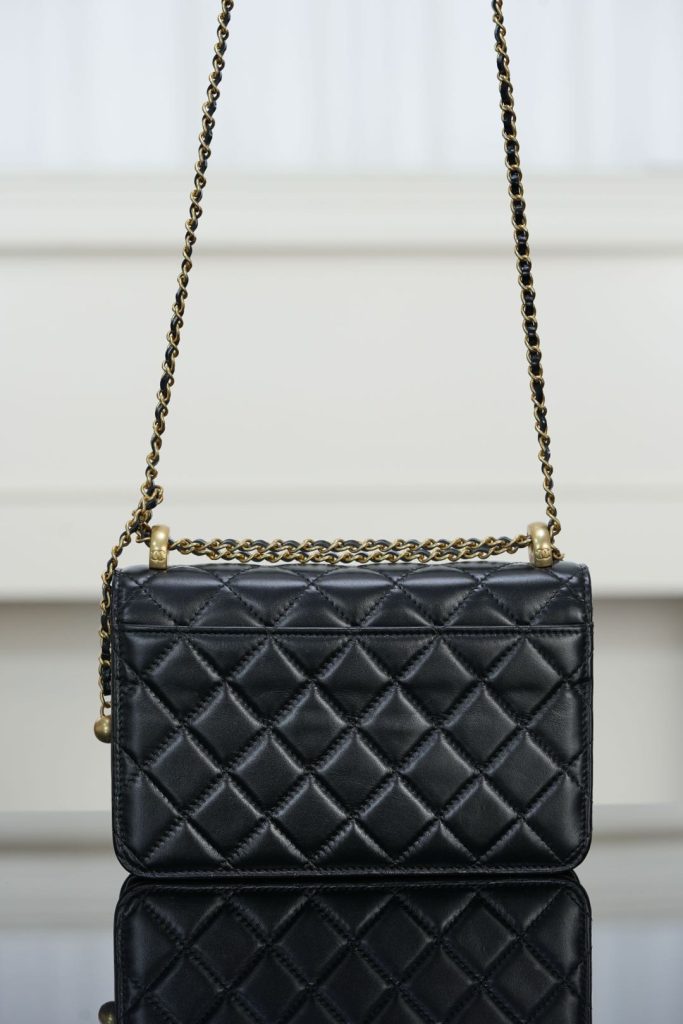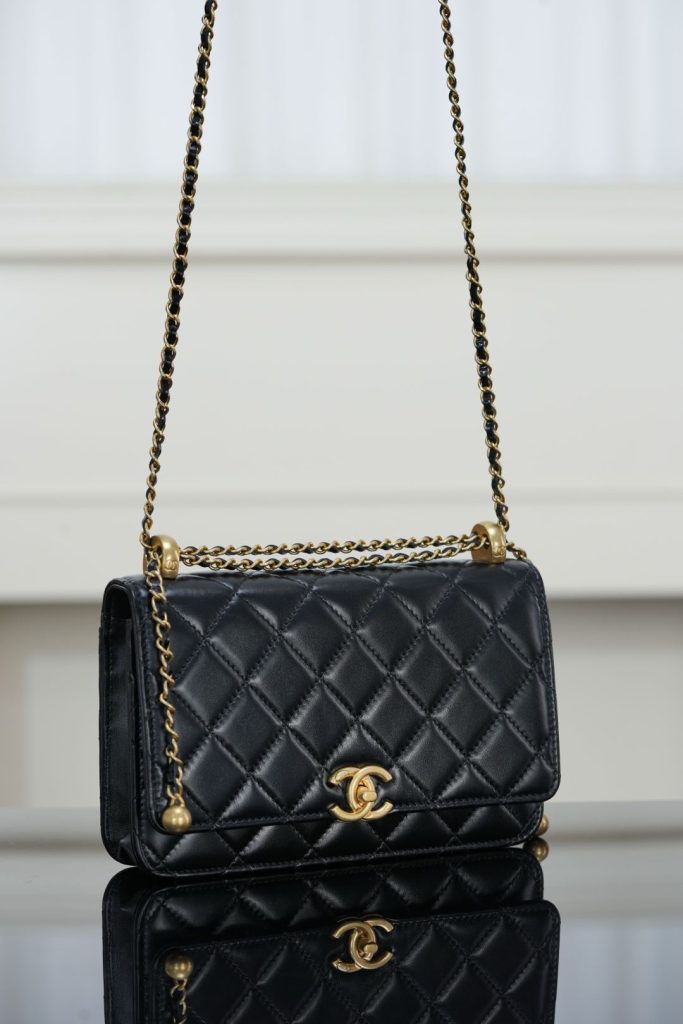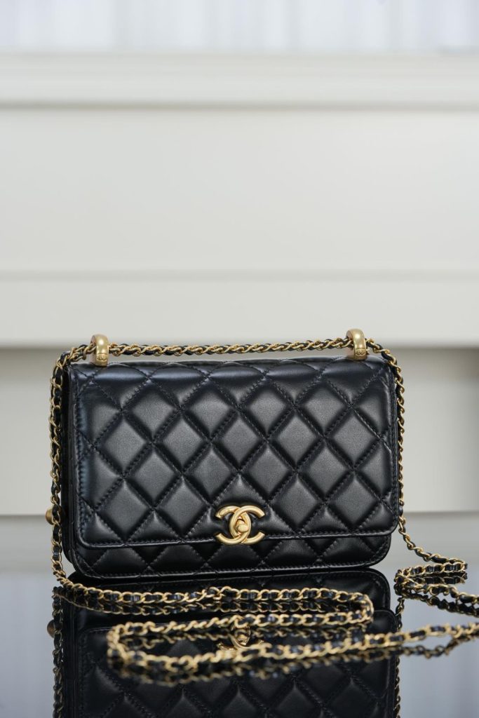 Despite its compact silhouette, this Wallet on Chain provides practical capacity, easily fitting a smartphone and daily essentials. Finished in classic black and gold, it is an ideal small bag for both daytime wear and evening occasions — timeless, versatile, and effortlessly elegant.