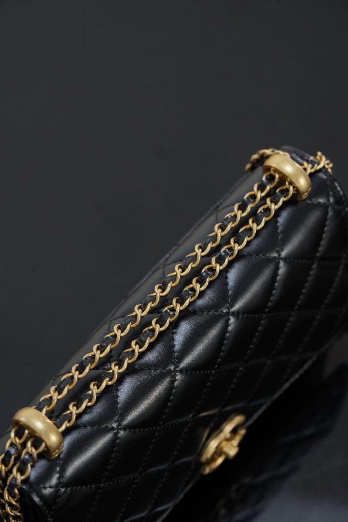 Chanel 25S WOC | double gold chain WOC | black gold WOC bag | wallet on chain | oil-wax leather WOC | adjustable chain WOC | small black luxury bag | classic WOC handbag