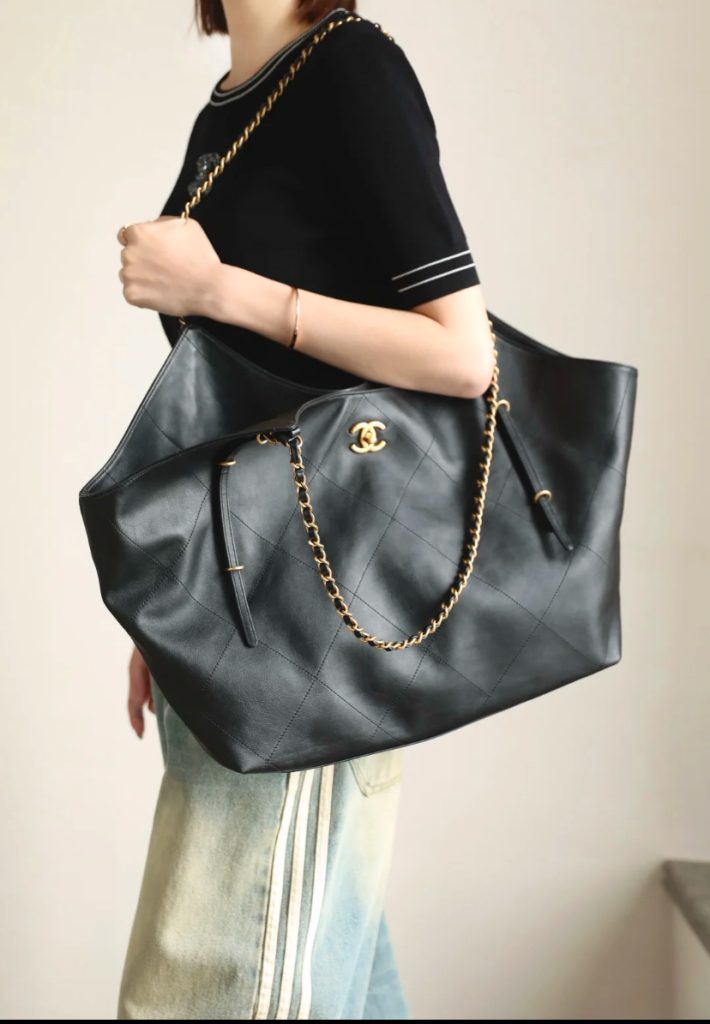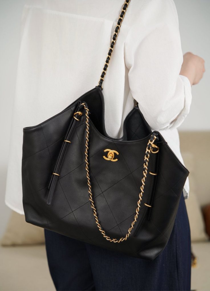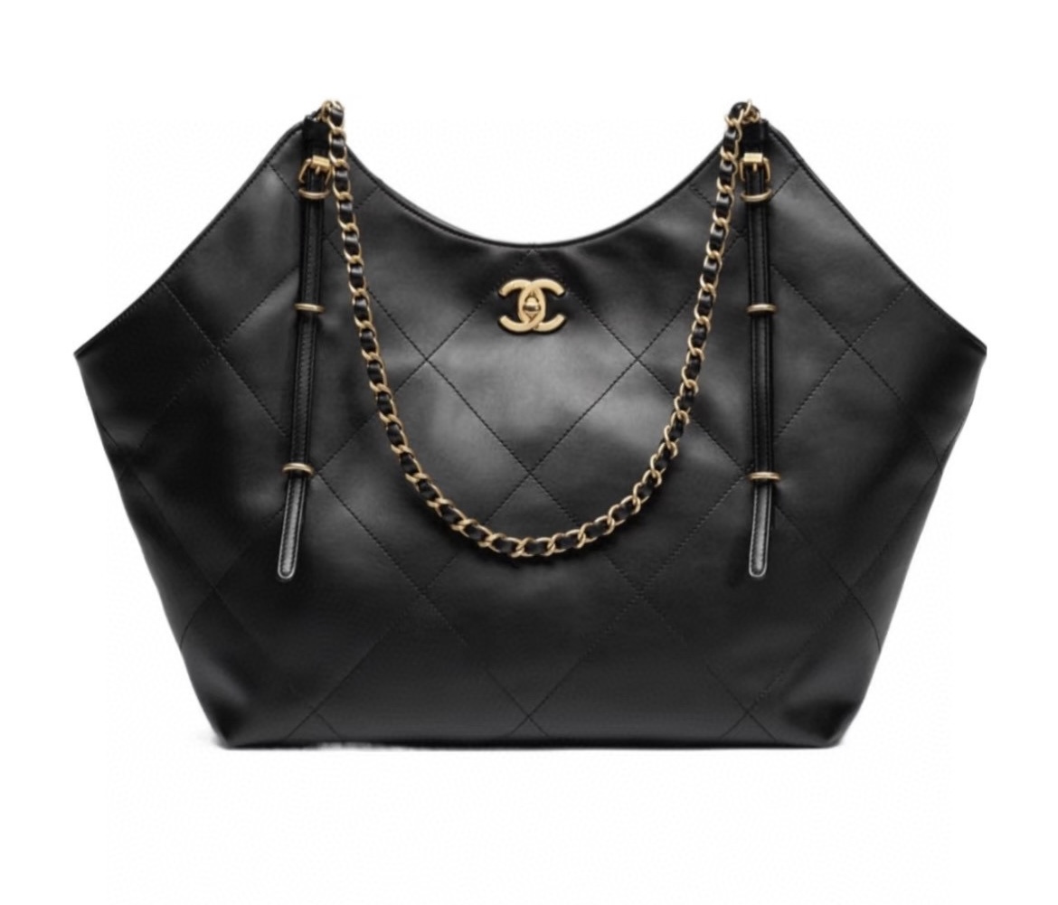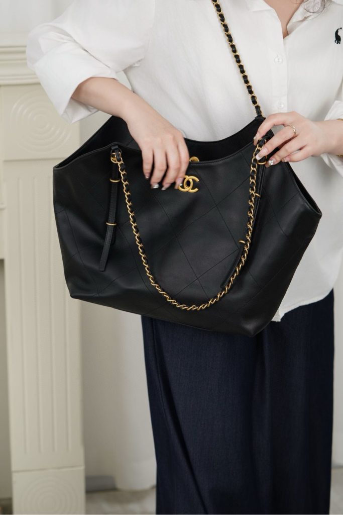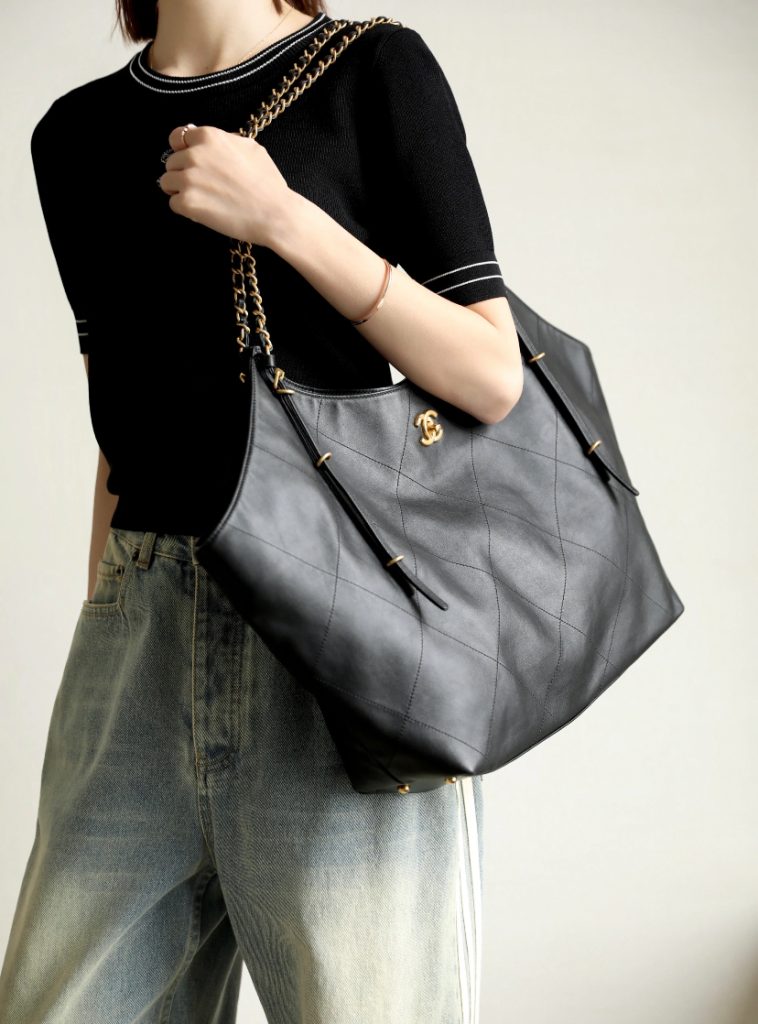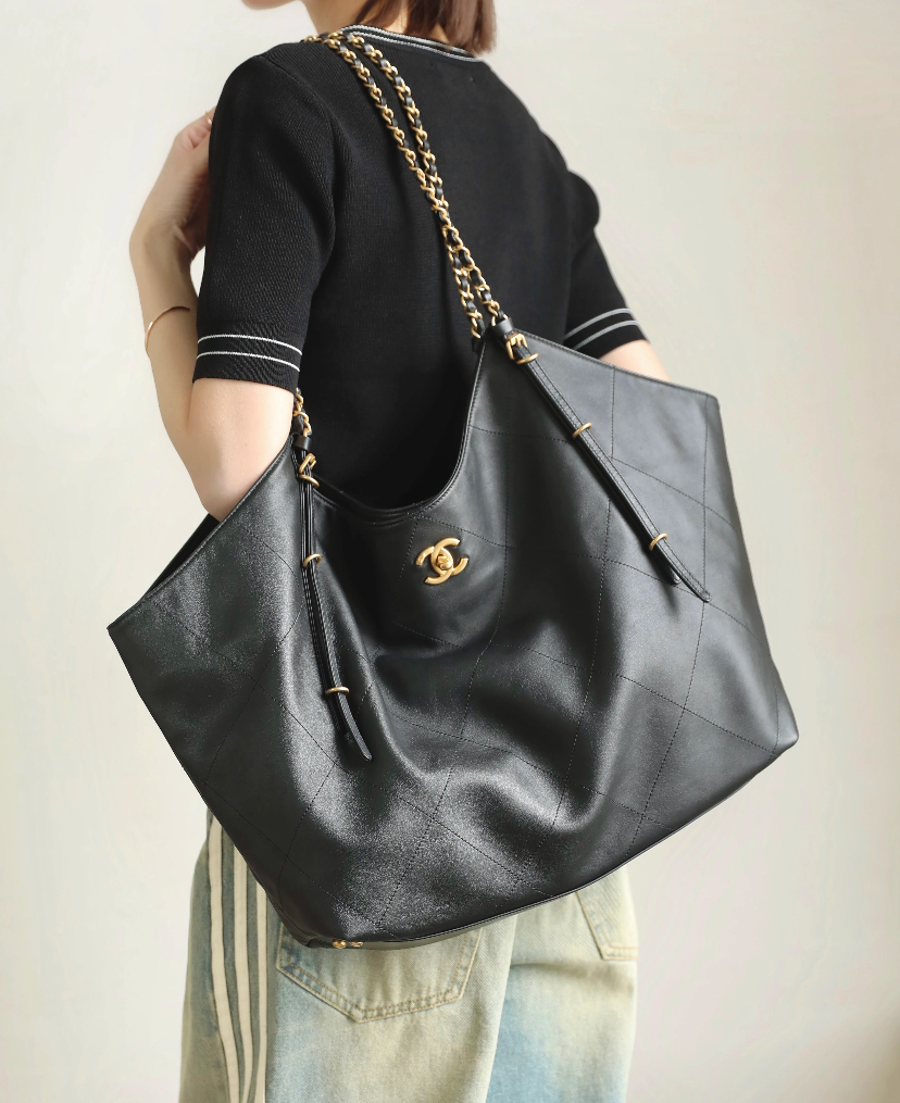 The Chanel 25S Maxi Tote Bag is a departure from the previous dazzling and eye-catching styles. This time, the black quilted body is directly adorned with two metal chains, exuding an impeccable vintage charm! The fine texture of the calfskin and the chain shoulder strap create a look that is both laid-back and glamorous. When worn over the shoulder, it gives off a languid superstar vibe, while carrying it by hand makes you walk with a cool and confident stride.