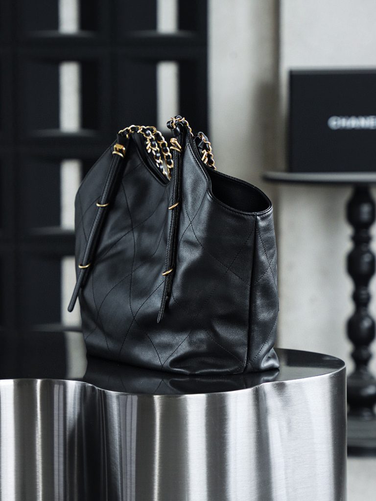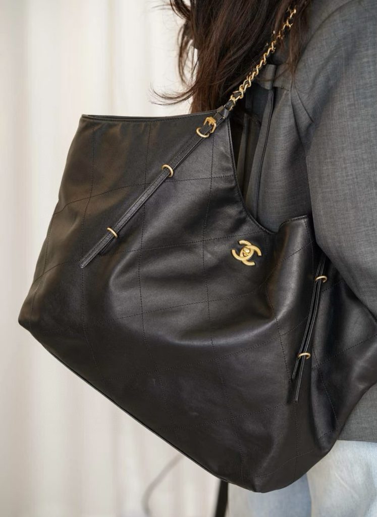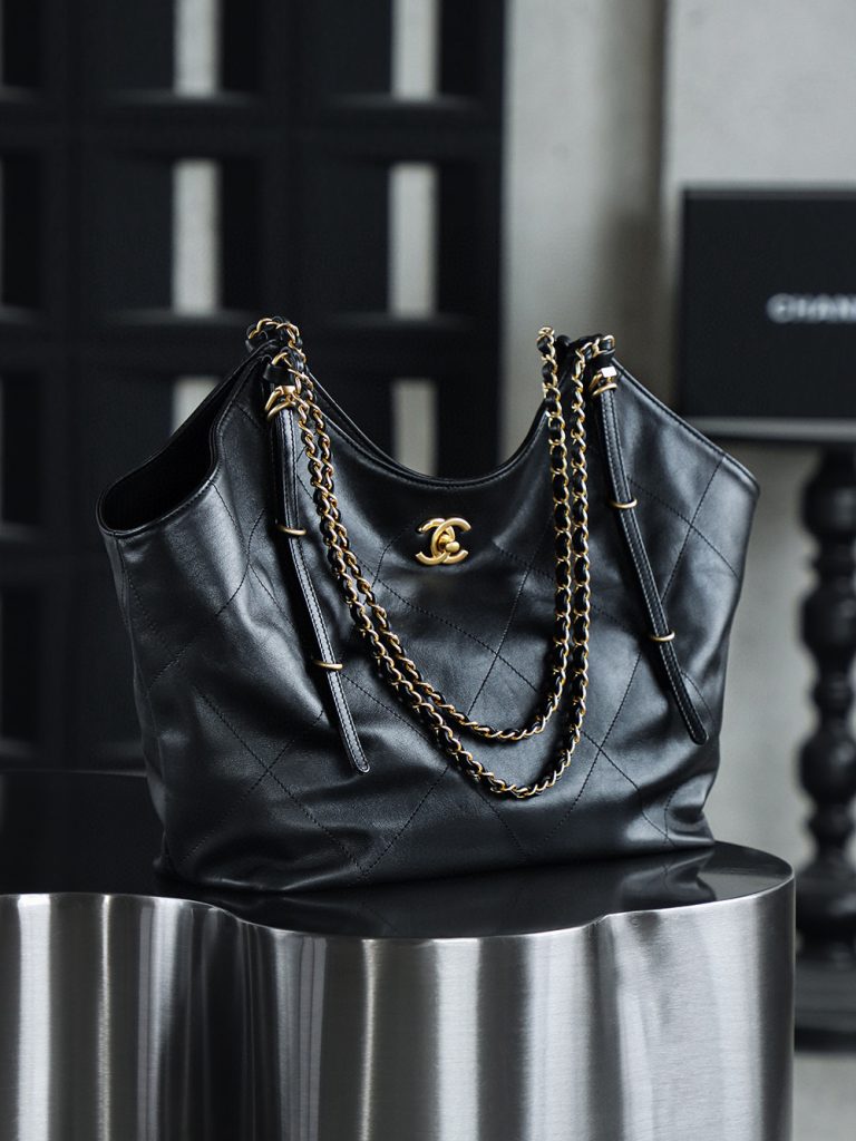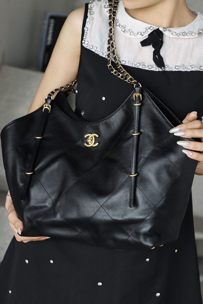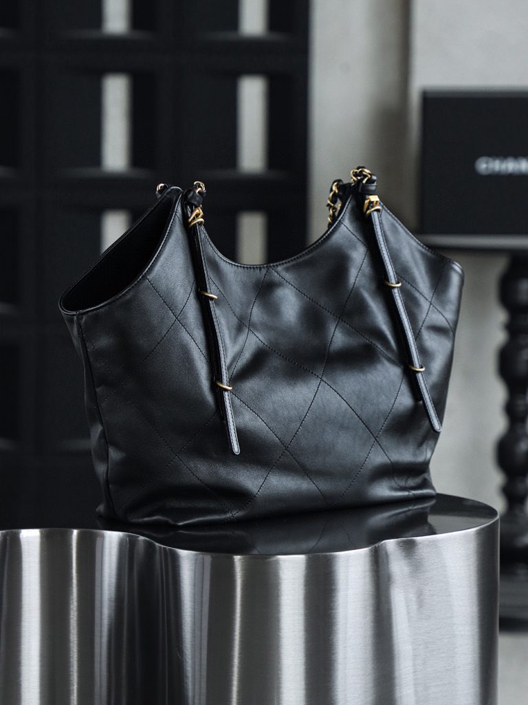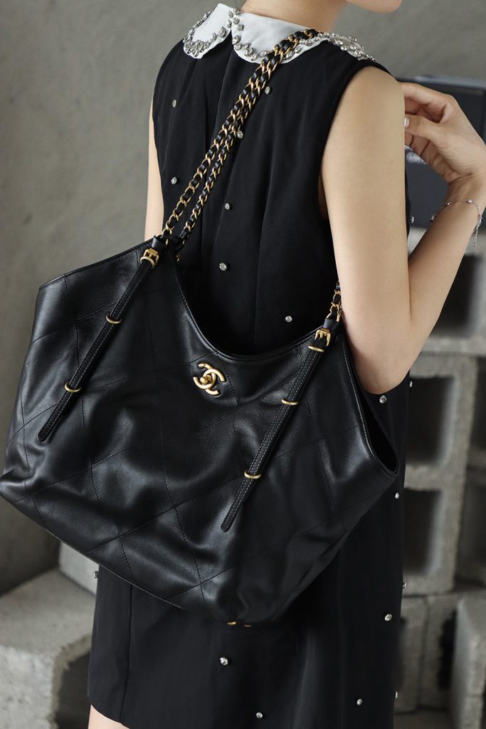 The Chanel 25S Maxi Tote Bag is a departure from the previous dazzling and eye-catching styles. This time, the black quilted body is directly adorned with two metal chains, exuding an impeccable vintage charm! The fine texture of the calfskin and the chain shoulder strap create a look that is both laid-back and glamorous. When worn over the shoulder, it gives off a languid superstar vibe, while carrying it by hand makes you walk with a cool and confident stride.