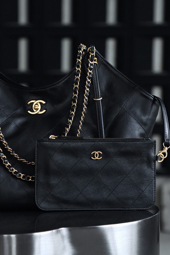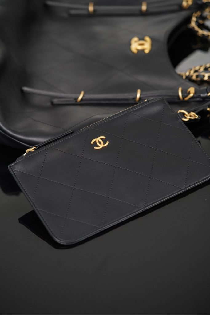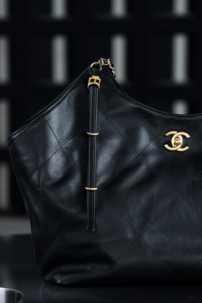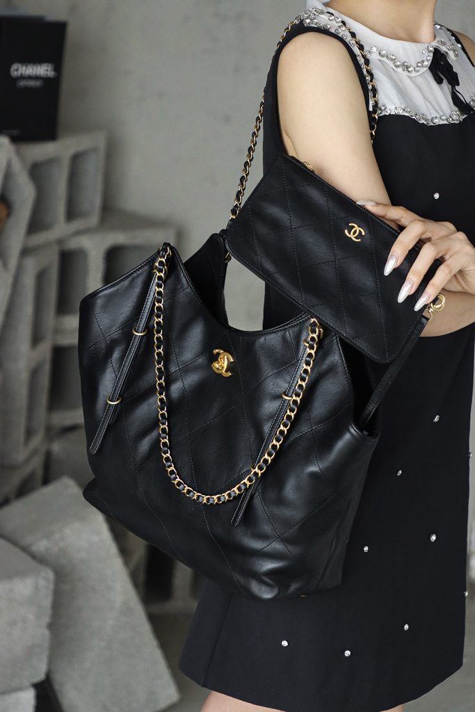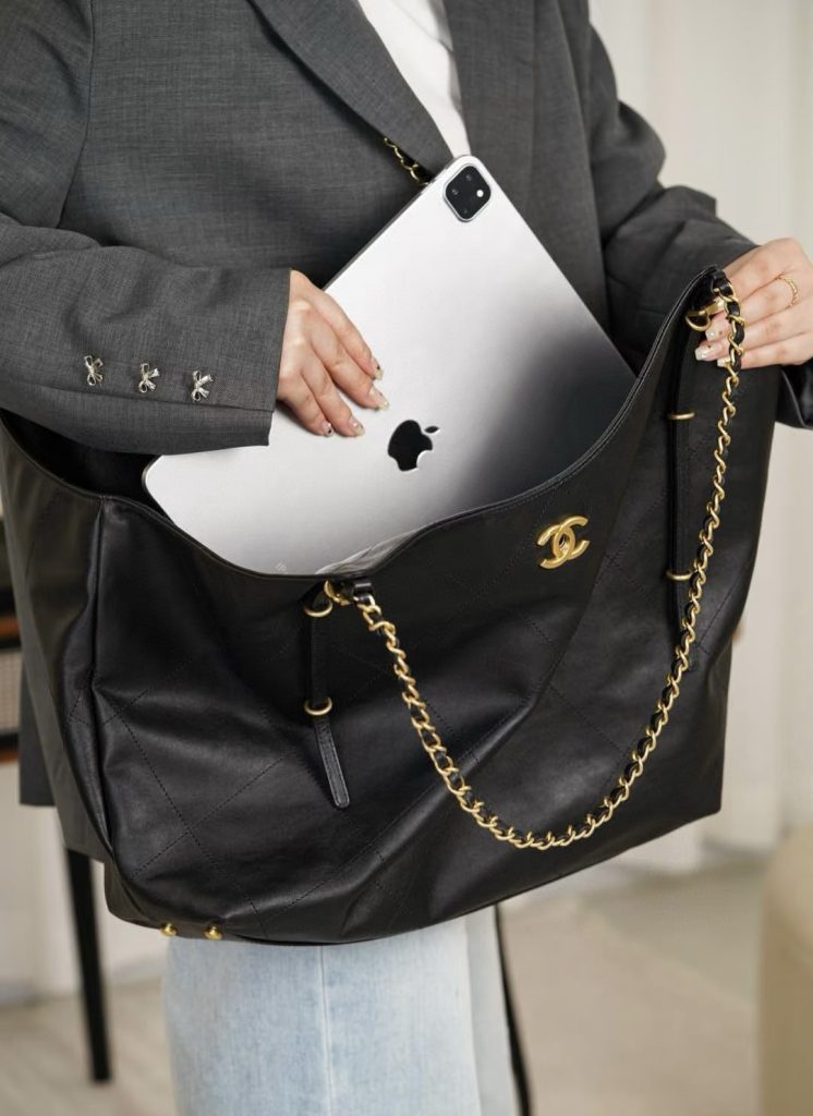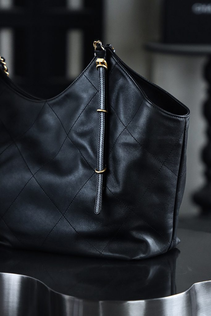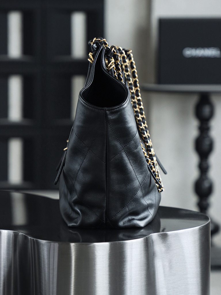 The Chanel 25S Maxi Tote Bag is a departure from the previous dazzling and eye-catching styles. This time, the black quilted body is directly adorned with two metal chains, exuding an impeccable vintage charm! The fine texture of the calfskin and the chain shoulder strap create a look that is both laid-back and glamorous. When worn over the shoulder, it gives off a languid superstar vibe, while carrying it by hand makes you walk with a cool and confident stride.