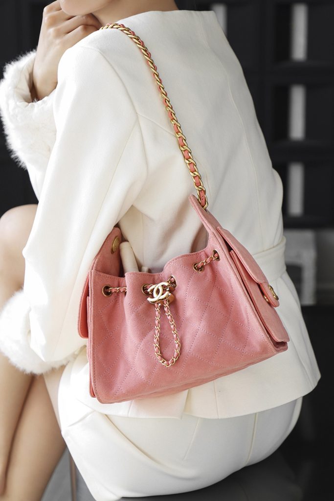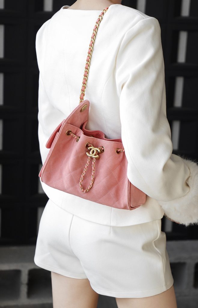 The Chanel 26C 25 Mini Handbag in Pink Suede was one of the standout highlights on the runway. Its soft suede finish perfectly blends effortless ease with timeless vintage charm.