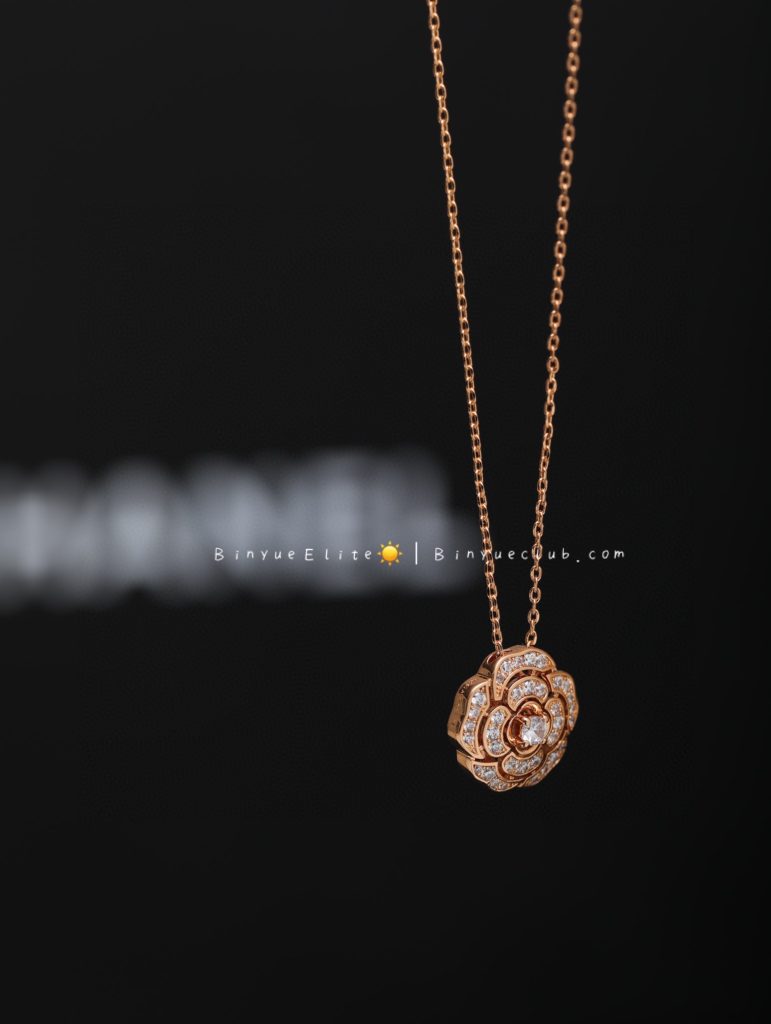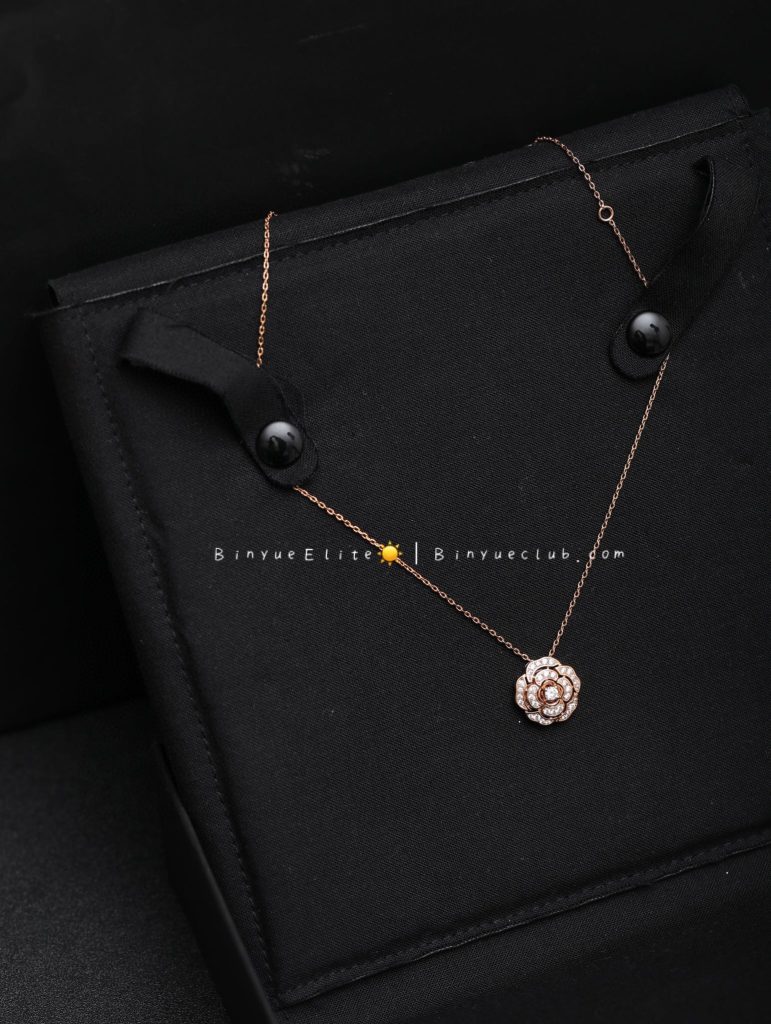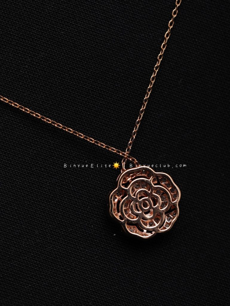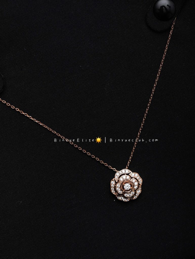 This exquisite necklace features a beautiful camellia flower design adorned with sparkling diamonds. The combination of copper metal and the camellia flower with diamond accents makes it a luxurious and elegant piece of jewelry.