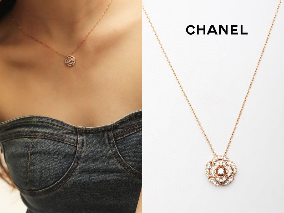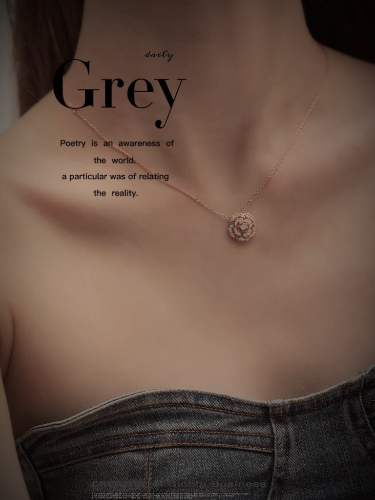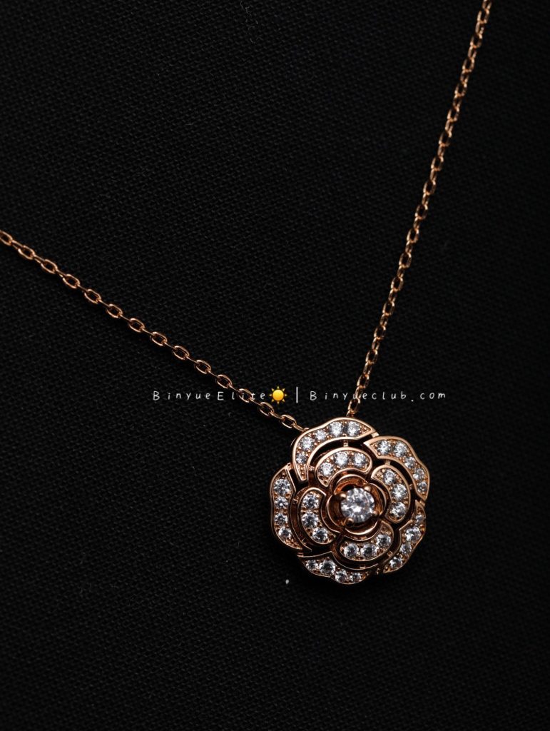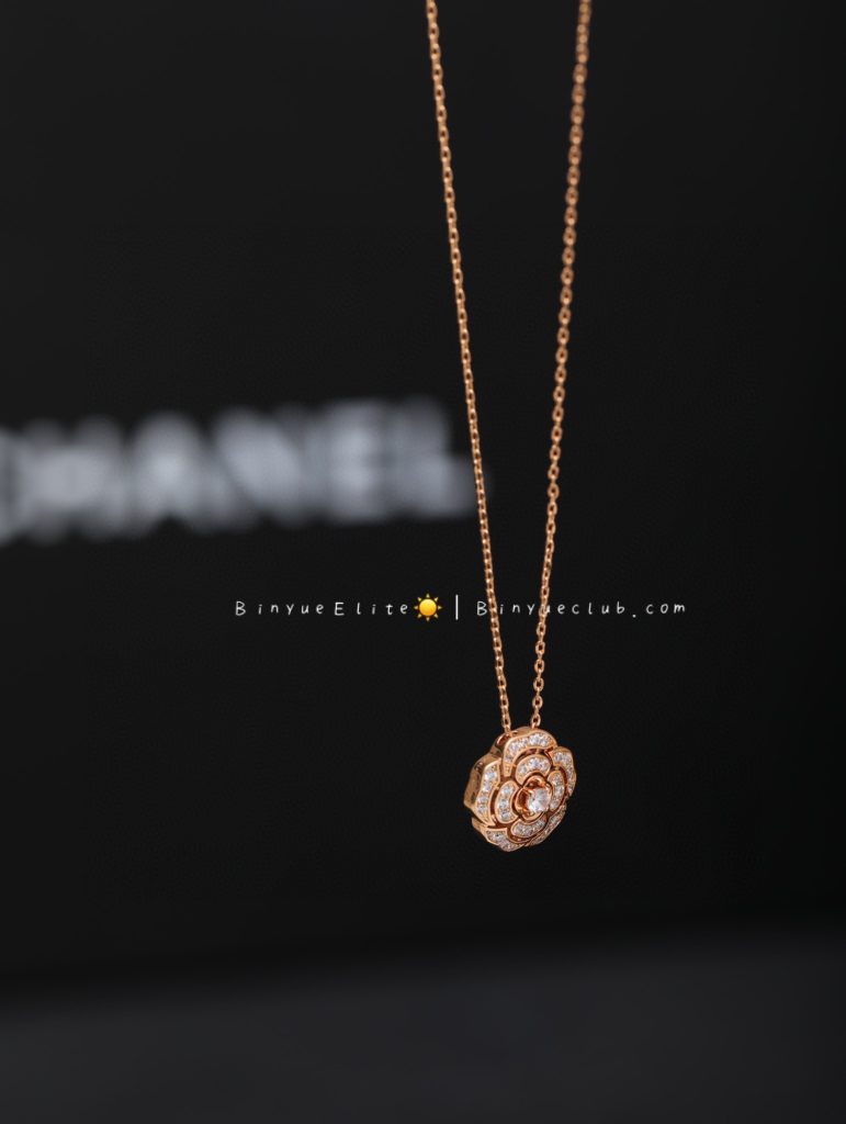 This exquisite necklace features a beautiful camellia flower design adorned with sparkling diamonds. The combination of copper metal and the camellia flower with diamond accents makes it a luxurious and elegant piece of jewelry.