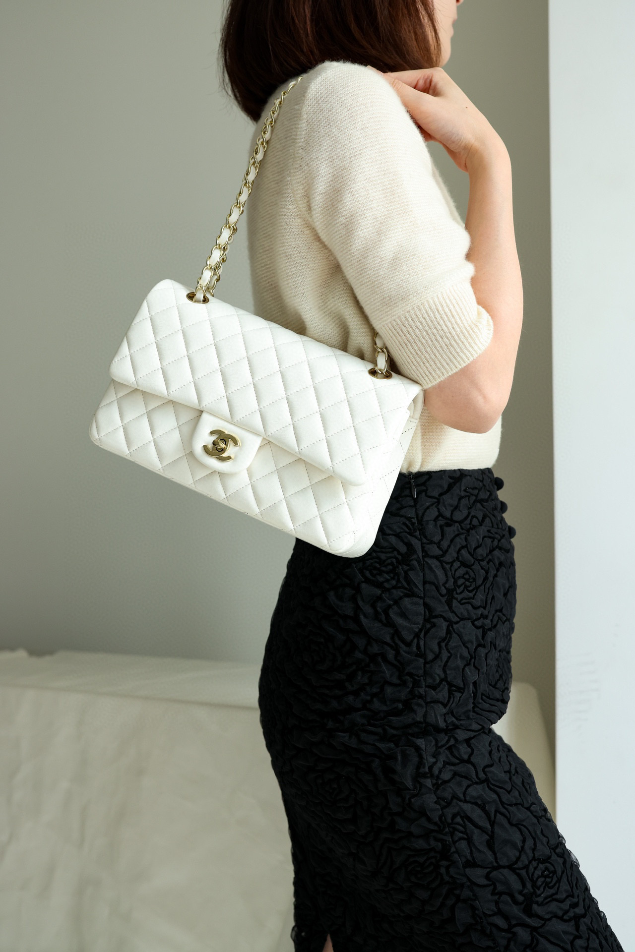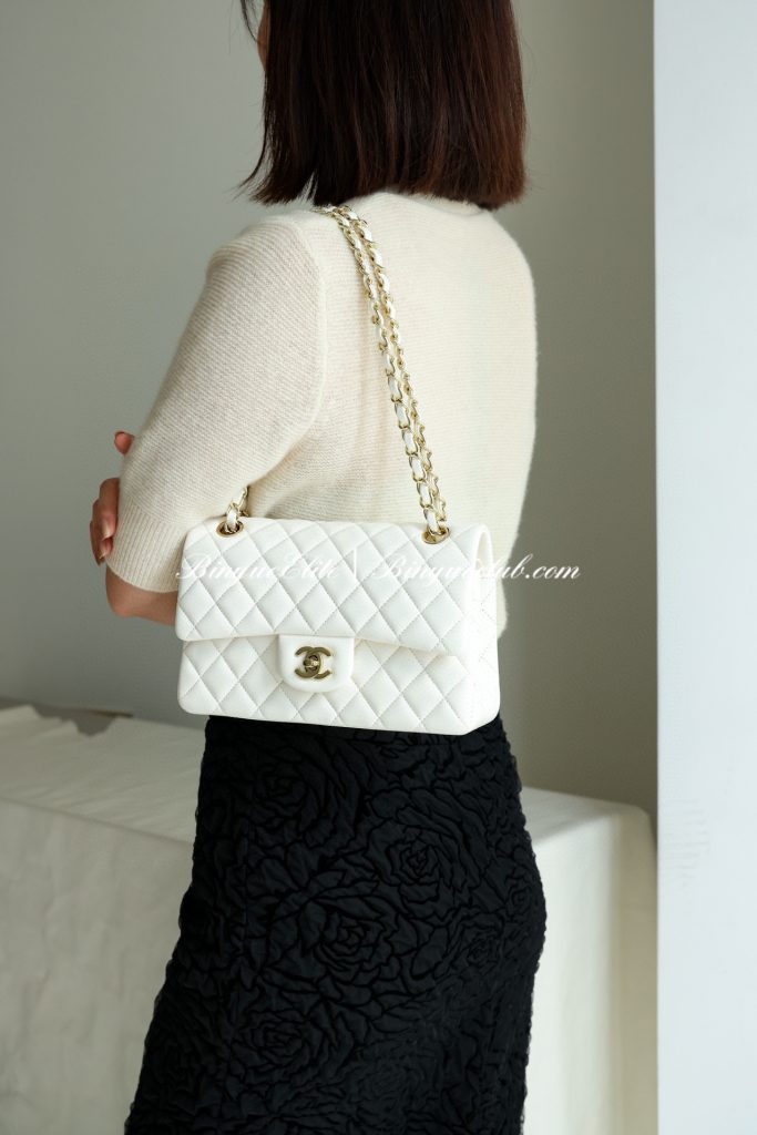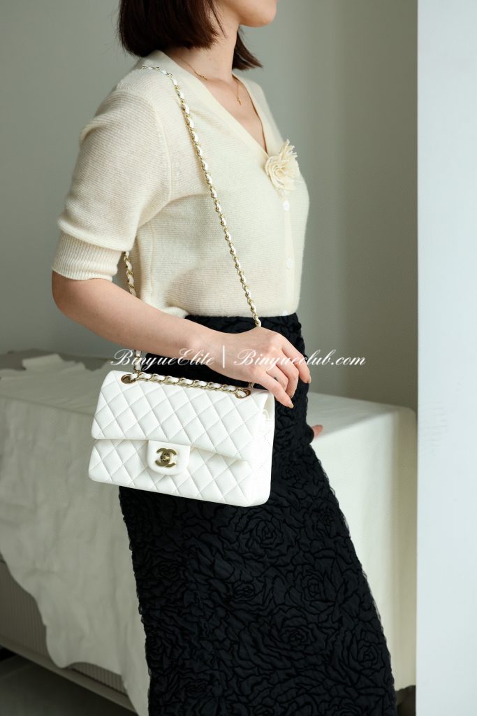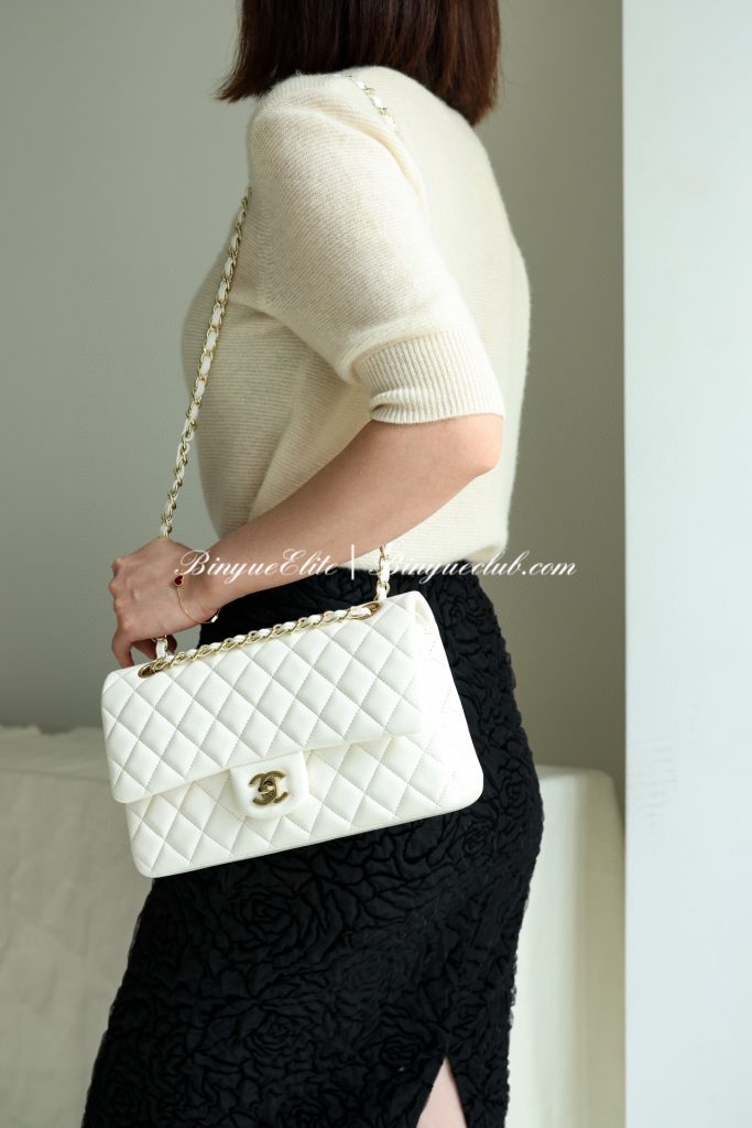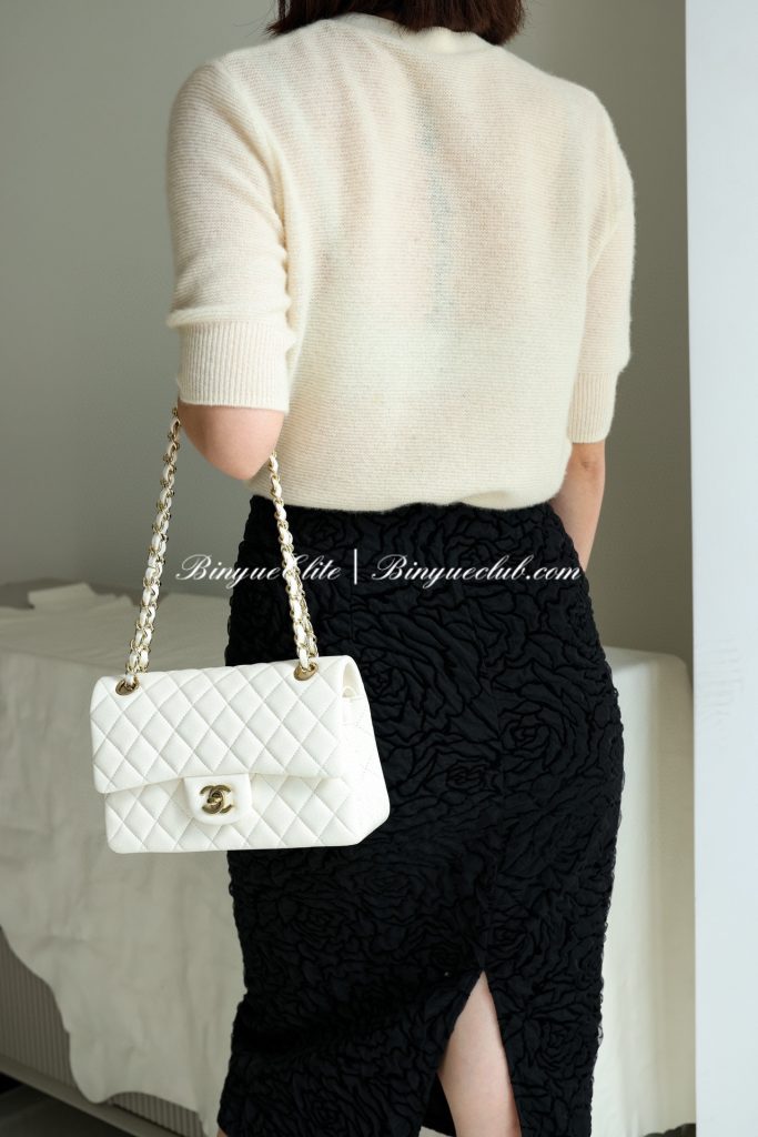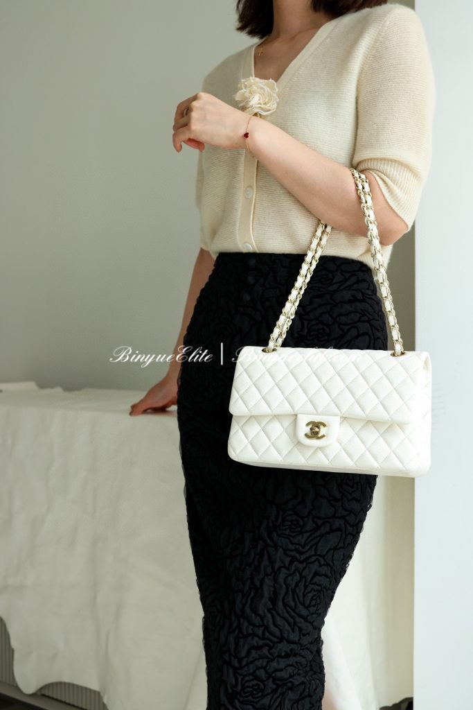 HomeBagsChanel Classic Flap in white 23/25cm lambskin BagsChanel Chanel Classic Flap in white 23/25cm lambskin August 31, 2023 338 0 FacebookTwitterPinterestWhatsApp Everyone knows that we rarely have white flaps because the original factory leather is hard to get. Now we finally have a small quantity available. Don’t miss out! Tagscrossbody bagFlapshoulderbag FacebookTwitterPinterestWhatsApp Previous articleChanel๏ฝNewest version of the 23 Golden Ball CF ๏ผwhite and pink๏ผNext articleChanel๐Classic Flap ๏ฝOriginal leather Binyuehttp://www.binyueclub.com RELATED ARTICLES Bags ๐๐ก๐๐ง๐๐ฅ 25K WOC in Black Bags Chanel 19 Bag โ Small, Black & Silver Bags Chanel 19 Bag โ Medium, Black & Gold Subscribe Login Notify of new follow-up comments new replies to my comments Label {} [+] Name* Email* Website Label {} [+] Name* Email* Website 0 Comments Oldest Newest Most Voted Inline Feedbacks View all comments Popular posts Belt&Accessories Binyue - December 14, 2025 ๐๐จ๐ฎ๐ข๐ฌ ๐๐ฎ๐ข๐ญ๐ญ๐จ๐ง โGradient Jacquard Ring Cashmereโ Scarf โ Blue Belt&Accessories December 14, 2025 ๐๐ก๐๐ง๐๐ฅ 25K WOC in Black Bags December 14, 2025 Chanel 19 Bag โ Small, Black & Silver Bags December 5, 2025 Chanel 19 Bag โ Medium, Black & Gold Bags December 5, 2025 Popular categoriesBags785Chanel303Outfit of the Day139Dior113Hermes108LV104 My favoritesBelt&AccessoriesBinyue - December 14, 20250Belt&Accessories๐๐จ๐ฎ๐ข๐ฌ ๐๐ฎ๐ข๐ญ๐ญ๐จ๐ง โGradient Jacquard Ring Cashmereโ Scarf โ BlueBinyue - December 14, 20250Bags๐๐ก๐๐ง๐๐ฅ 25K WOC in BlackBinyue - December 14, 20250BagsChanel 19 Bag โ Small, Black & SilverBinyue - December 5, 20250BagsChanel 19 Bag โ Medium, Black & GoldBinyue - December 5, 20250