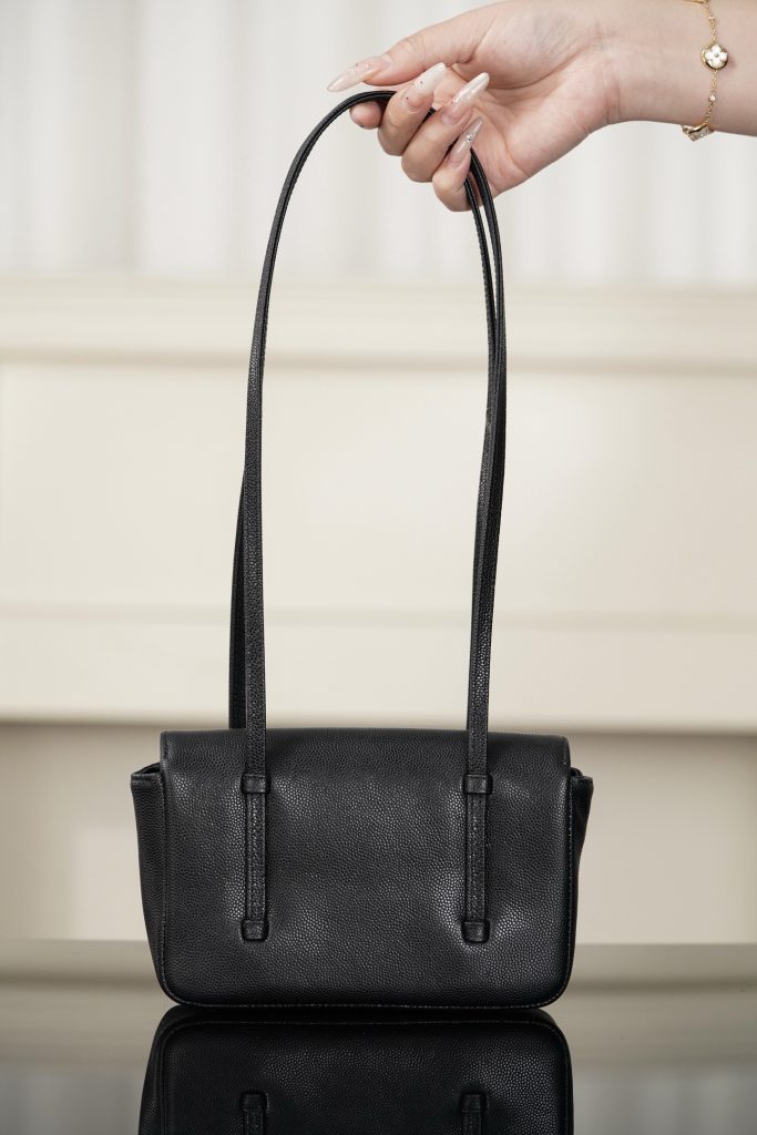 The design is clean and understated: two slim leather top handles, a structured flap, and the iconic double-C closure. It doesn’t ask you to dress up for it. It feels like a bag you can grab on the way out the door—effortless, relaxed, but still unmistakably chic.