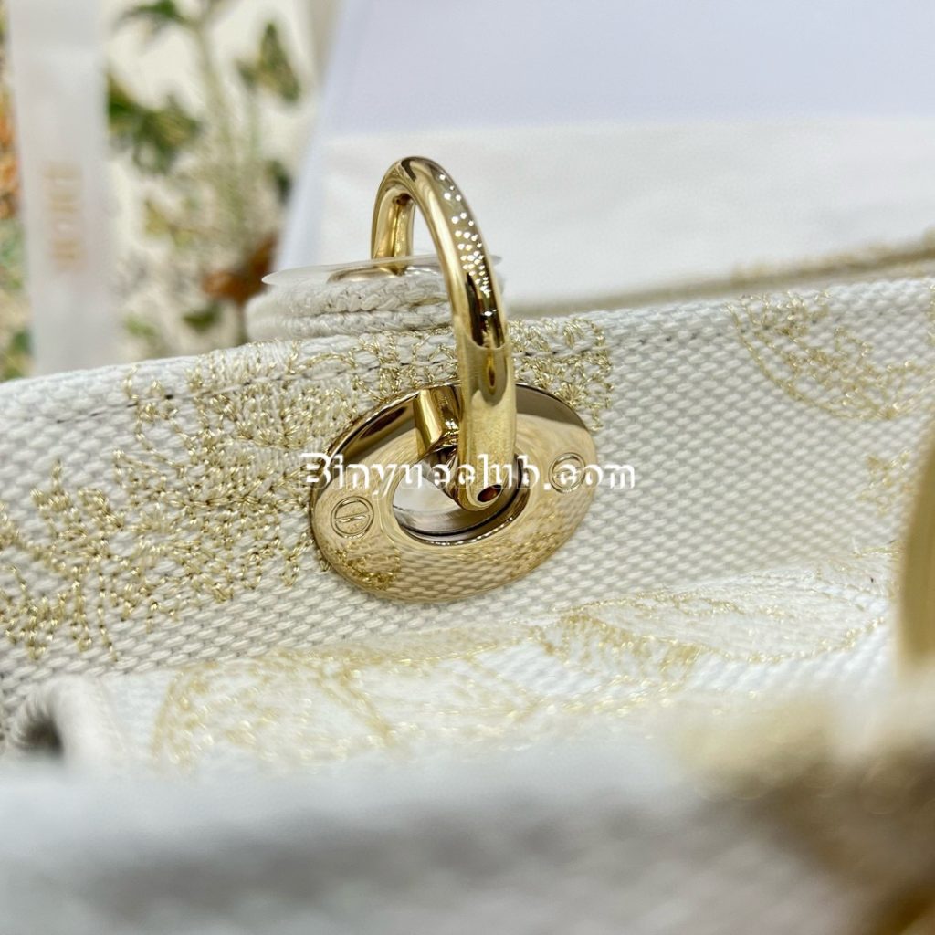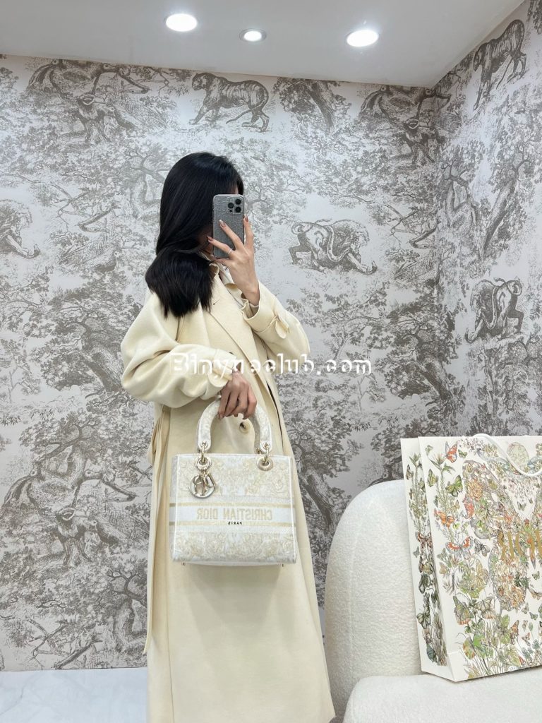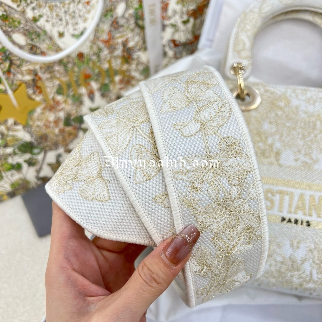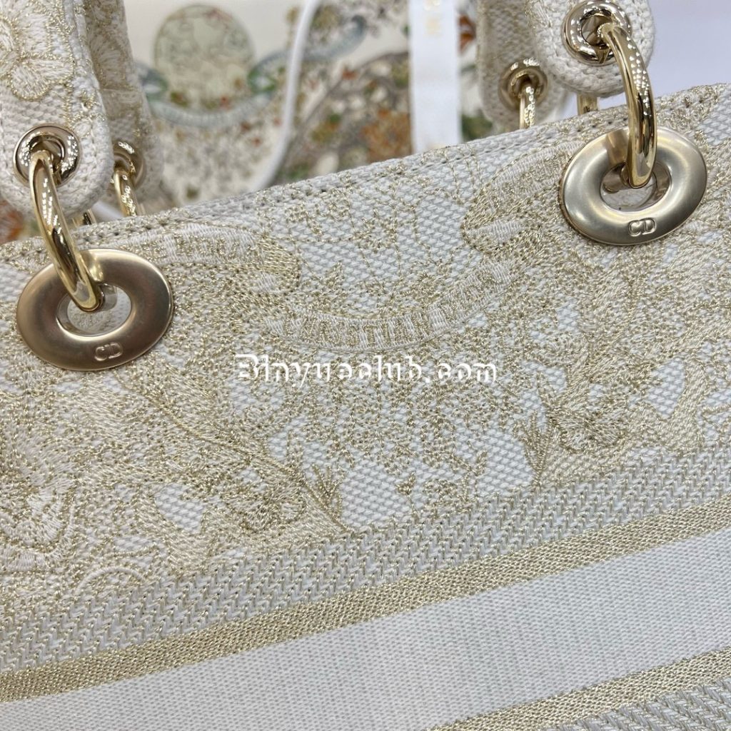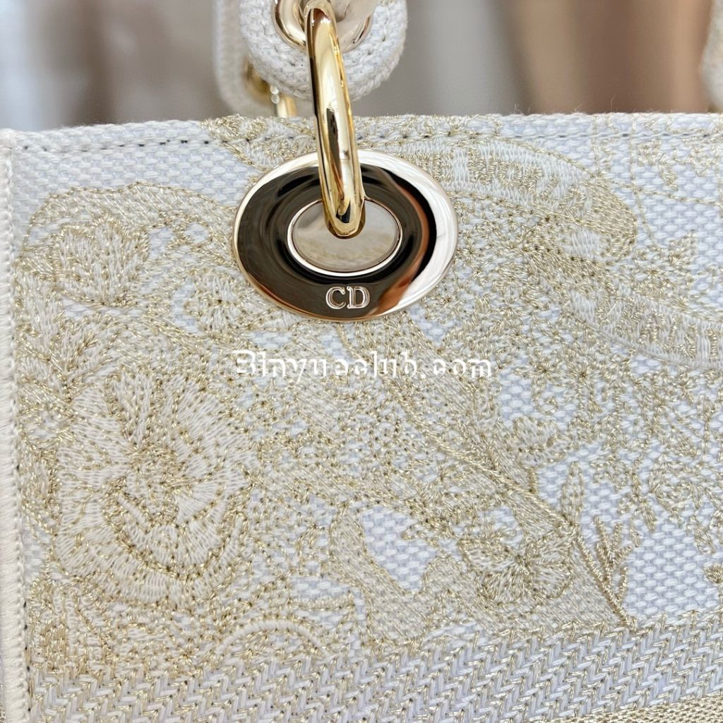 The fabric used in this Princess Diana-inspired bag is truly unique. It’s a shimmering and luxurious platinum shade that exudes warmth and richness. The warm, creamy white color beautifully complements the intricate gold thread embroidery, creating a perfect Christmas atmosphere.