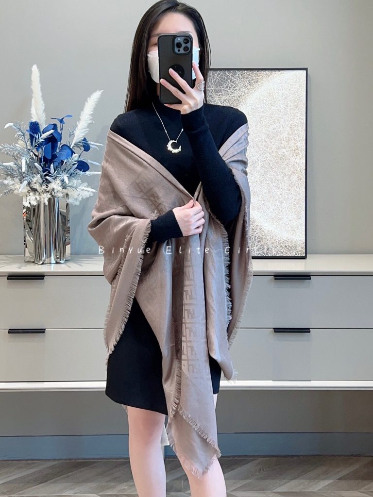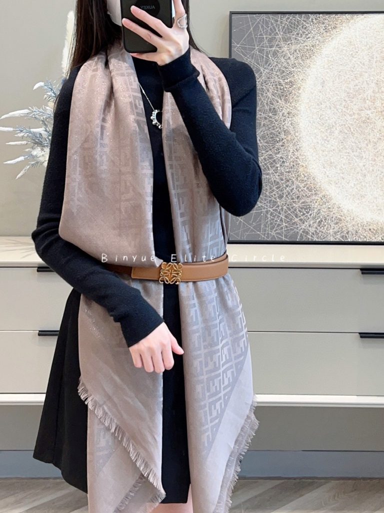 The double F jacquard shawl is an elegant and versatile piece, showcasing a luxurious pearl-like texture on both sides. The fabric is soft and of moderate thickness, making it a must-have for outings! It adds layers and depth to the overall outfit, offering a variety of styling options. Highly recommended as an essential item for early autumn ๐