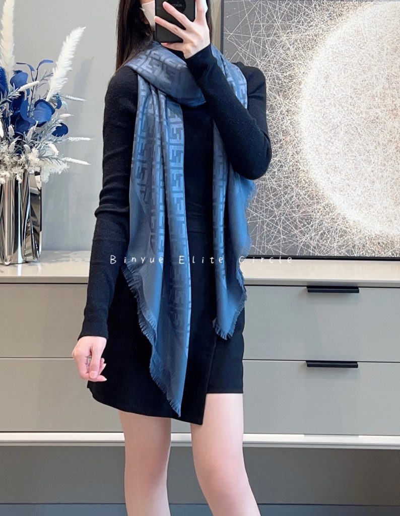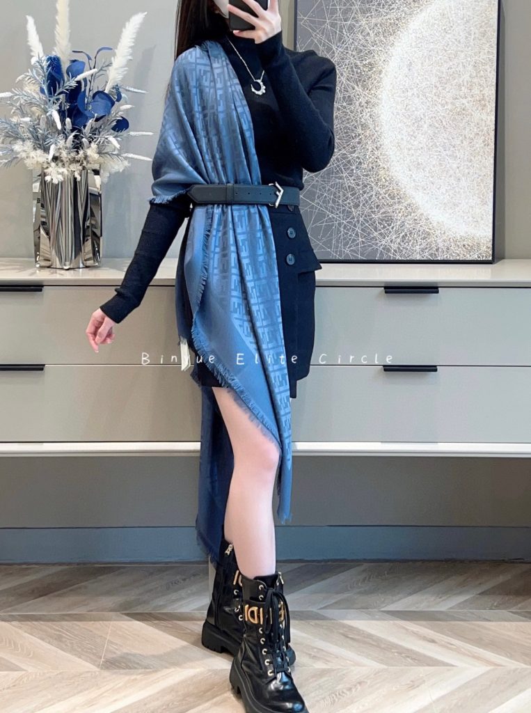 The double F jacquard shawl is an elegant and versatile piece, showcasing a luxurious pearl-like texture on both sides. The fabric is soft and of moderate thickness, making it a must-have for outings! It adds layers and depth to the overall outfit, offering a variety of styling options. Highly recommended as an essential item for early autumn ๐