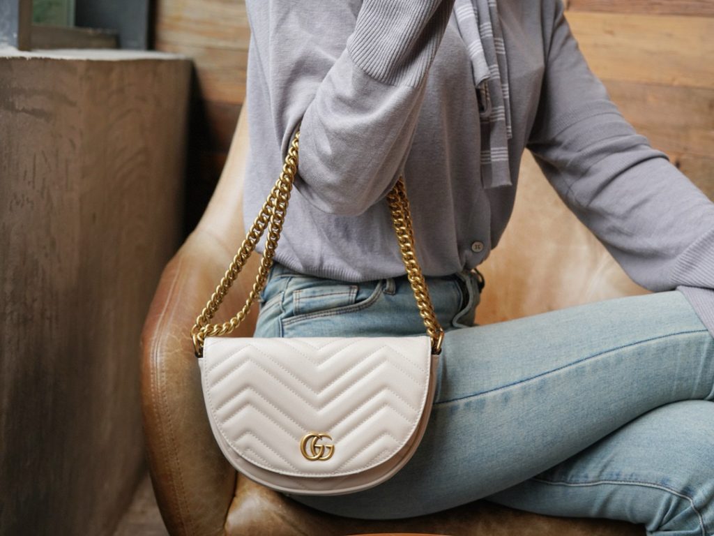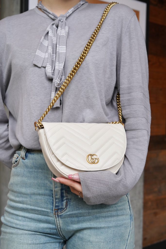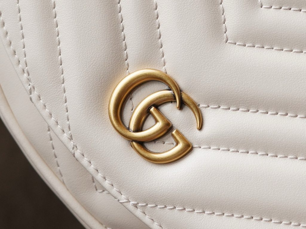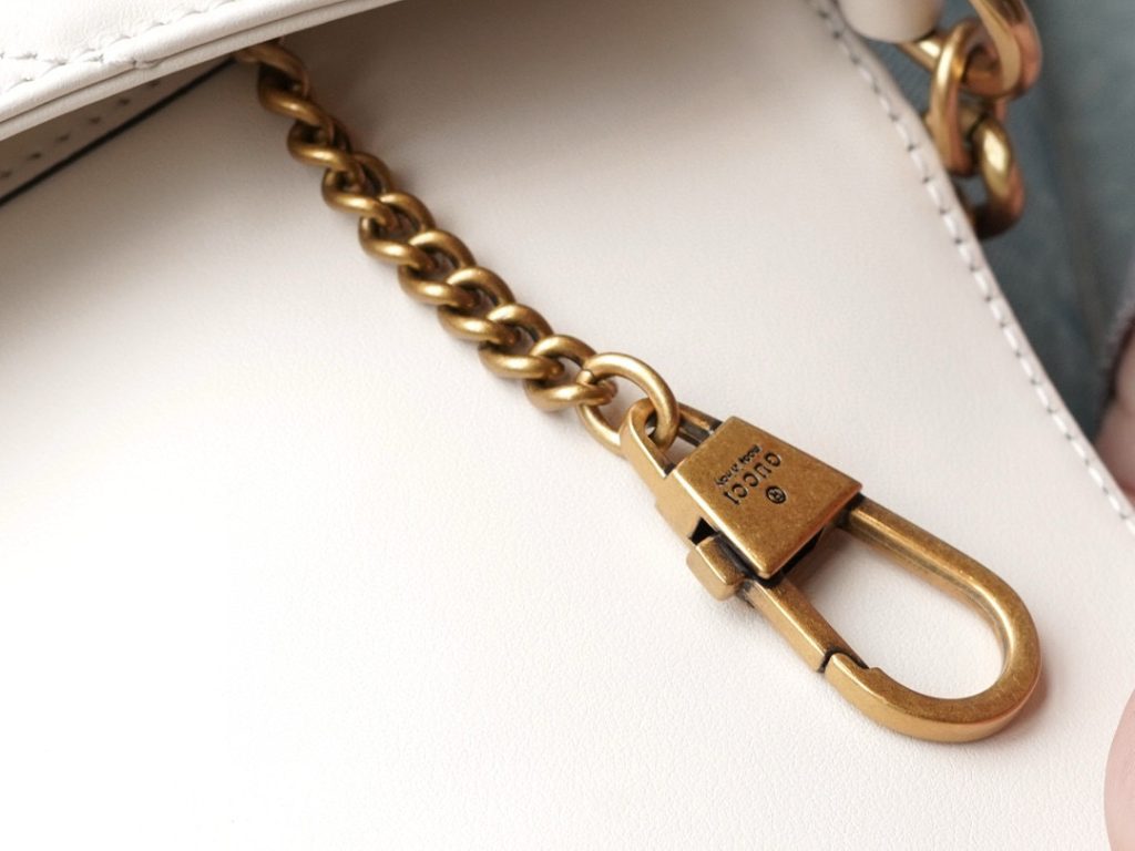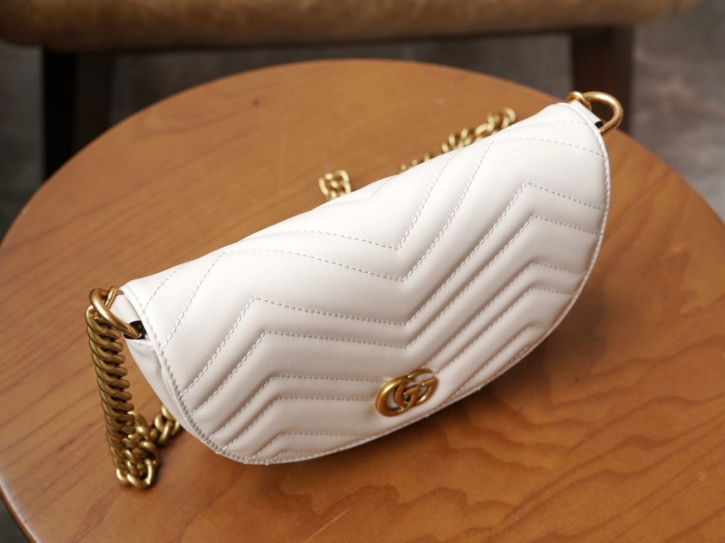The Double G hardware design infuses traditional elements into the brand’s modern style, creating timeless pieces for your wardrobe. This chain mini bag is crafted from the iconic white chevron quilted leather and features two card slots inside.
