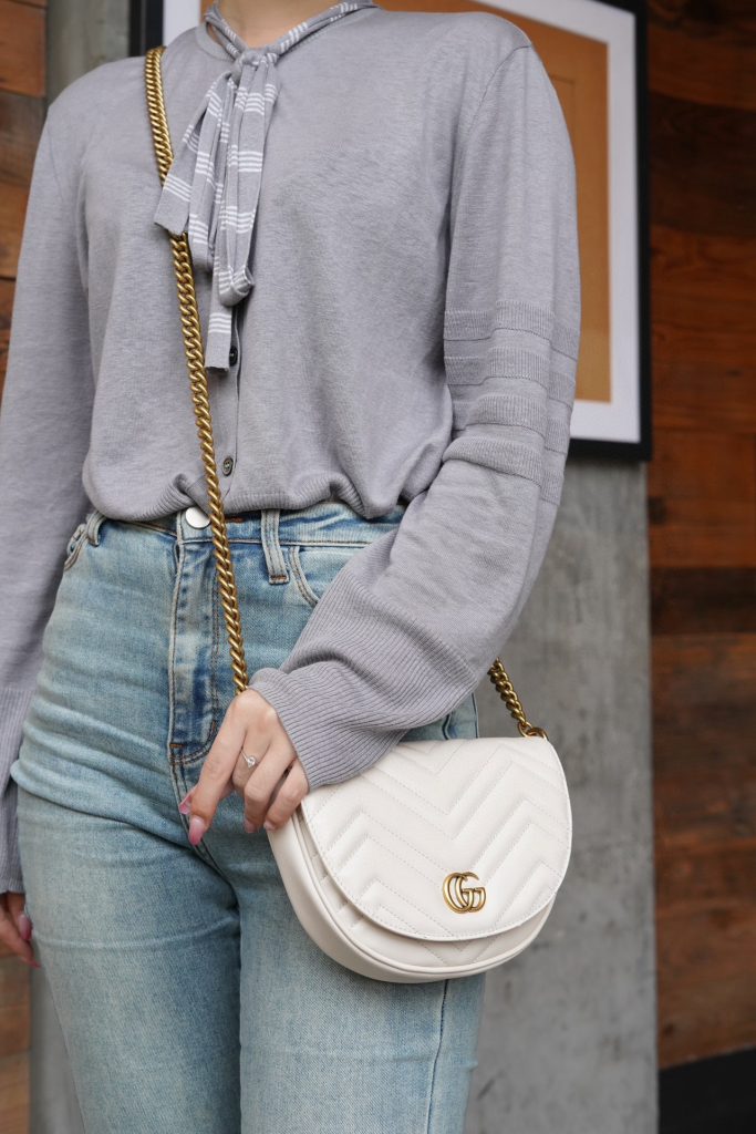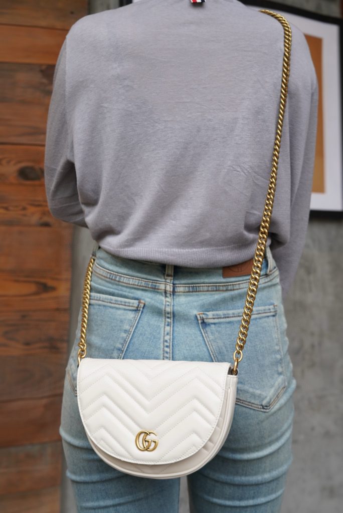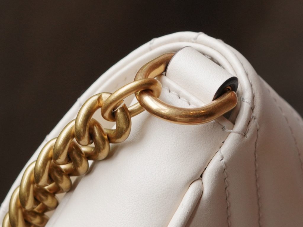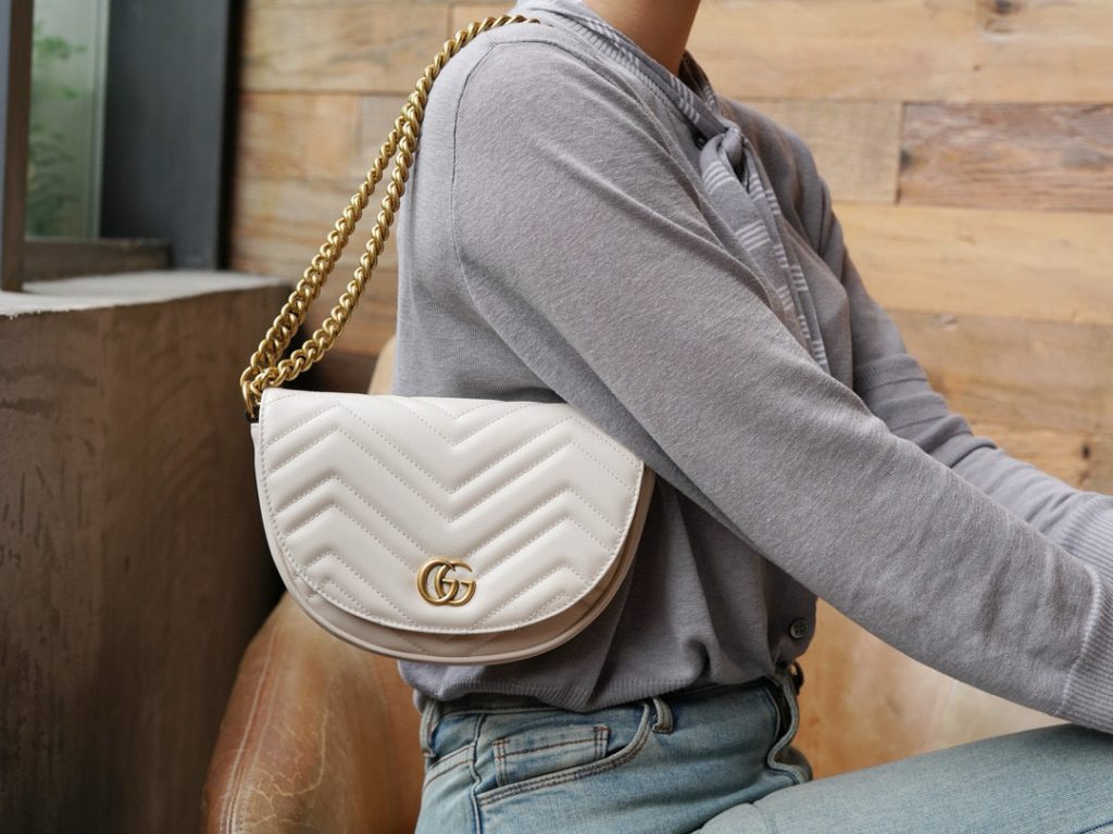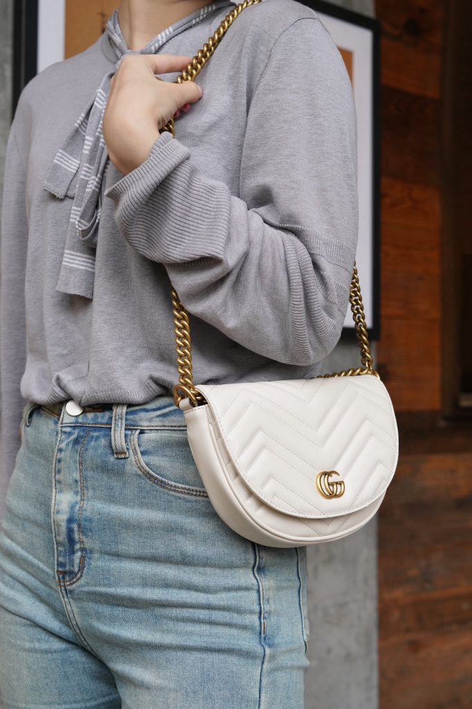 The Double G hardware design infuses traditional elements into the brand’s modern style, creating timeless pieces for your wardrobe. This chain mini bag is crafted from the iconic white chevron quilted leather and features two card slots inside.