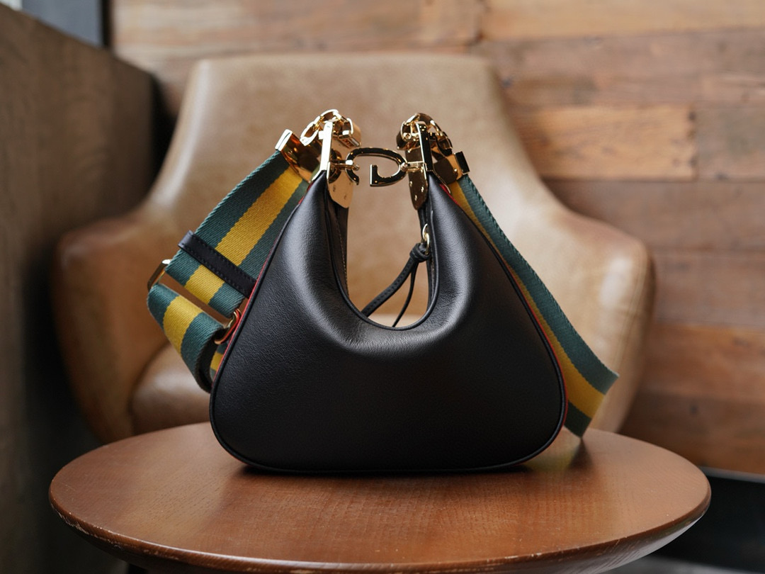 Reinterpreting the brand’s iconic elements, this accessory pays tribute to the timeless allure of Hollywood. Featuring a distinctive crescent shape and a unique G-hook closure, this small shoulder bag combines classic accessories with soft materials to evoke vintage charm in a refined and romantic manner. Made from black-colored leather with orange and black web trim.