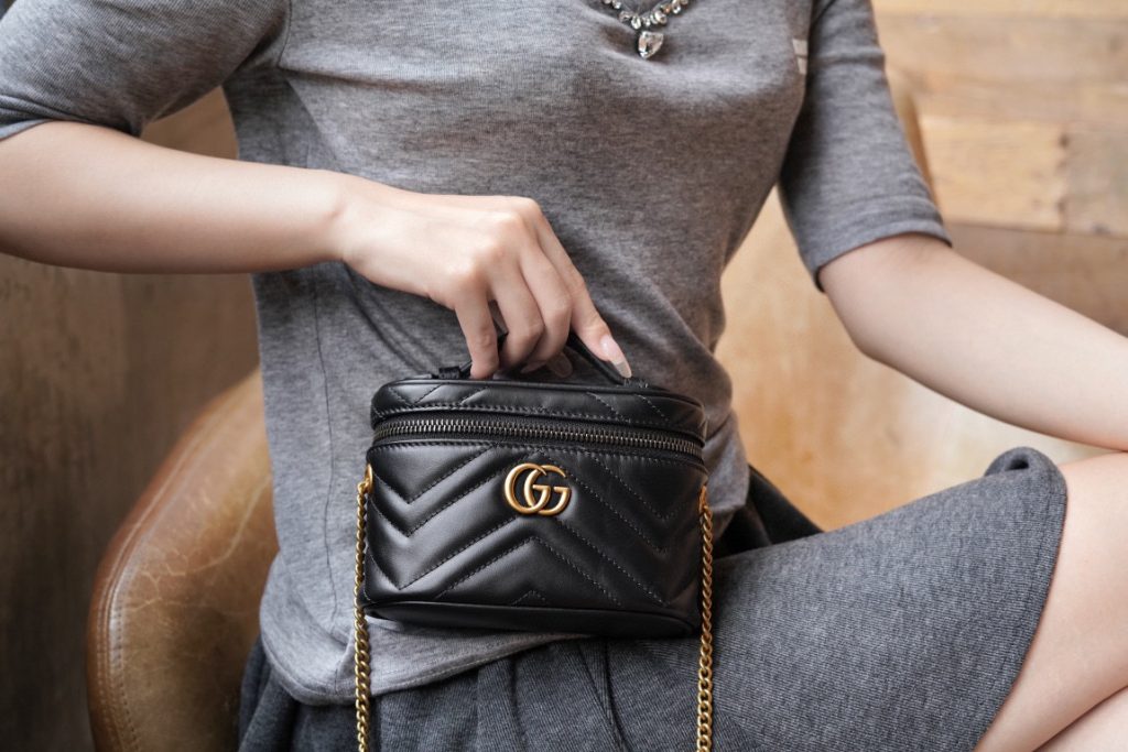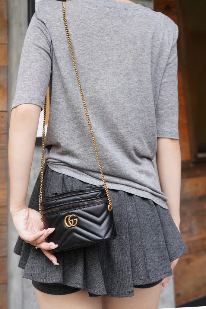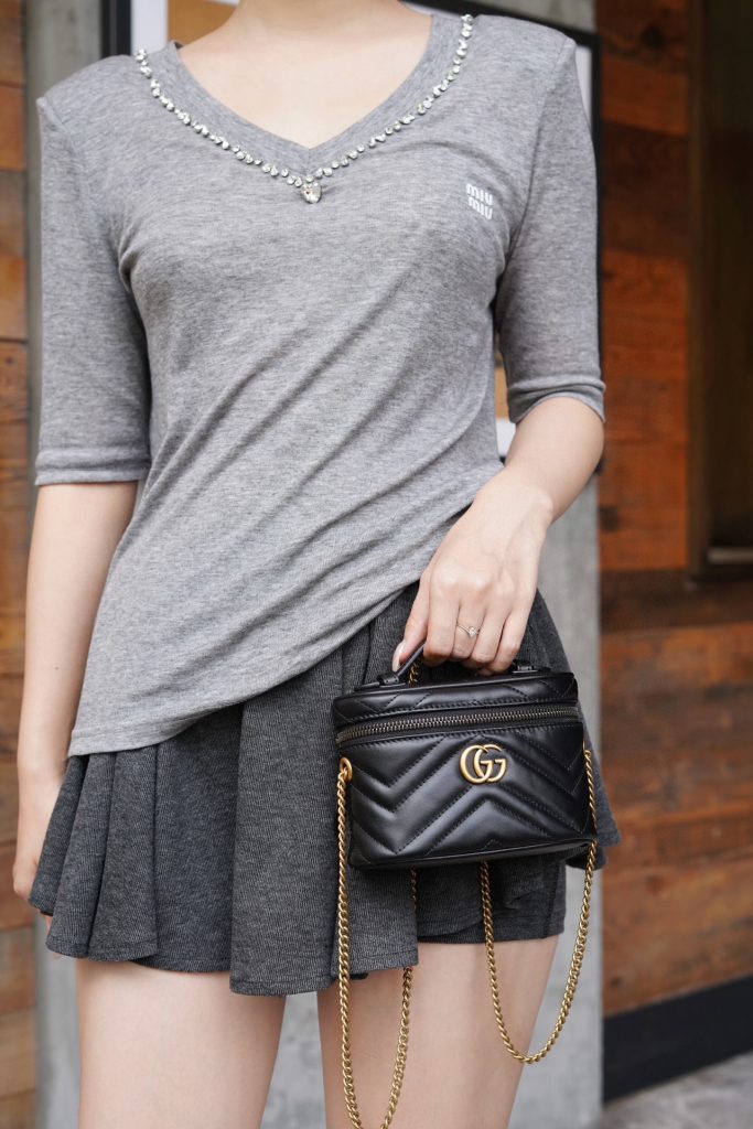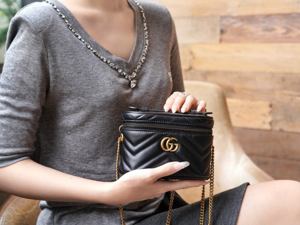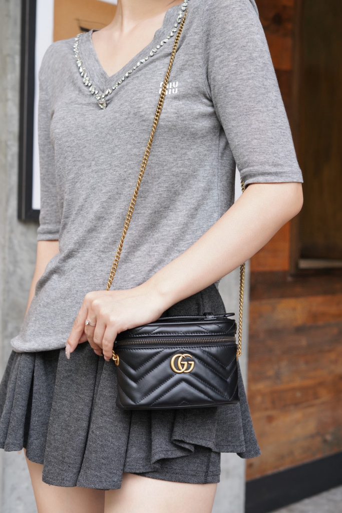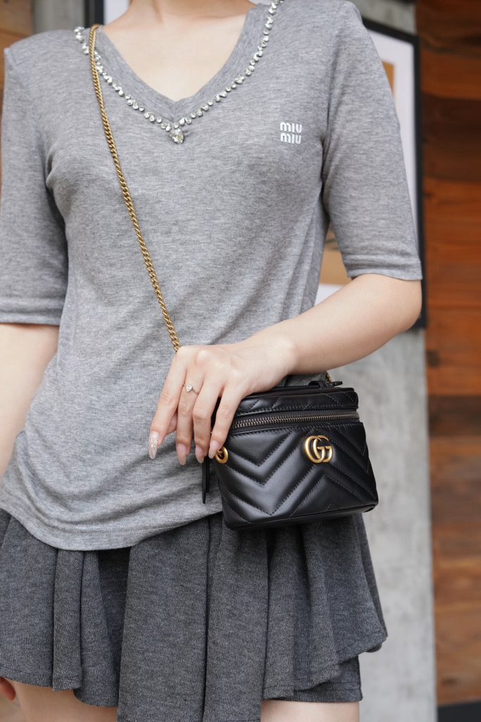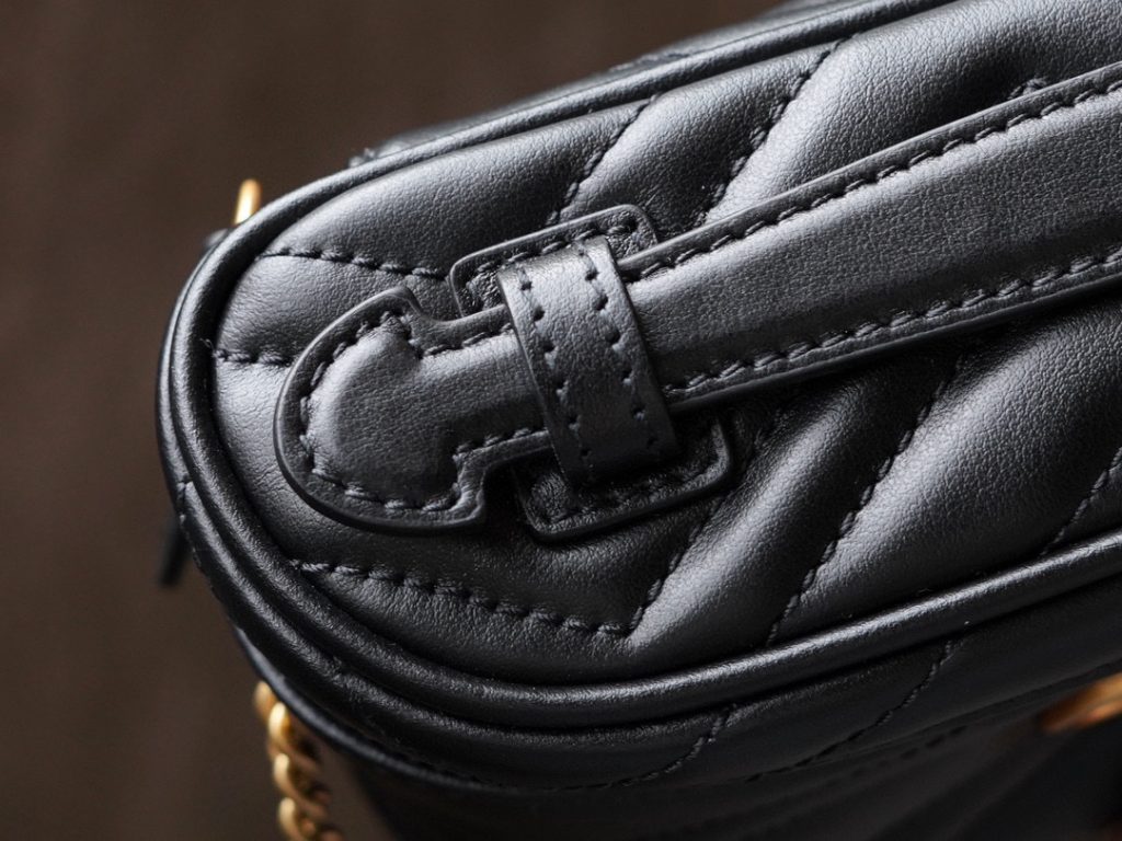 This GG Marmont series mini handbag features a full zip-around design with a top handle. Its rounded shape is adorned with the iconic white stitched V-shaped leather and double G details of the series. It also comes with a detachable chain strap, suitable for styling with various looks.