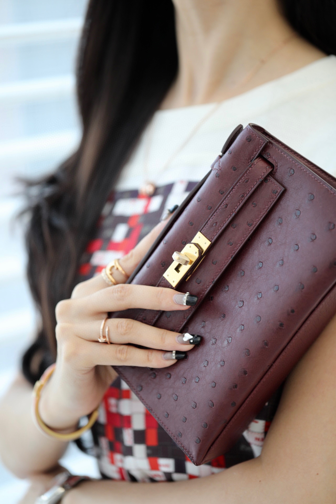 Positioned between deep reddish-brown and dark brown. In dim lighting, it appears as a deep brown color, while under warm light, it resembles grape purple. In cool lighting, there’s a hint of reddish-brown, and it’s somewhat close to ebony wood color. The meticulousness of H’s leather selection is even stricter than you can imagine. More importantly, as a rare H leather, its weight is lighter than regular leather! Moreover, ostrich leather has a high fat content, so it won’t dry out, crack, or become stiff in cold climates. Saddle Red is both elegant and vintage, pairing it with a suit exudes an intellectual beauty.