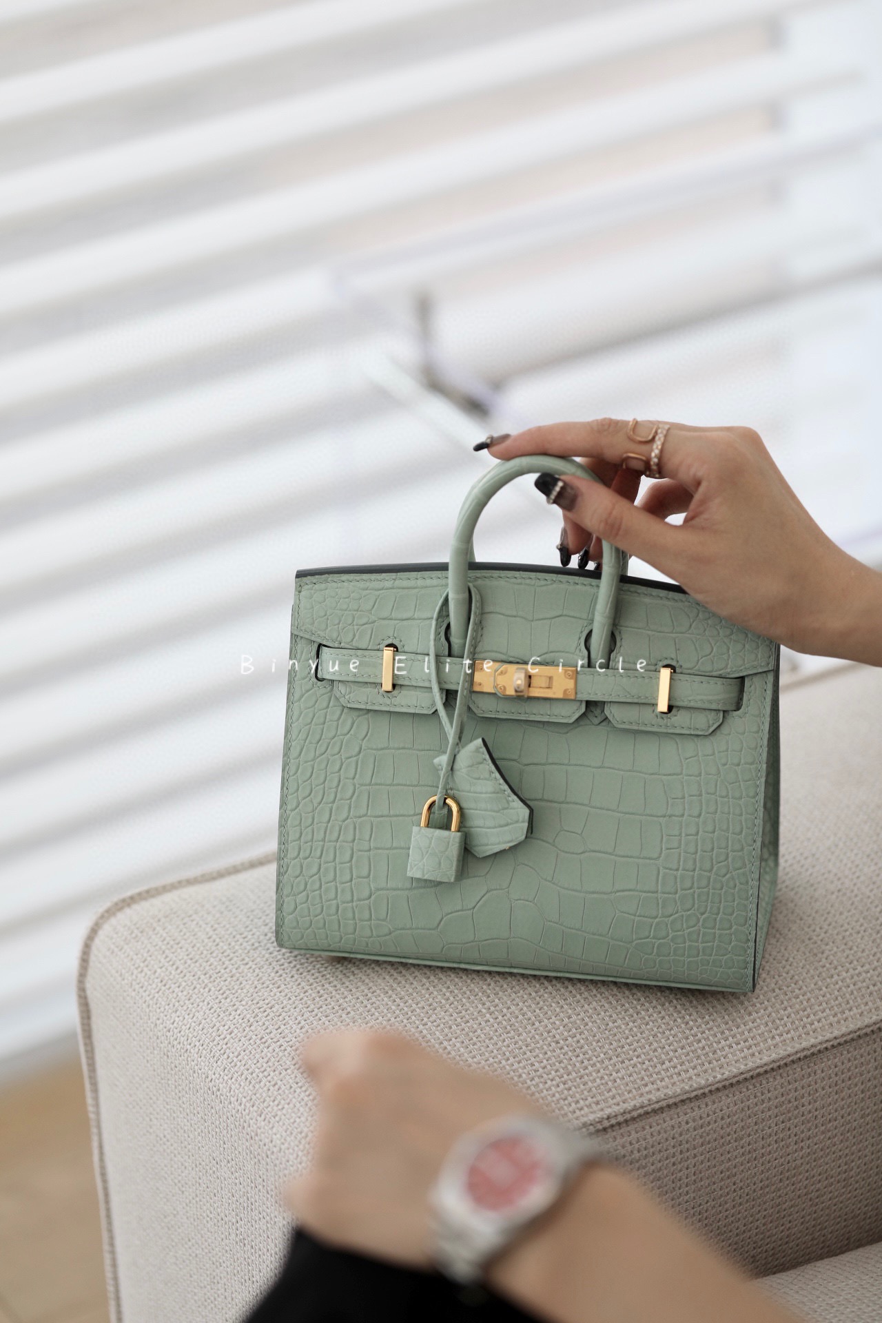 The color is a light shade of green, resembling the color of mint leaves. It falls between blue and green, making it relatively neutral in terms of color. It has low saturation and combines the tranquility of blue with the vitality of green. This BK20 model uses American matte alligator leather. American alligators are already rare, and light-colored variants are even more scarce. This is because dyeing them is challenging, requiring more complex craftsmanship, and resulting in a higher failure rate during production. Consequently, they are considered more precious. The visual appearance of mint green gives a refreshing and cooling sensation. When paired with a gold buckle, it undoubtedly adds a touch of sophistication to its sweet and youthful appeal, exuding a fresh breath even through the screen.