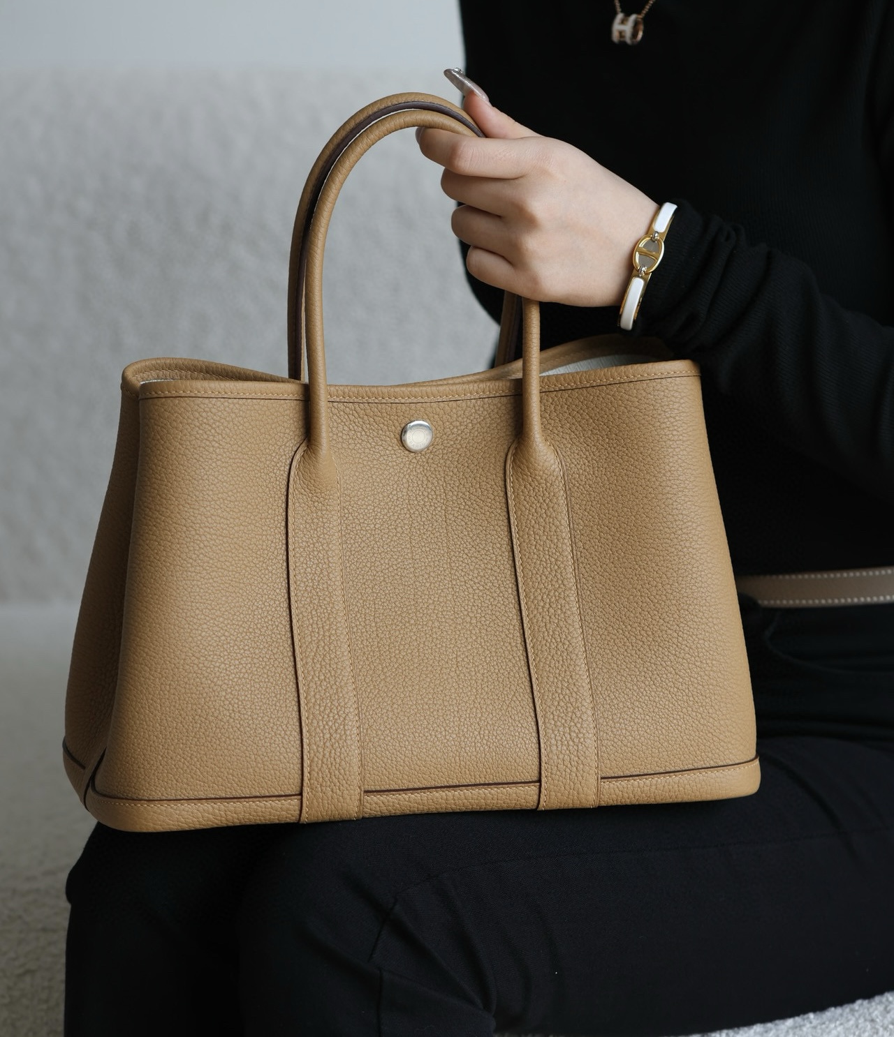 Garden Party 30 Details NE Leather Garden, also known as a shopping bag, comes in both leather and canvas versions. For more formal work occasions, you can choose the leather fabric with stable colors, such as black, elephant gray, and gold-brown, offering a casual and elegant style.