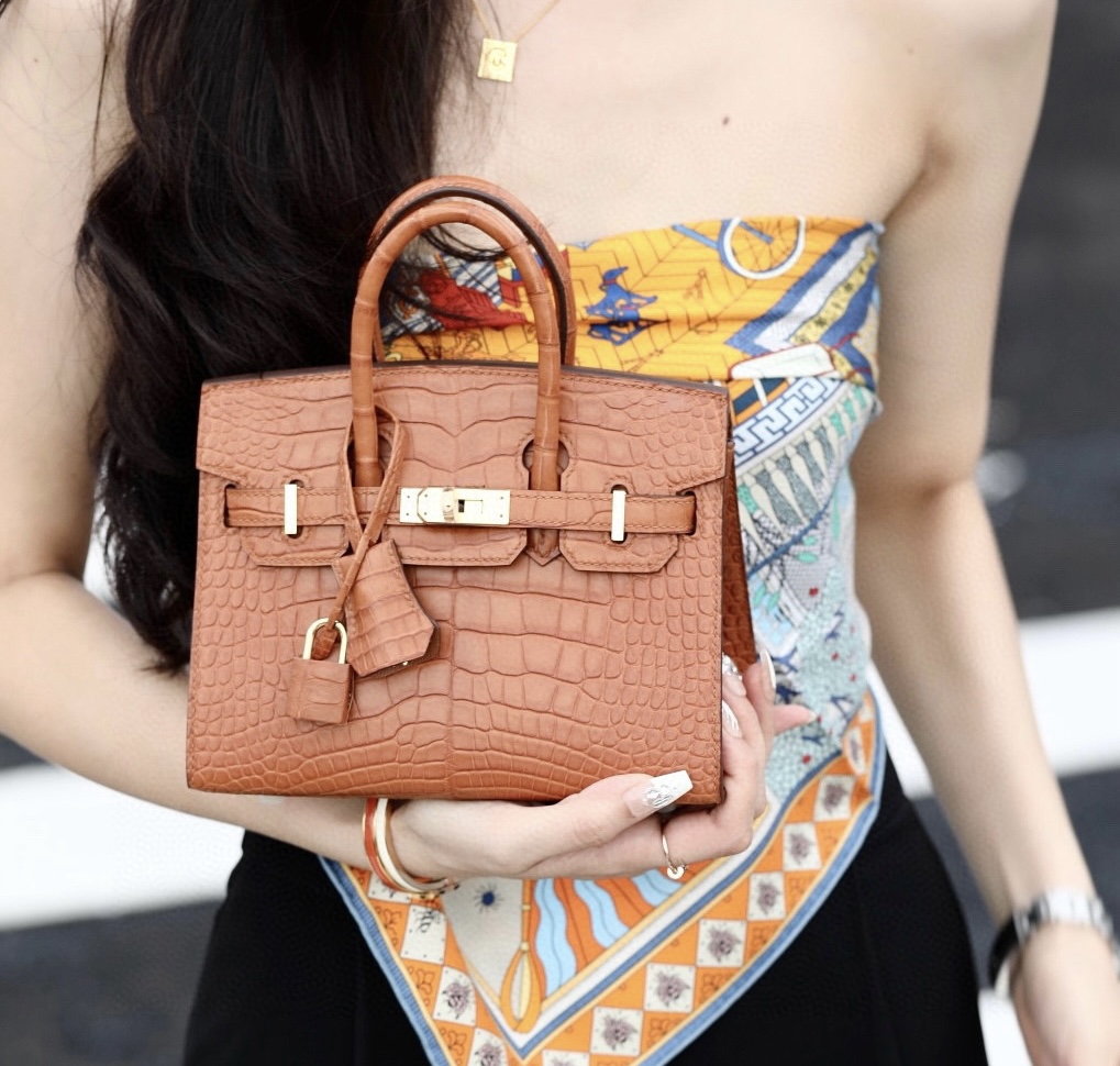 BK-20: American Alligator Matte, hand-stitched, in gold-brown, has always been the leader among the three kings, the most difficult-to-obtain color, a textured gold-brown favored by the fashion industry, and considered a collector’s item. This BK20 is made from American alligator, which lacks sweat gland pores on its scales, resulting in a surface without the small round dots commonly known as pores. The biggest advantage of matte alligator leather is its durability; the longer you use it, the shinier it becomes, with the gloss increasing over time. It must be said that the texture completely outshines all ordinary leathers, exuding an undeniable sense of luxury that cannot be concealed!