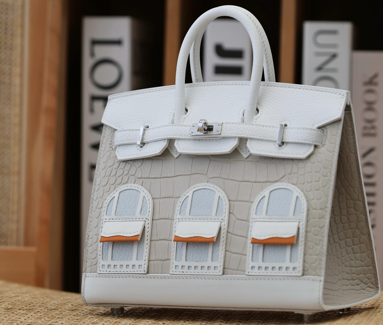 The small house is a rare exterior-seamed platinum bag. Since its launch, the small house has had four different styles, namely Black Night, White Day, Midnight, and First Snow, known as the “Four Courtyard Combination.” In terms of value preservation, First Snow ranks first among the four courtyards! The First Snow house features pure white Swift leather, orange Swift leather, pure white Togo, haze blue goat skin, and the 8L Glacier White alligator known as the “Little Himalayas.” Crafting exterior-seamed bags requires highly skilled craftsmen, so bags made from rare leather with exterior seams are always entrusted to the top craftsmen for production. In addition to the craftsmanship of the exterior-seamed body, the production of the storefront on the front also requires extremely skilled craftsmen. The First Snow house is not just a bag, but also a timeless masterpiece of beauty and luxury!
