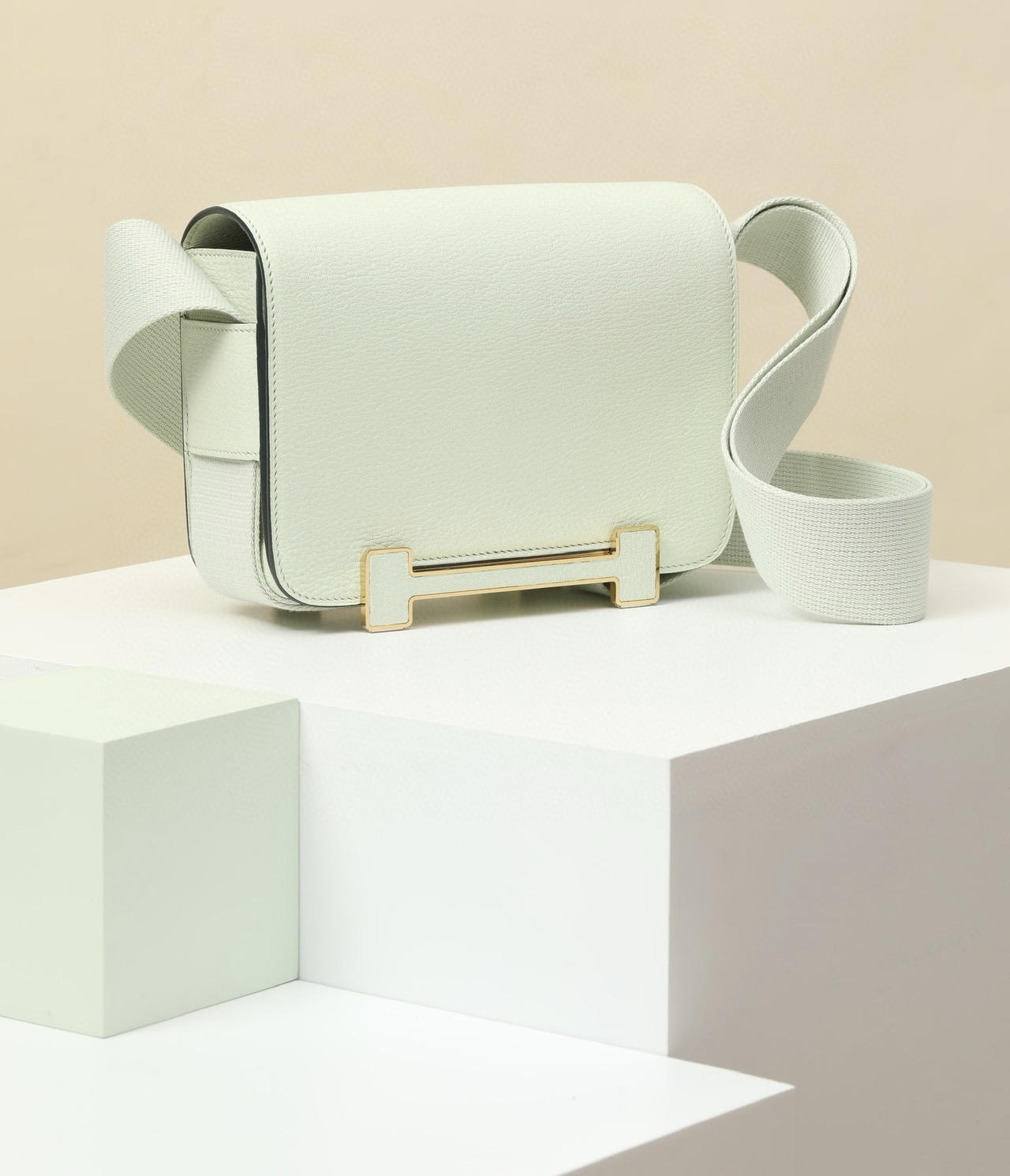 The bag is symmetrical on both sides, featuring an H clasp wrapped in leather and an H magnetic snap opening at the base.
