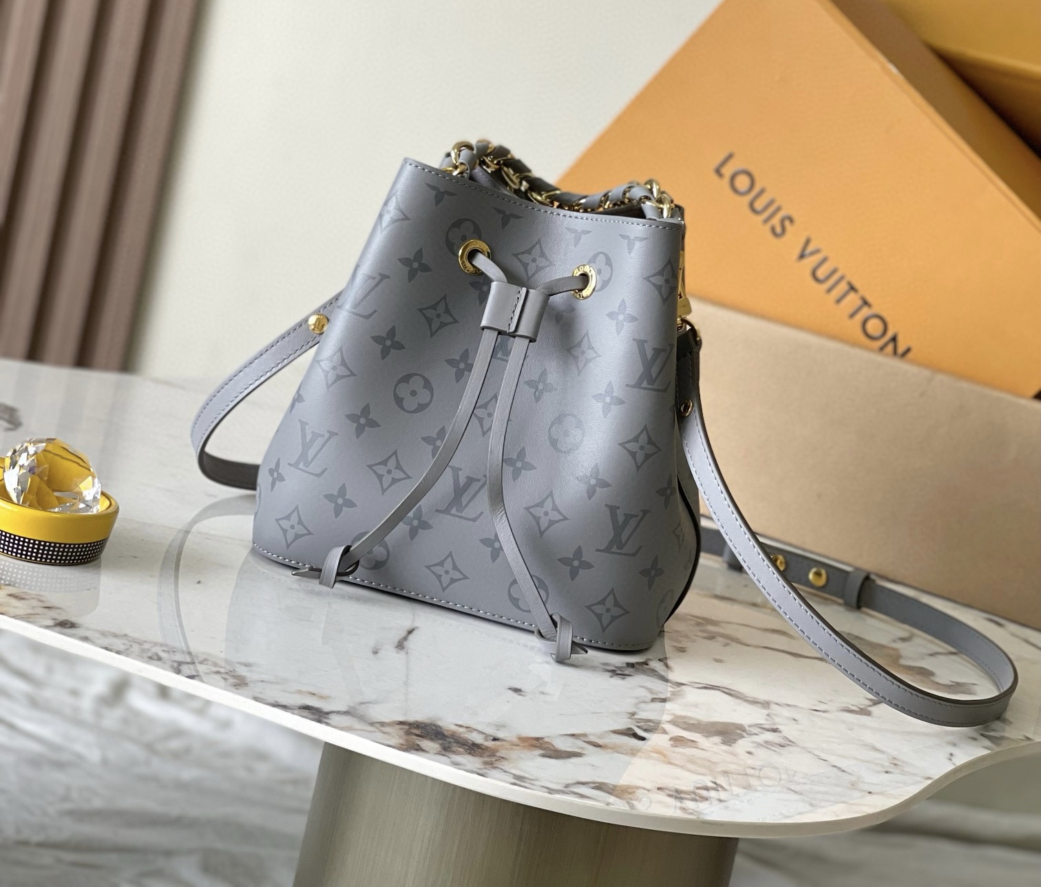 LV Néonoé BB Handbag features a new spring color, with Monogram Empreinte cowhide leather embossed with LV letters and Monogram flowers. The bright lining and central clasp compartment highlight the exquisite details.