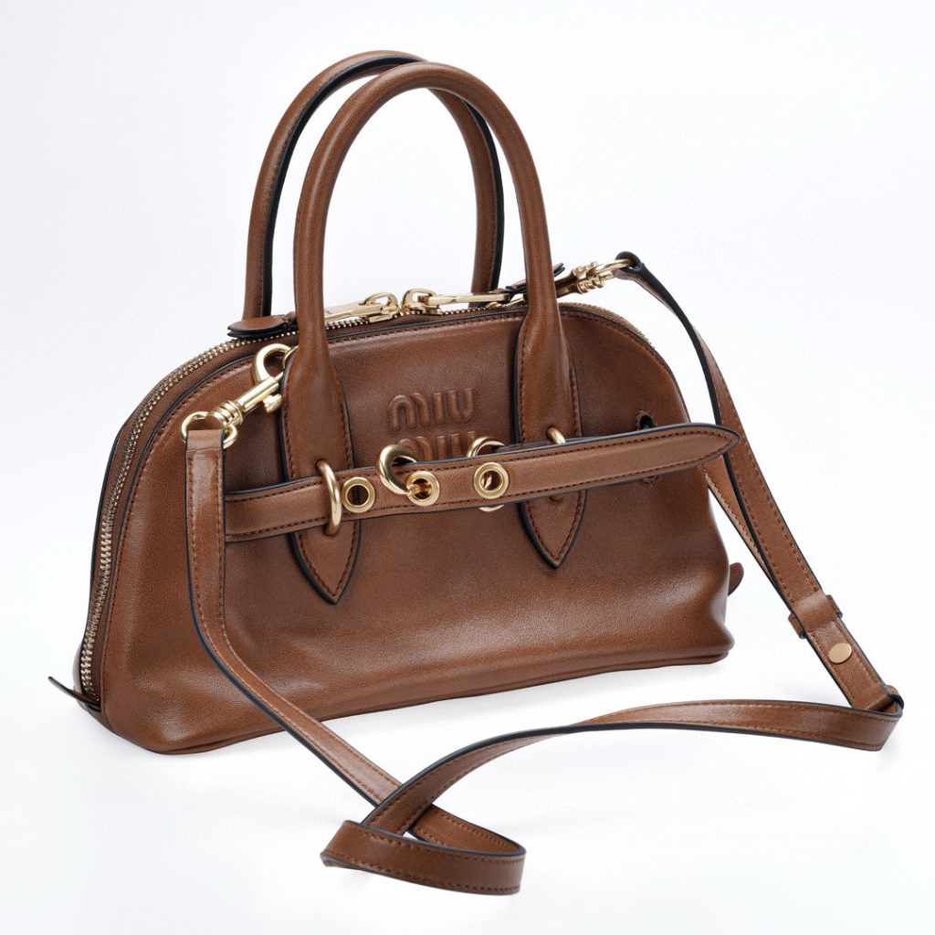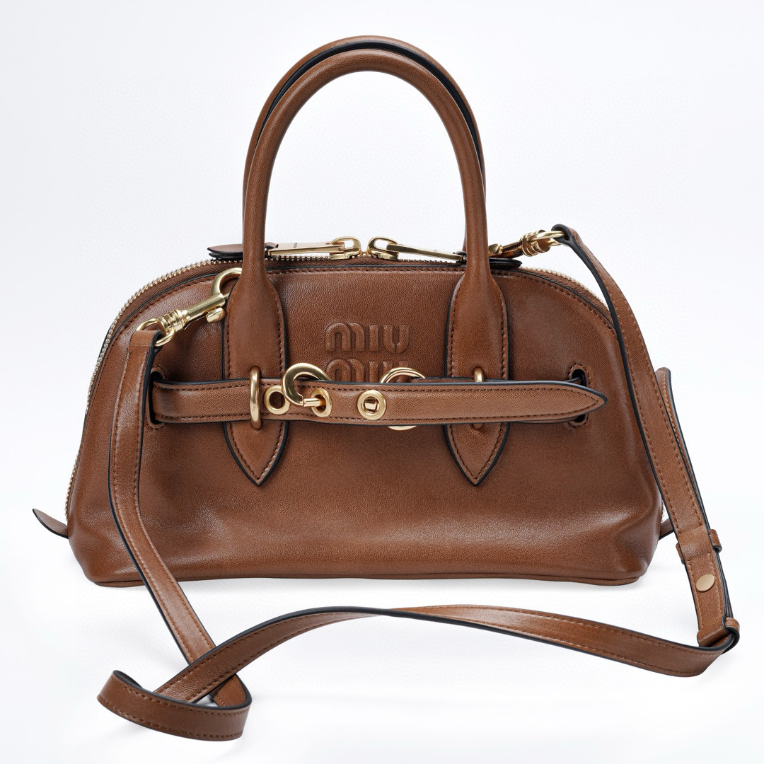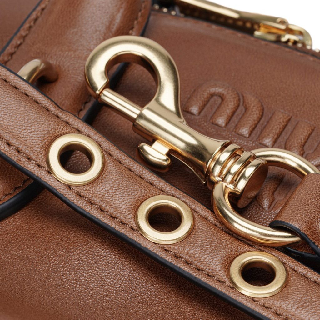 Experience the luxury of MIU MIU’s Aventure tote, crafted from soft Nappa lambskin. Its shell-like shape with a two-way zipper blends vintage style with practicality. The belt detail adds a unique touch, elevating the bag’s premium feel.