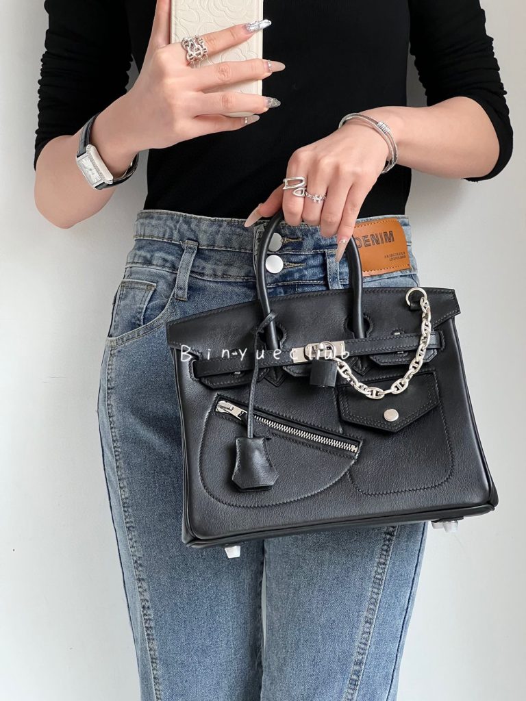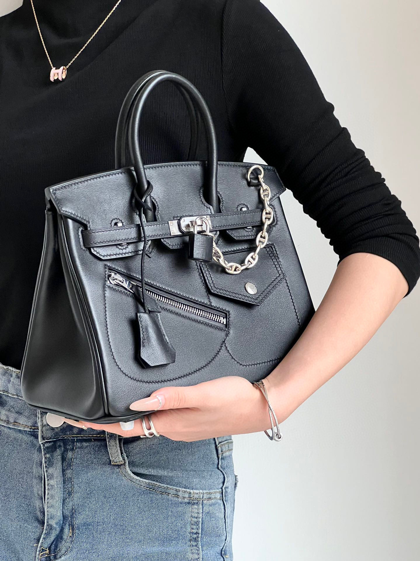 The new Birkin and Haut à Courroies bags draw inspiration from motorcycle jackets, exuding a pure black rock ‘n’ roll style: smooth, soft leather, exterior pockets, chaîne d’ancre anchor chain handles, and leather-covered padlock, a cool and unmistakable rock vibe.